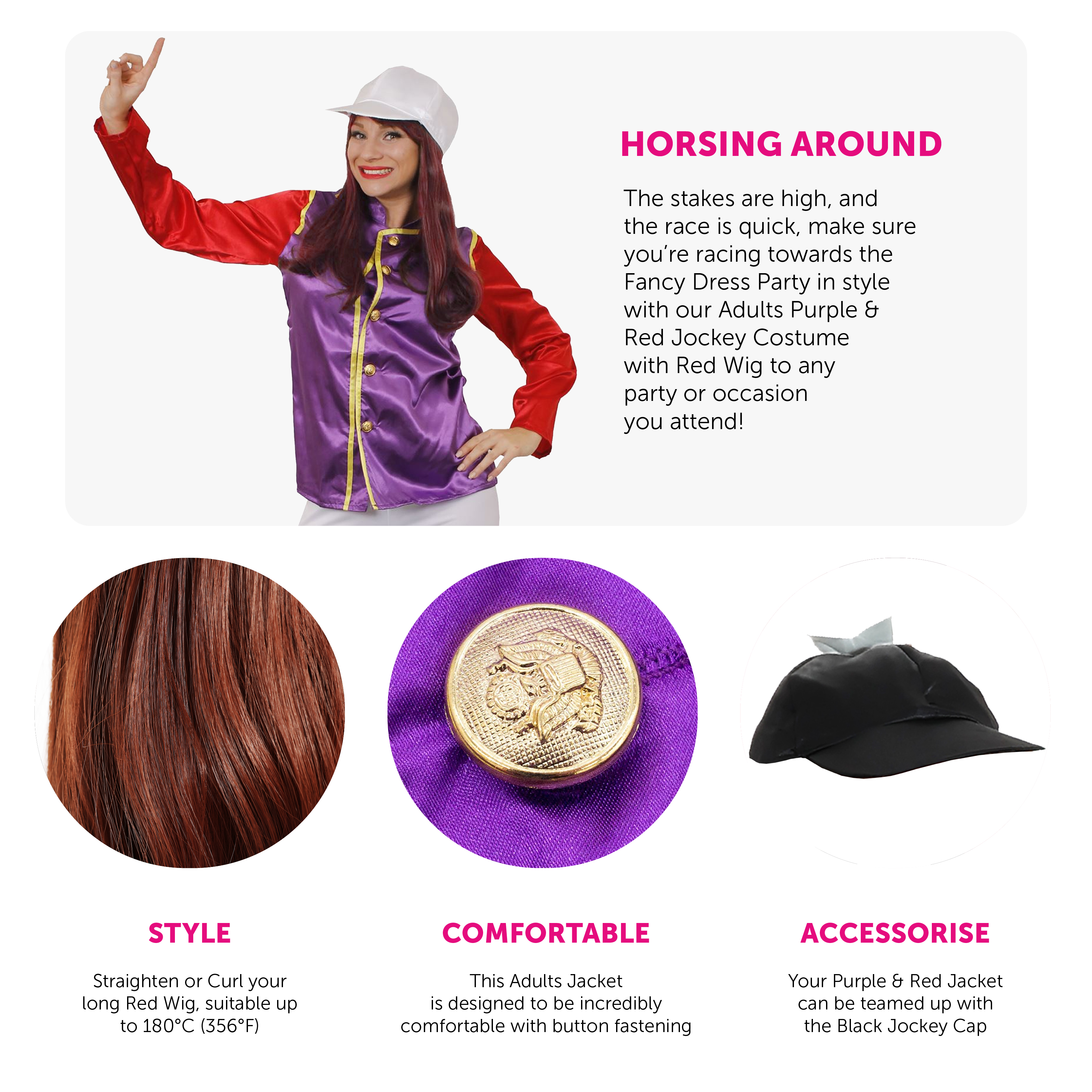 COSTUME INCLUDES: This Adults Jockey Costume includes a Purple and Red satin-look Jockey Jacket, White Trousers, a White Jockey Hat, Black Boot Covers, and a Long Red Heat and Style Wig, the perfectly compact set for any rider looking to travel light!