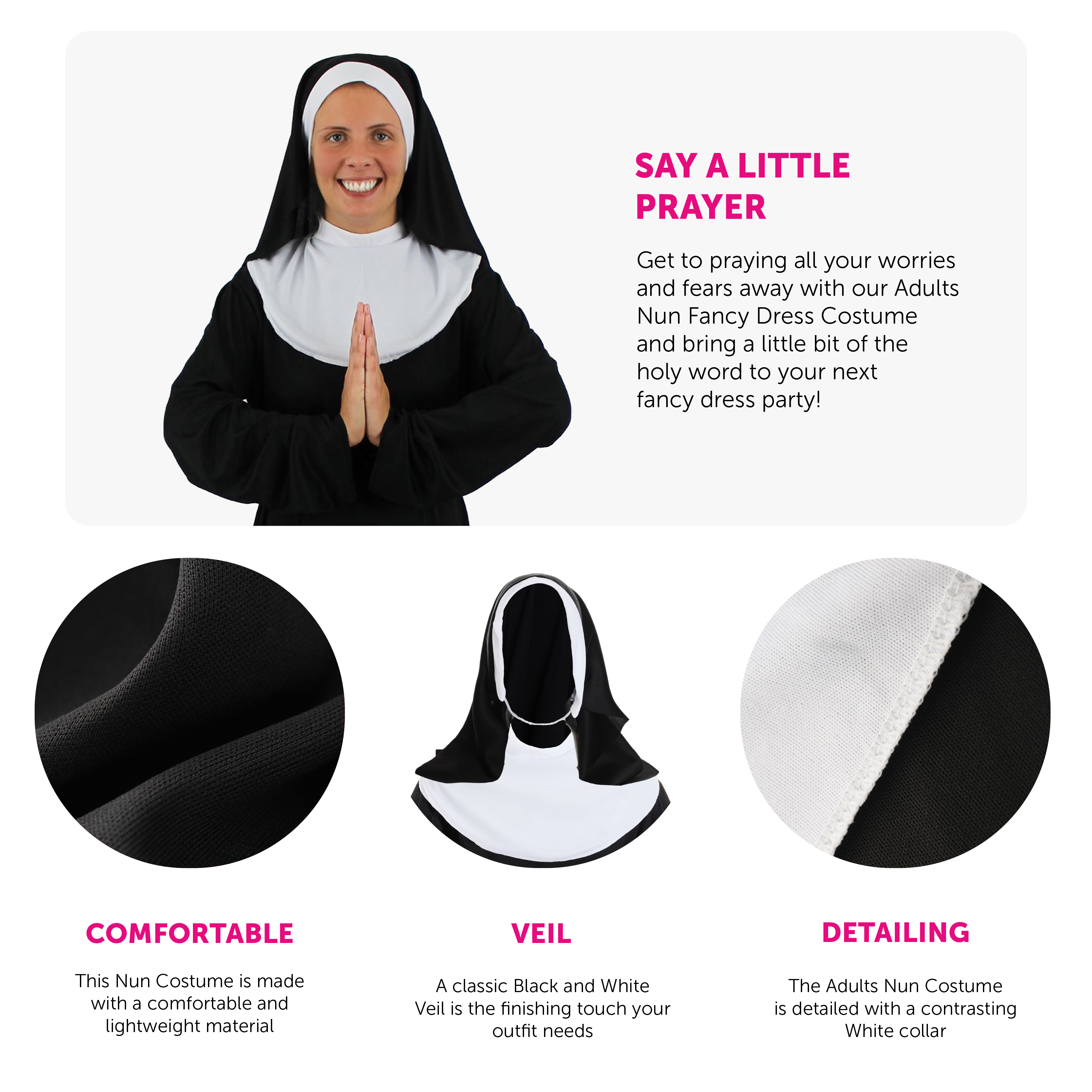 COSTUME INCLUDES: Your Adults Nun Costume includes a Black Long Loose-Fitting Tunic with White Nun Collar, a Black Belt, and a Black Cowl for you to look like the real deal at the next fancy dress event!