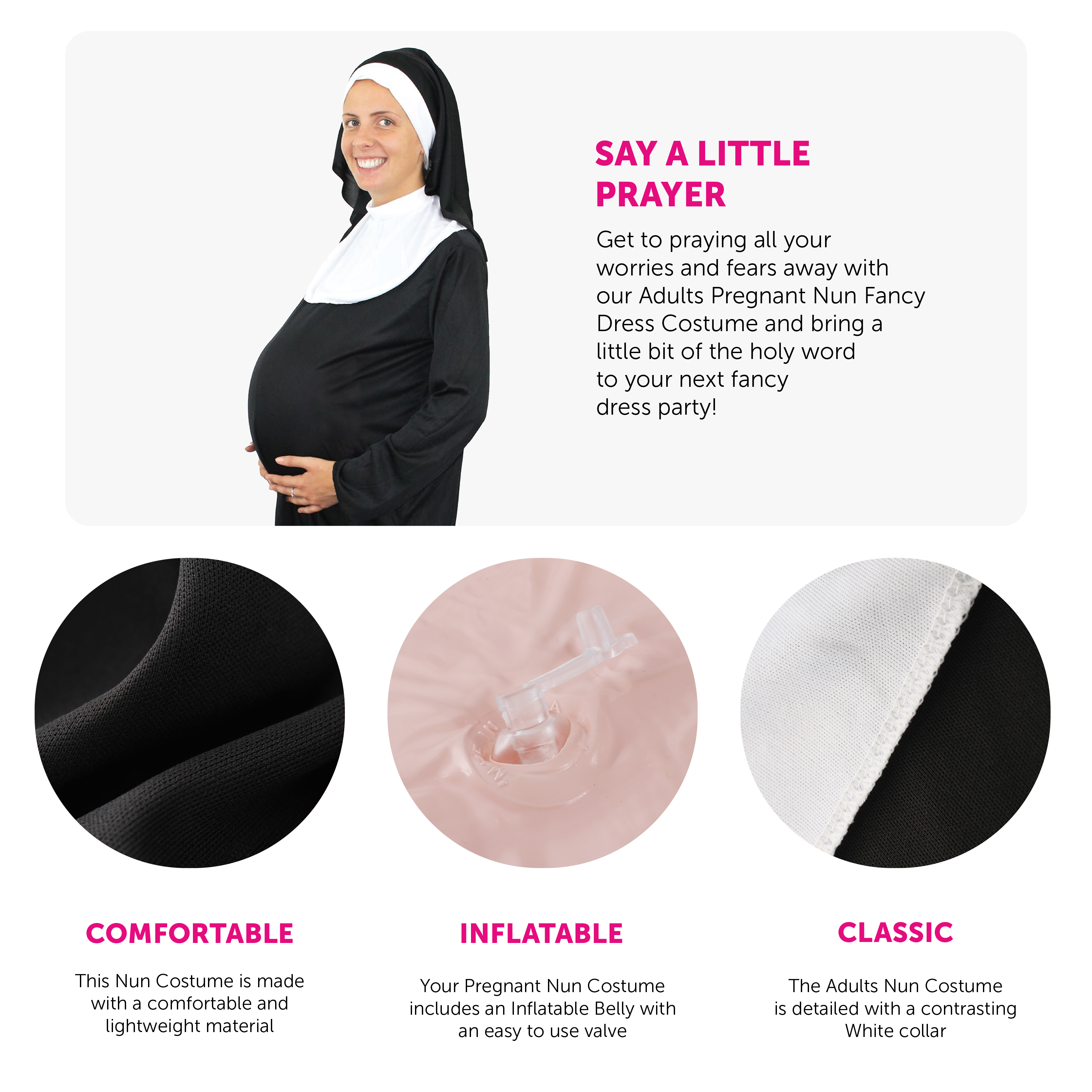 COSTUME INCLUDES: Your Adults Pregnant Nun Costume includes a Black Long loose-fitting Tunic with White Nun Collar, a Black Belt, a Black Cowl, and an Inflatable Belly with an easy to use valve, for you to look like the real deal at the next fancy dress event!