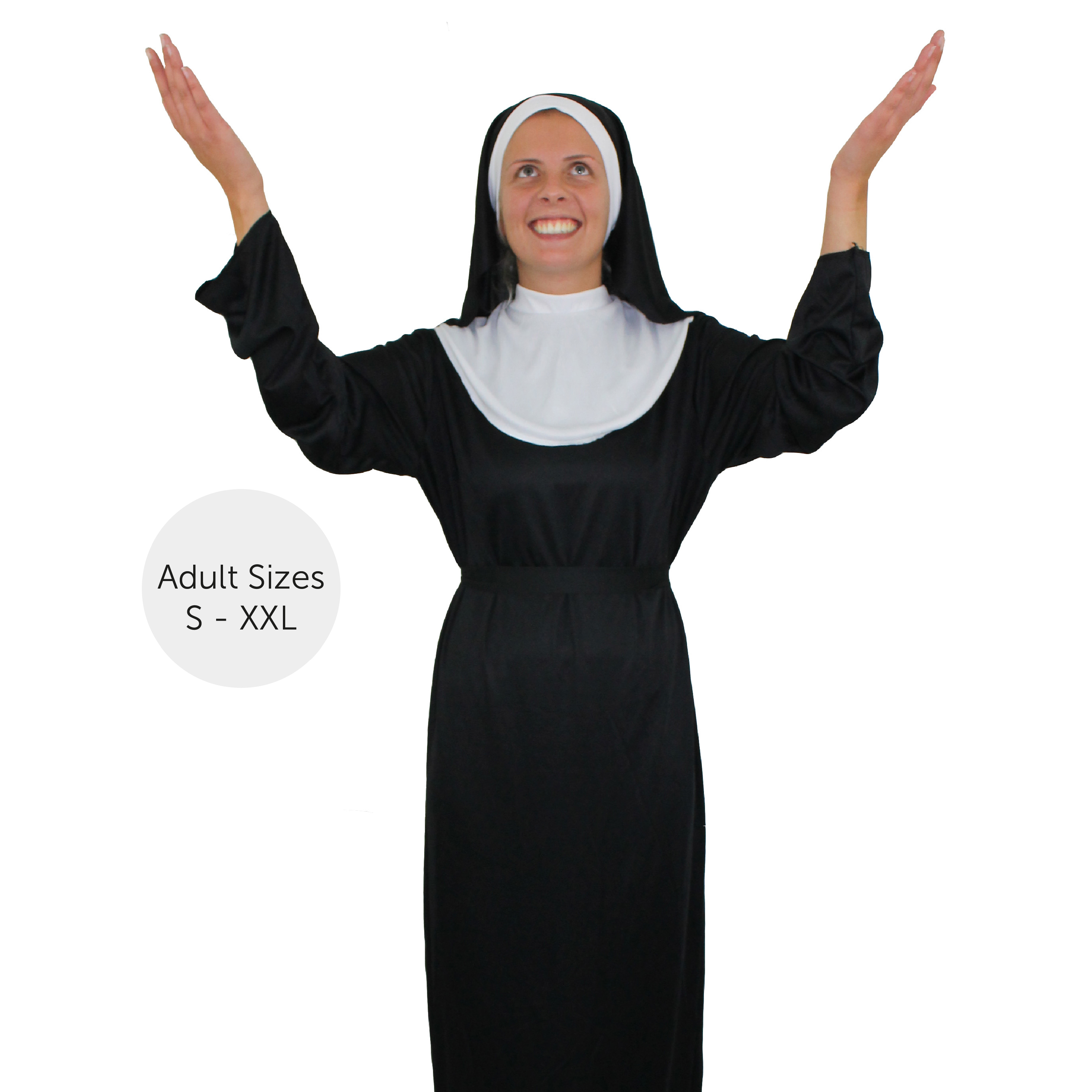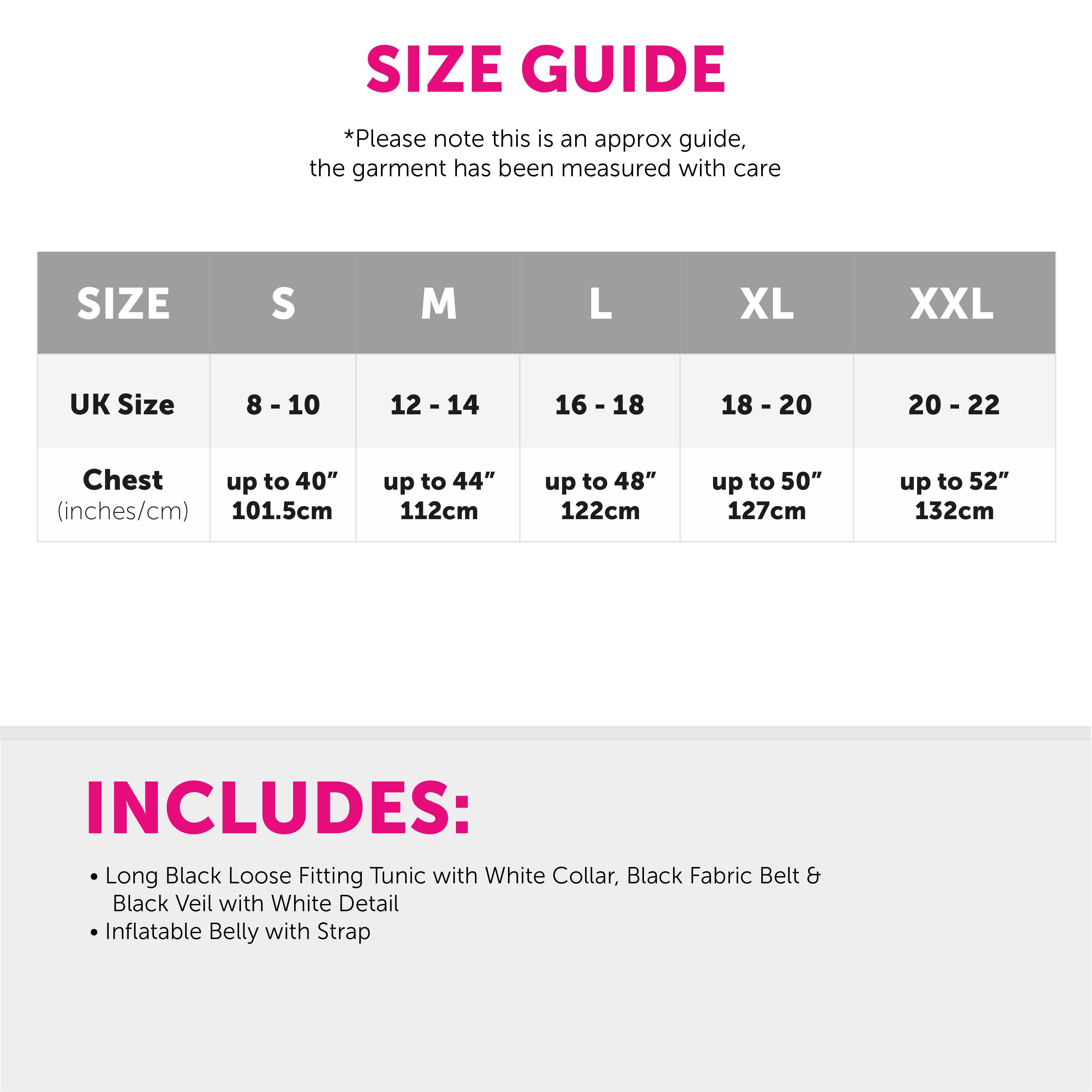 AVAILABLE IN MULTIPLE SIZES: Your Adults Pregnant Nun Costume is unisex and is available in sizes Small to XX-Large: Small (UK Size 8 - 10) Chest up to 40" (101.5cm) | Medium (UK Size 12 - 14), Chest up to 44" (112cm) | Large (UK Size 16 - 18), Chest up to 48" (122cm) | X Large (UK Size 18 - 20), Chest up to 50" (127cm) | XX Large (UK Size 20 - 22), Chest up to 52" (132cm)