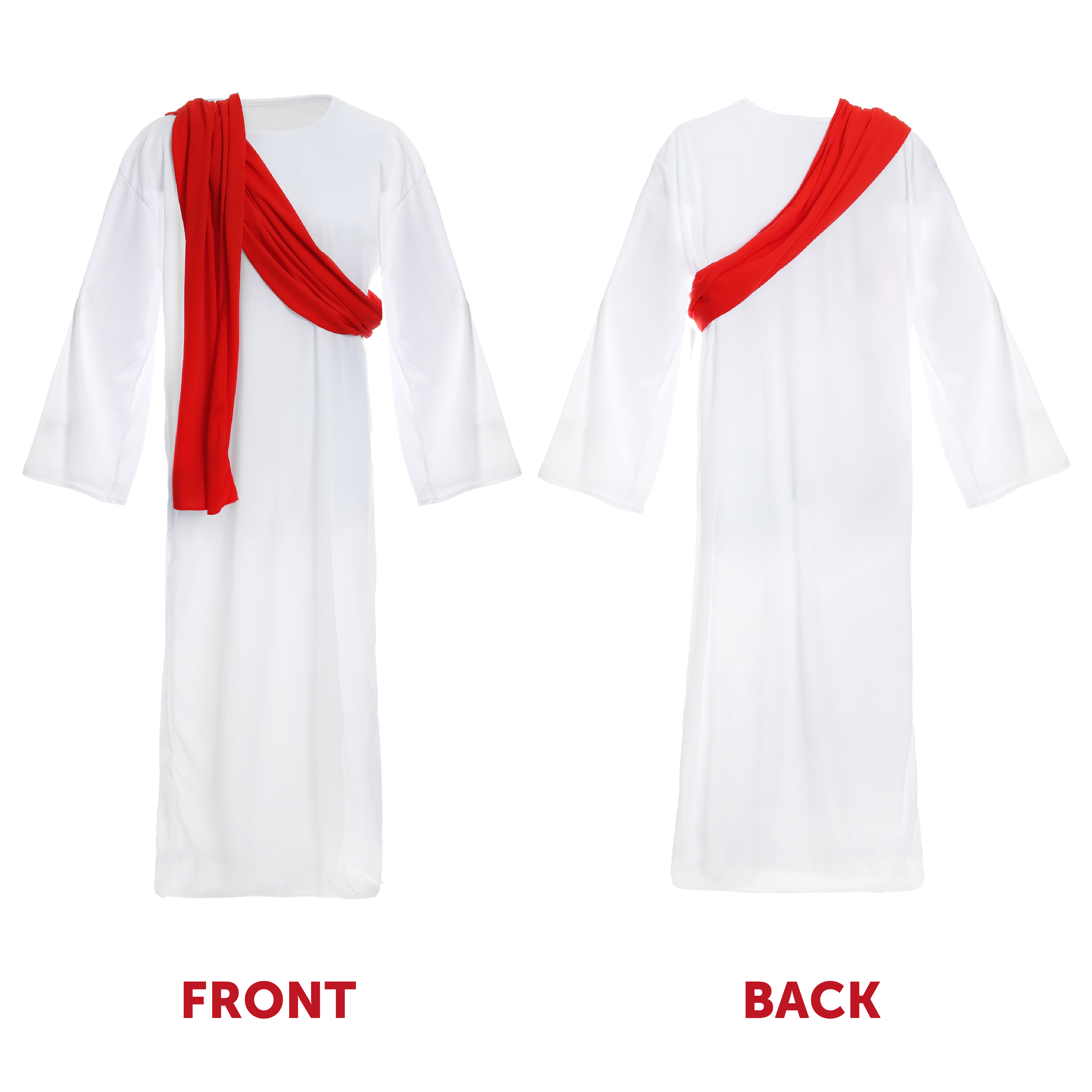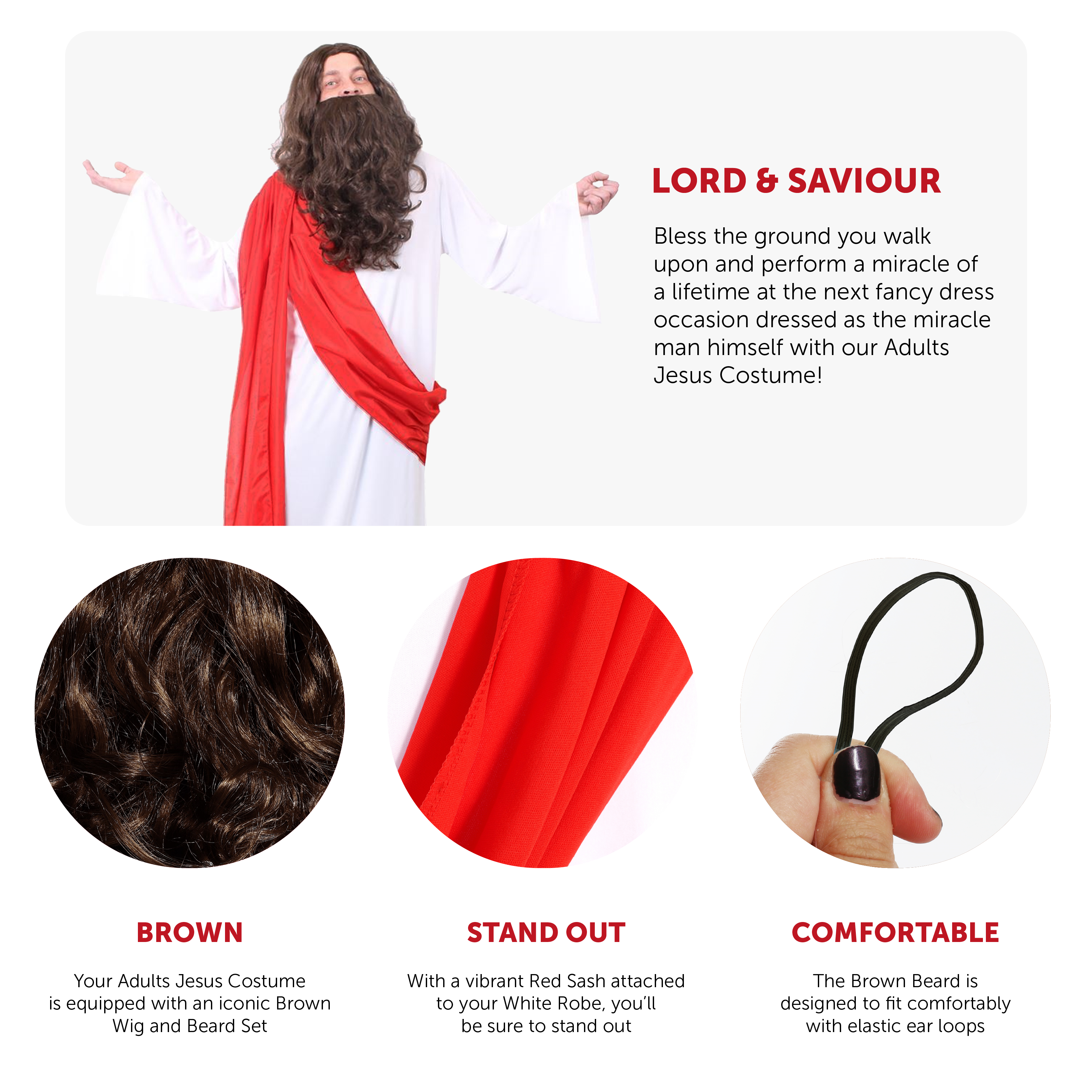 COSTUME DETAILS: Your Adults Jesus Costume includes a Long Sleeved White Robe with an attached Red Sash wrapped around, and a Brown Wig and Beard Set, the perfect look for any fancy dress and Christmas event this year!