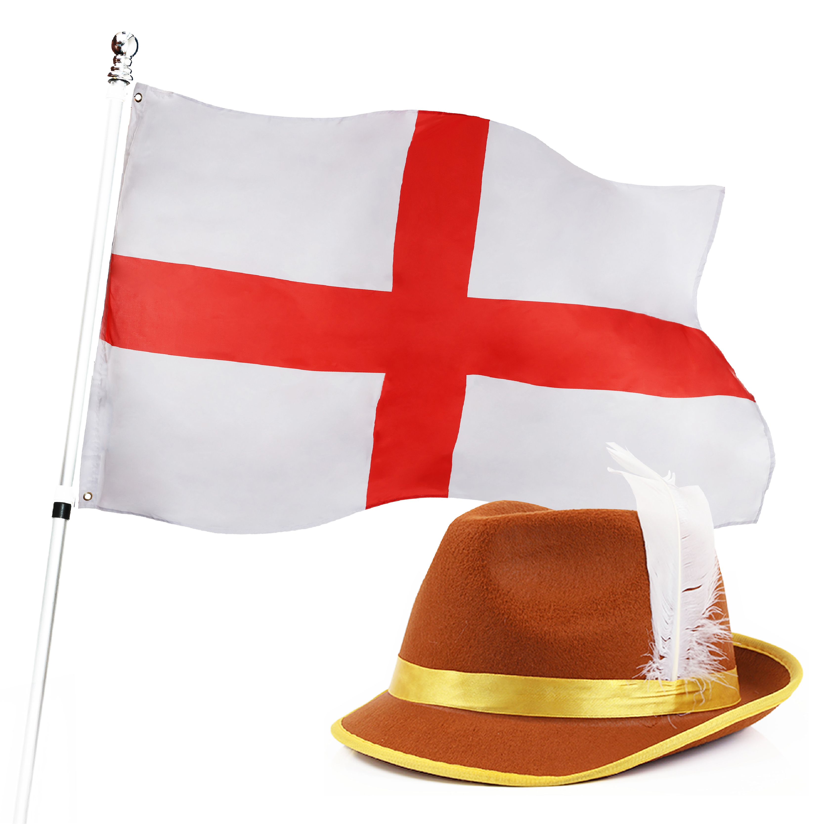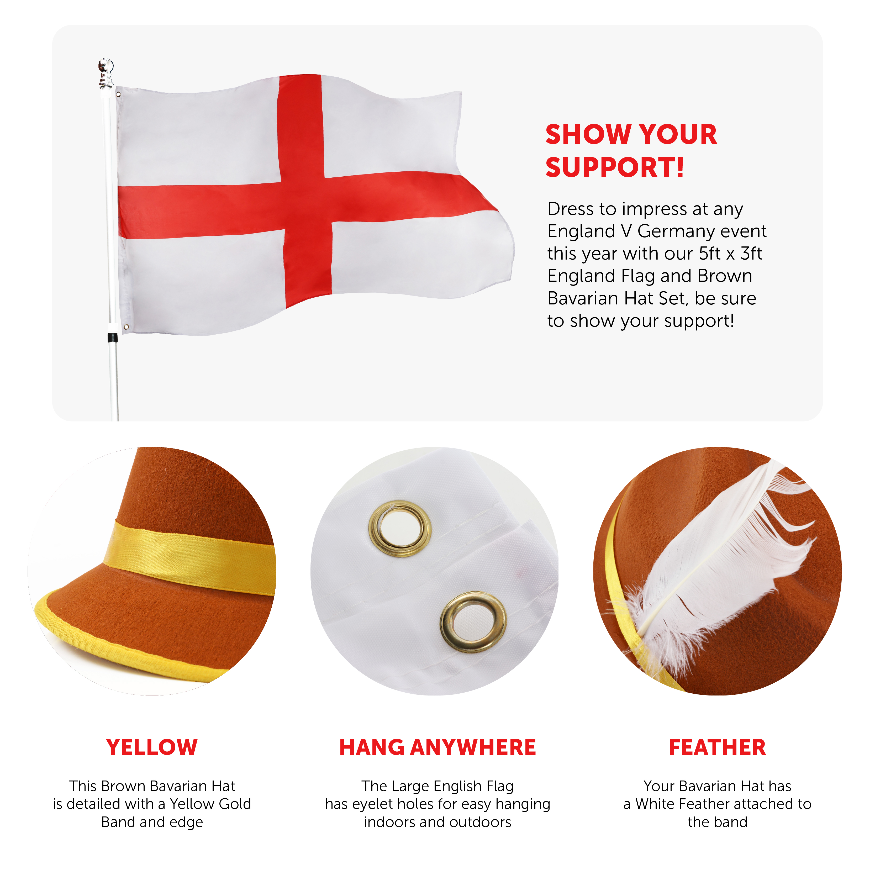 5FT X 3FT ENGLAND FLAG & BROWN BAVARIAN HAT: Dress to impress at any England V Germany event this year with our 5ft x 3ft England Flag and Brown Bavarian Hat Set, be sure to show your support!