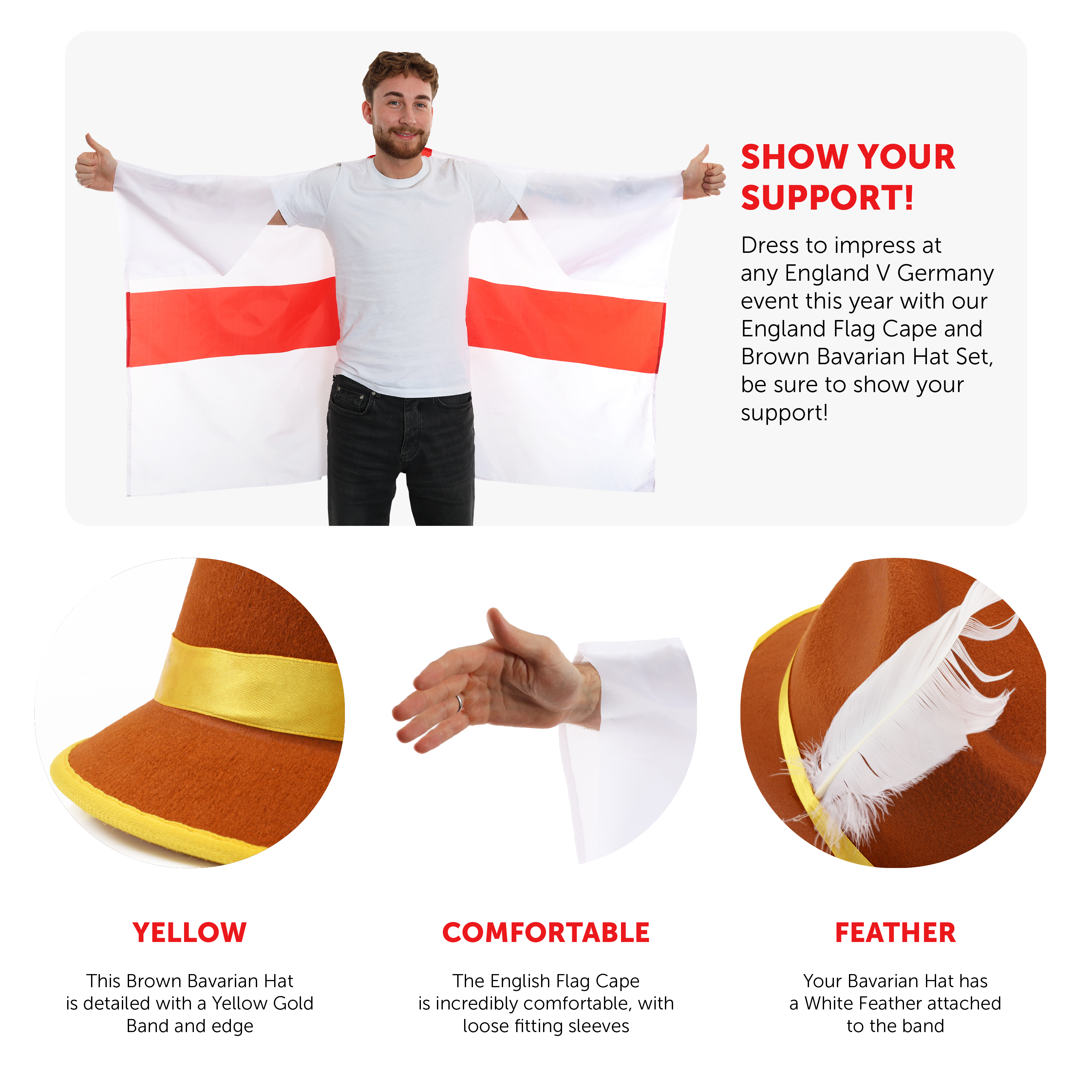 ENGLAND FLAG CAPE & BROWN BAVARIAN HAT: Dress to impress at any England V Germany event this year with our England Flag Cape and Brown Bavarian Hat Set, be sure to show your support!