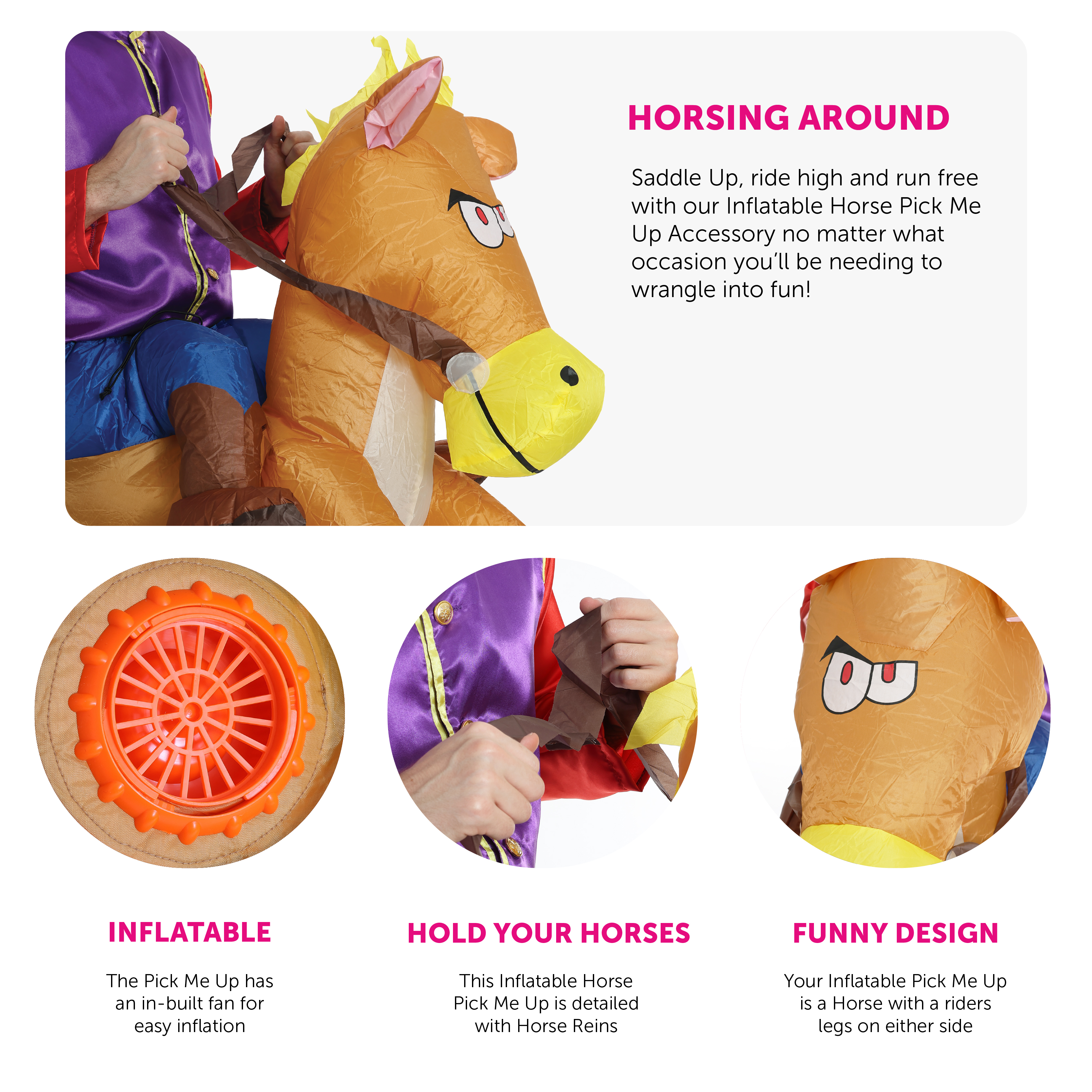 INFLATABLE HORSE PICK ME UP: Saddle Up, ride high and run free with our Inflatable Horse Pick Me Up Accessory no matter what occasion you’ll be needing to wrangle into fun!