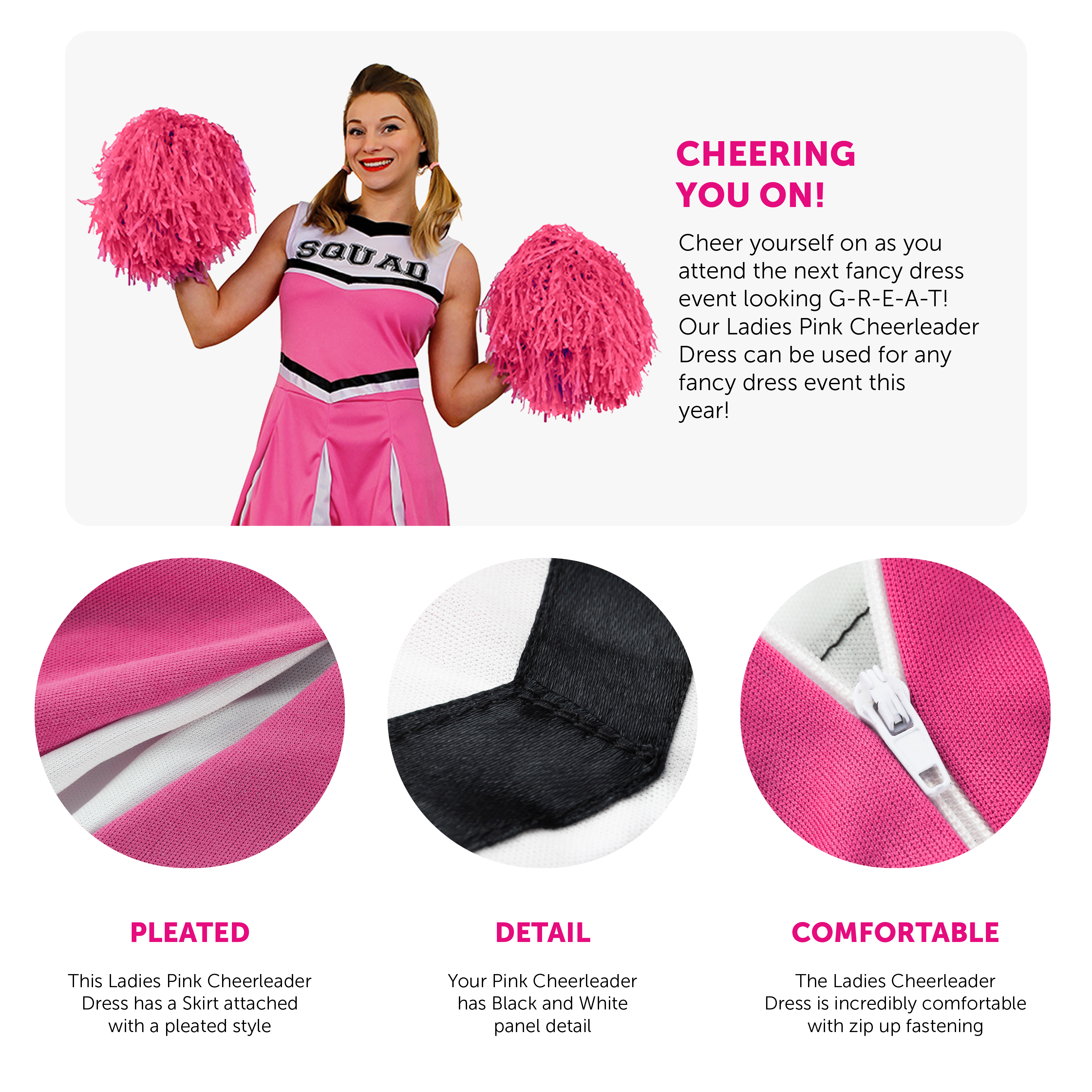 COSTUME INCLUDES: Your Ladies Cheerleader Costume is a bright Pink Short Dress with a Pleated Skirt, Black and White panelling, and 'SQUAD' Printed on the front in a Large Black Font, the perfect Costume for any fancy dress event!