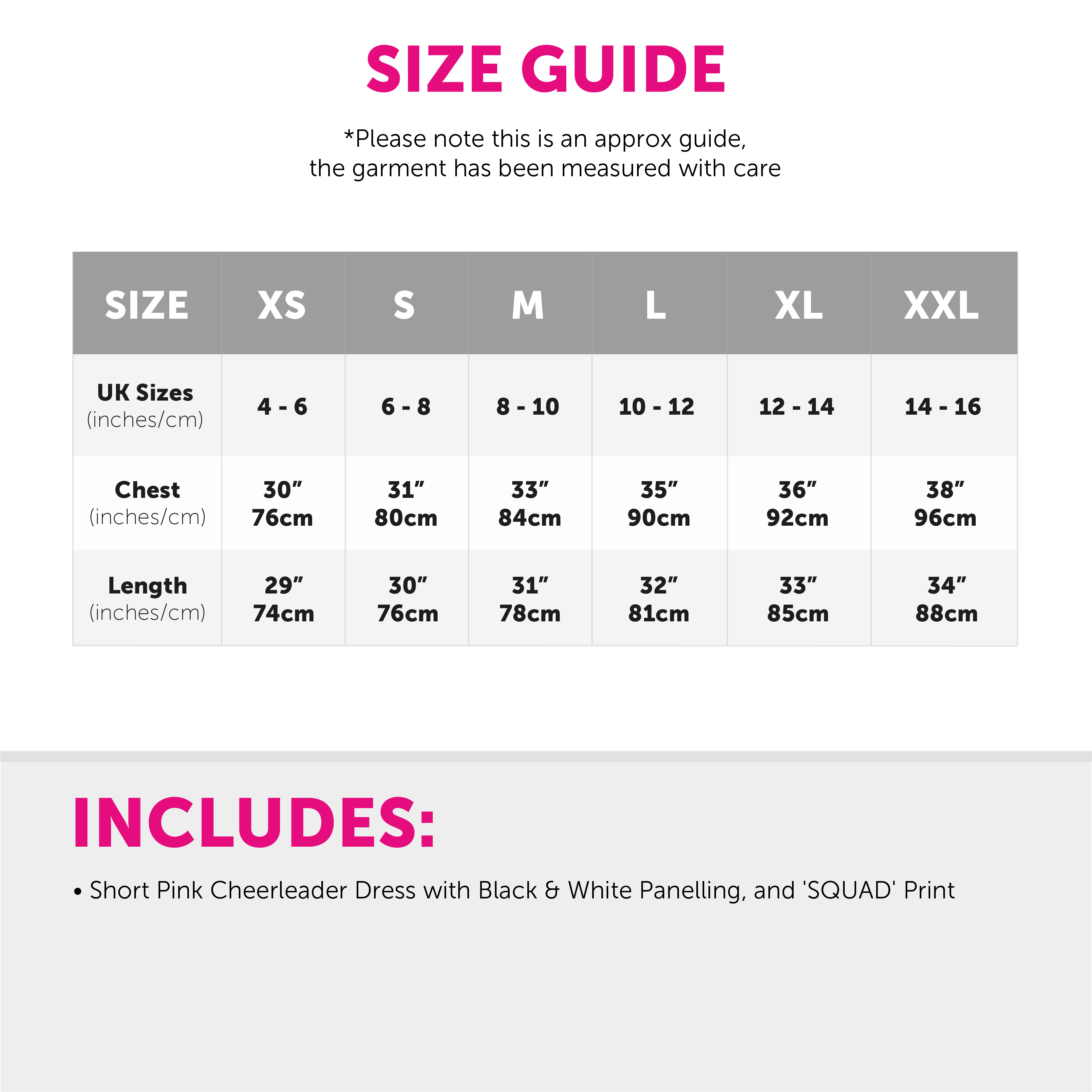 AVAILABLE IN MULTIPLE SIZES: Your Ladies Pink Cheerleader Costume is available in multiple sizes, X-Small - XX-Large: X-Small - (UK 4 - 6), Chest 30" (76cm), Length 29" (74cm) | Small - (UK 6 - 8), Chest 31" (80cm), Length 30" (76cm) | Medium - (UK 8 - 10), Chest 33" (84cm), Length 31" (78cm) | Large - (UK 10 - 12), Chest 35" (90cm), Length 32" (81cm) | X-Large - (UK 12 - 14), Chest 36" (92cm), Length 33" (85cm) | XX-Large - (UK 14 - 16), Chest 38" (96cm), Length 34" (88cm)