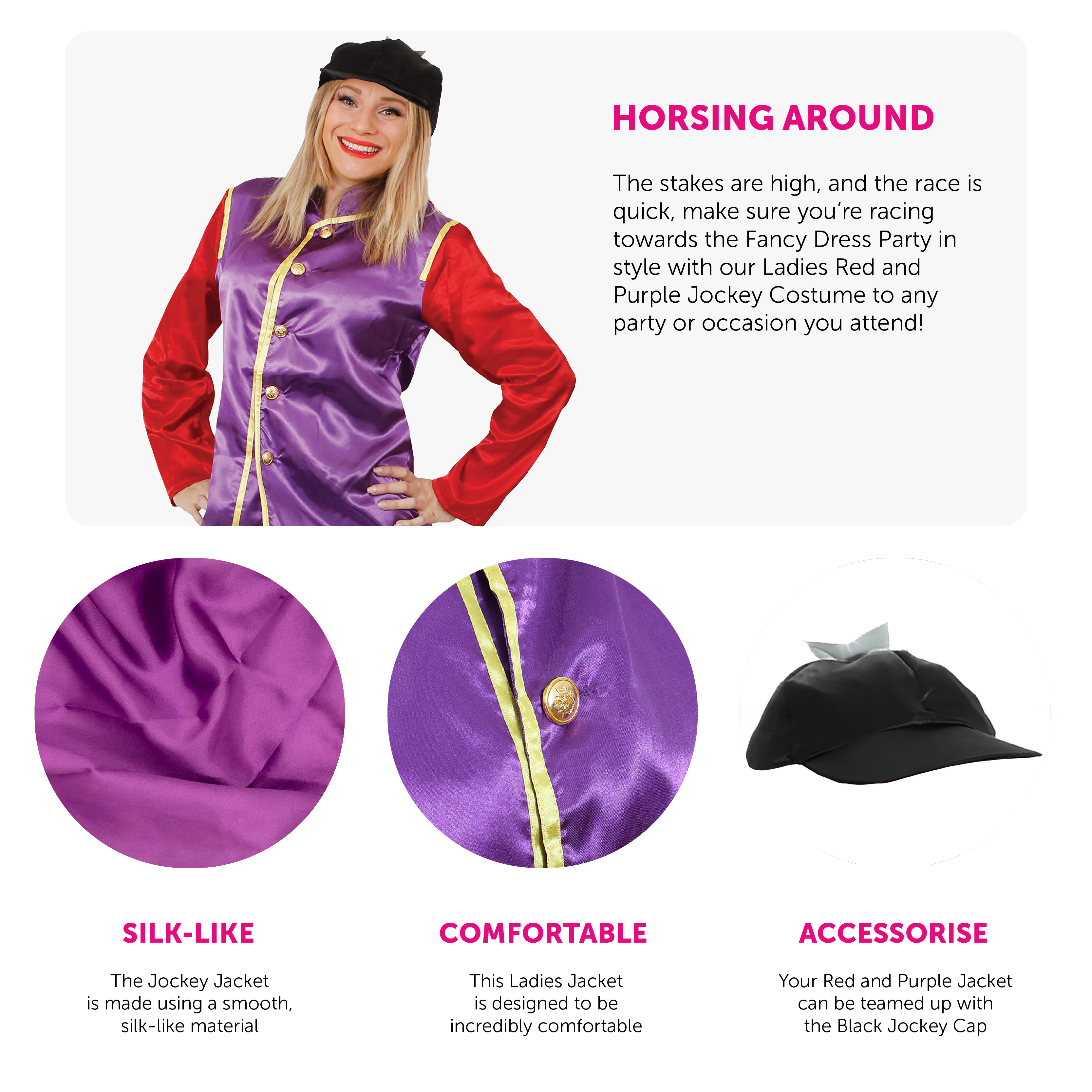 PERFECT FOR SPORTS AND FANCY DRESS: For sporting events such as the Grand National and the Cheltenham Festival, or general fancy dress events, you’re in for a night full of fun with our Adults Red and Purple Jockey Costume!