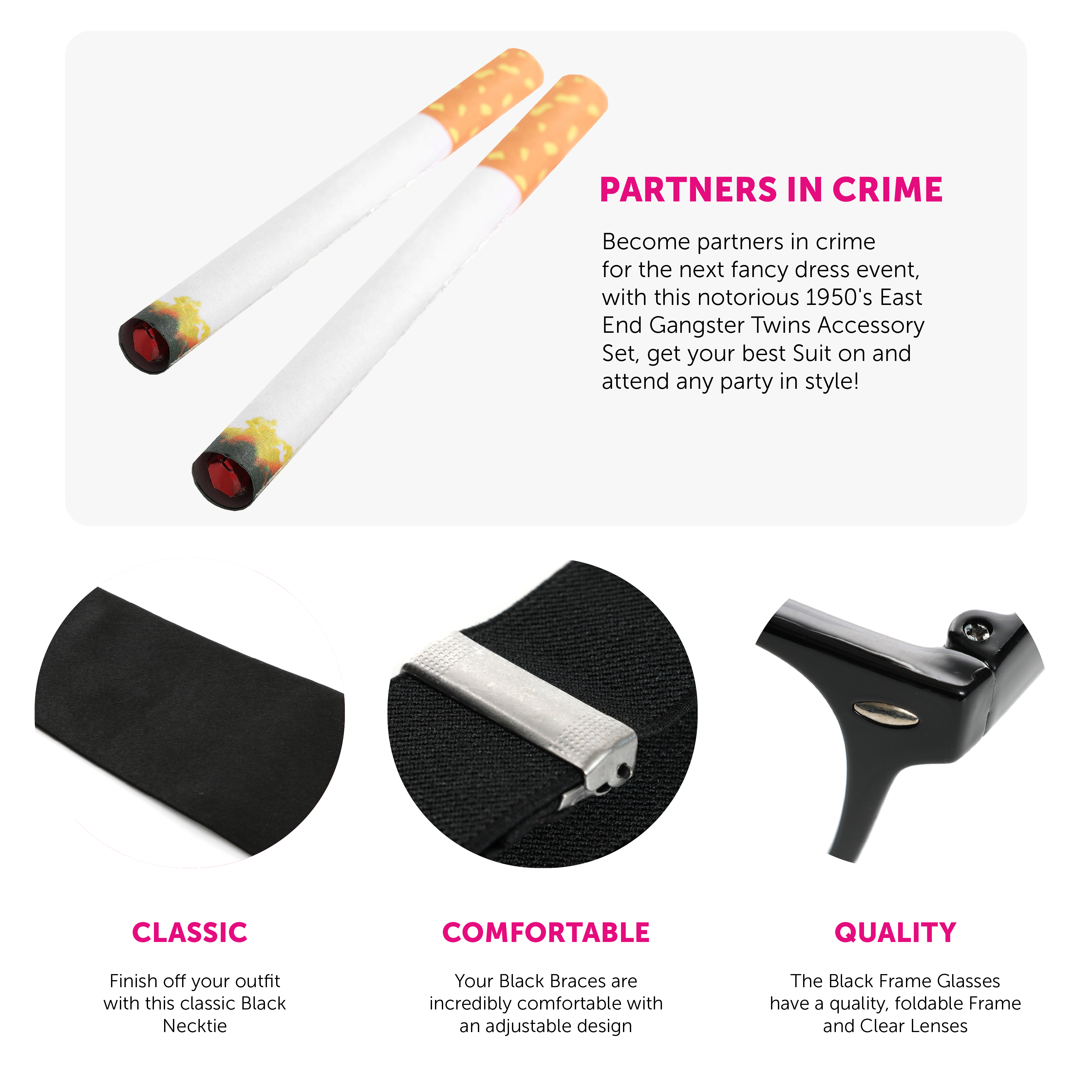 SET INCLUDES: This 1950's East End Gangster Twins Accessory Set includes Black Framed Glasses with Clear Lenses, 2x Fake Cigarettes, 2x Black Neckties, and 2x Adjustable Braces with easy to attach metal fasteners, the perfect fancy dress look for any event!