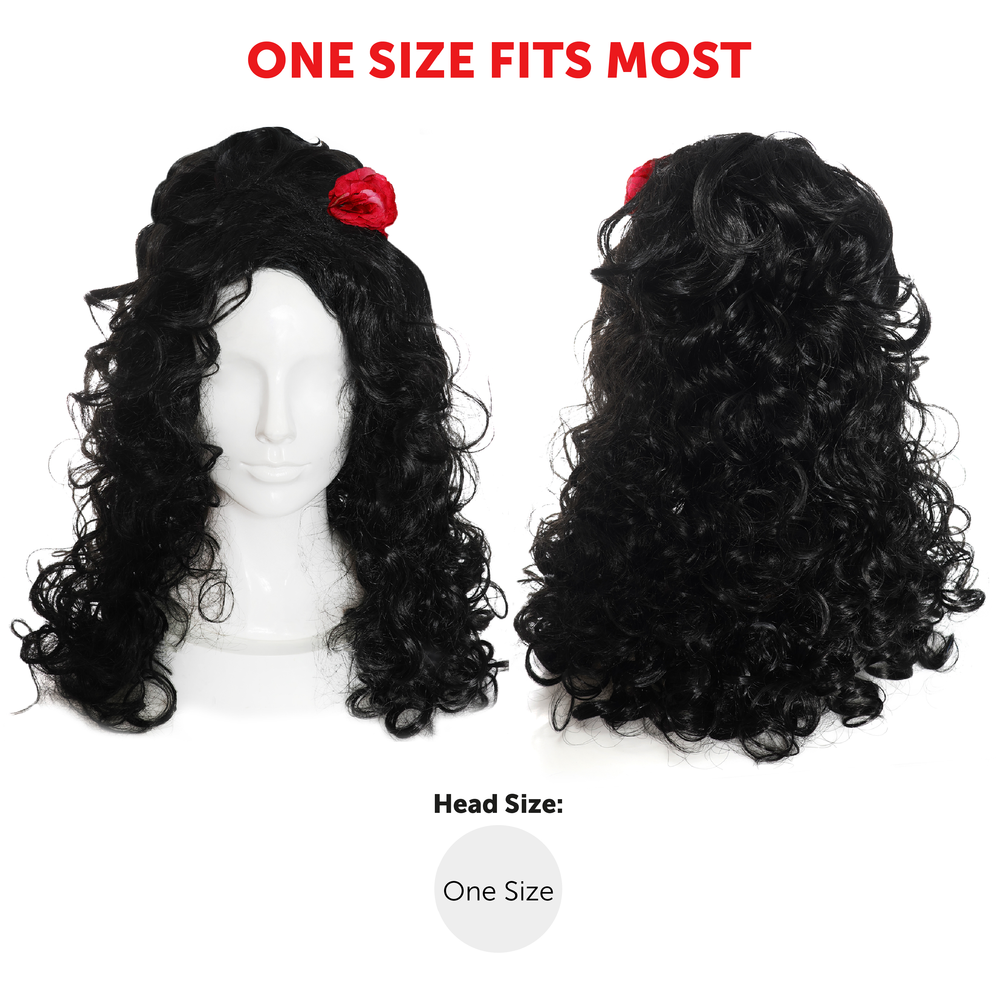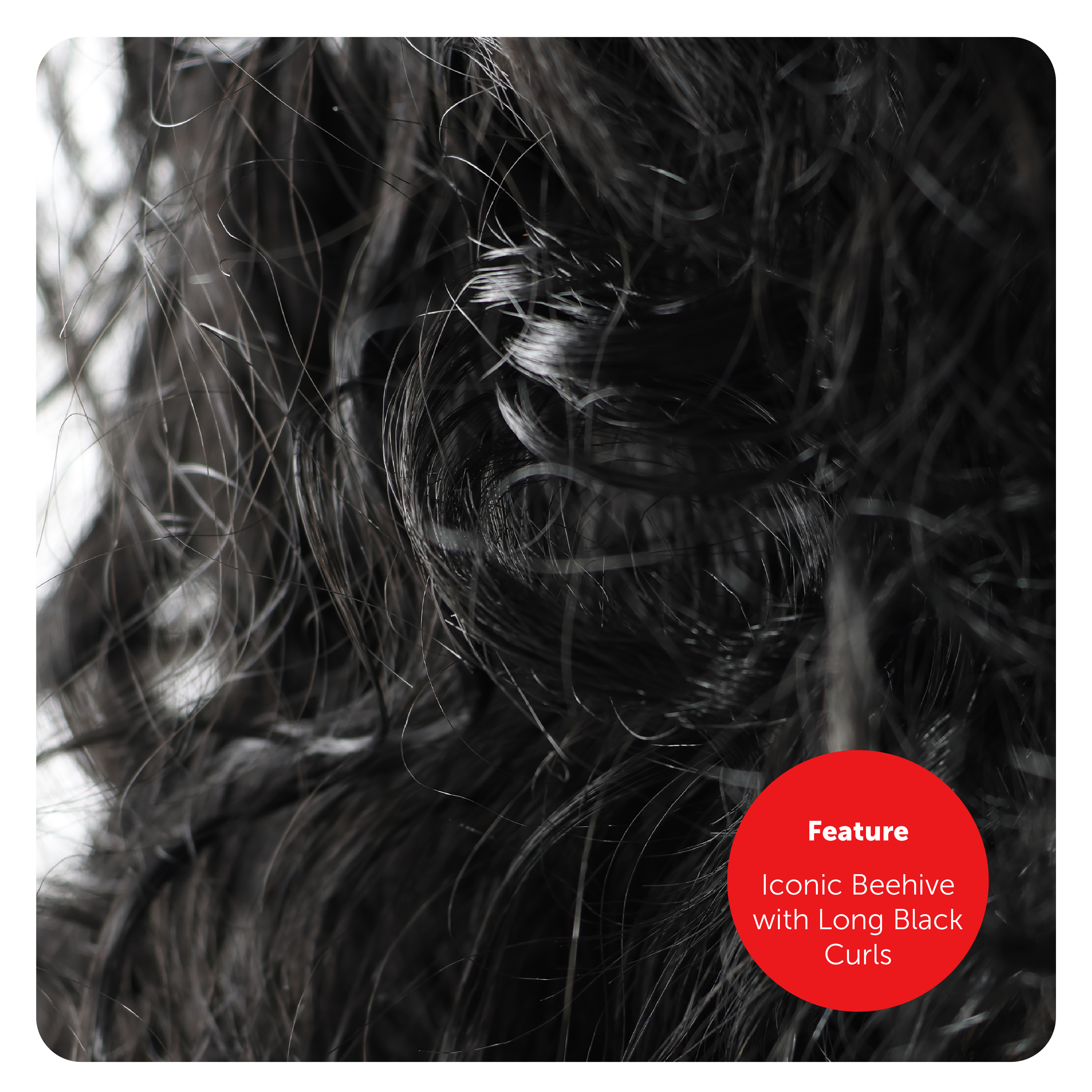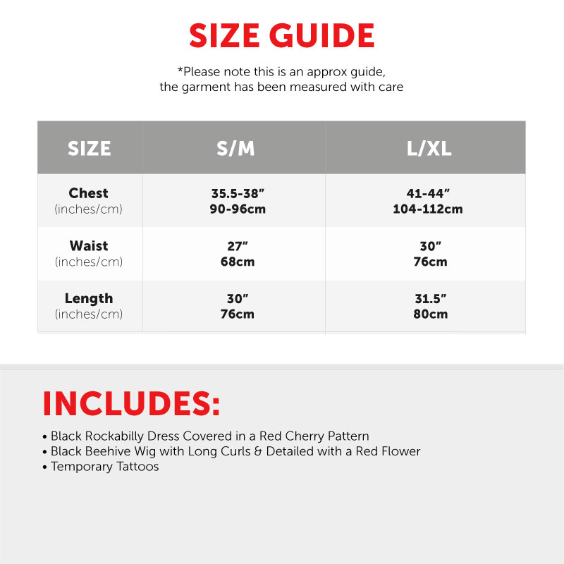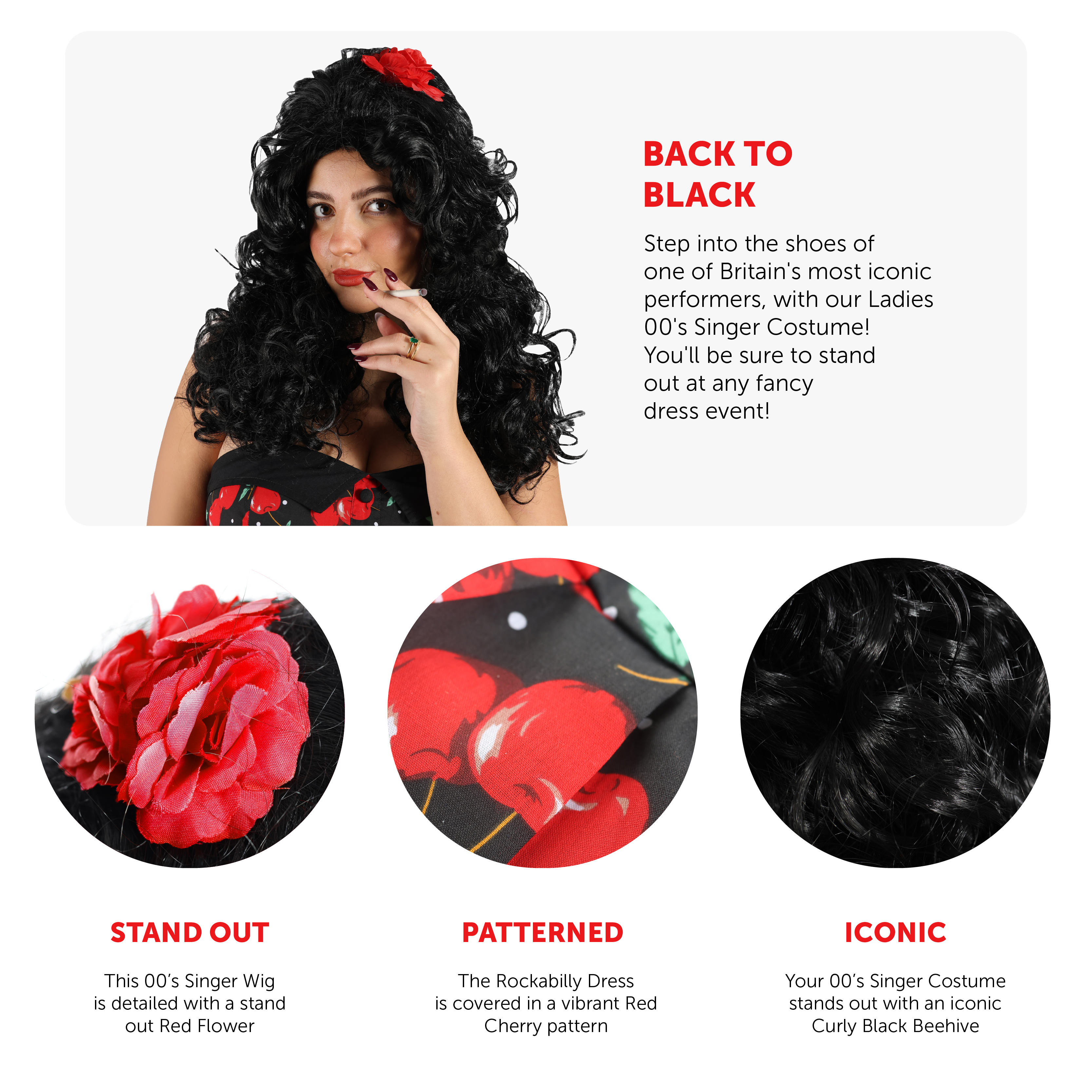 COSTUME INCLUDES: This Ladies 00's Singer Costume includes a glamorous looking Long Curly Black Wig, styled into a stand out Beehive and detailed with a Red Flower, a Black Rockabilly style Dress with Red Cherry pattern, and easy to apply Temporary Tattoos, the perfect addition to your music themed fancy dress costume!