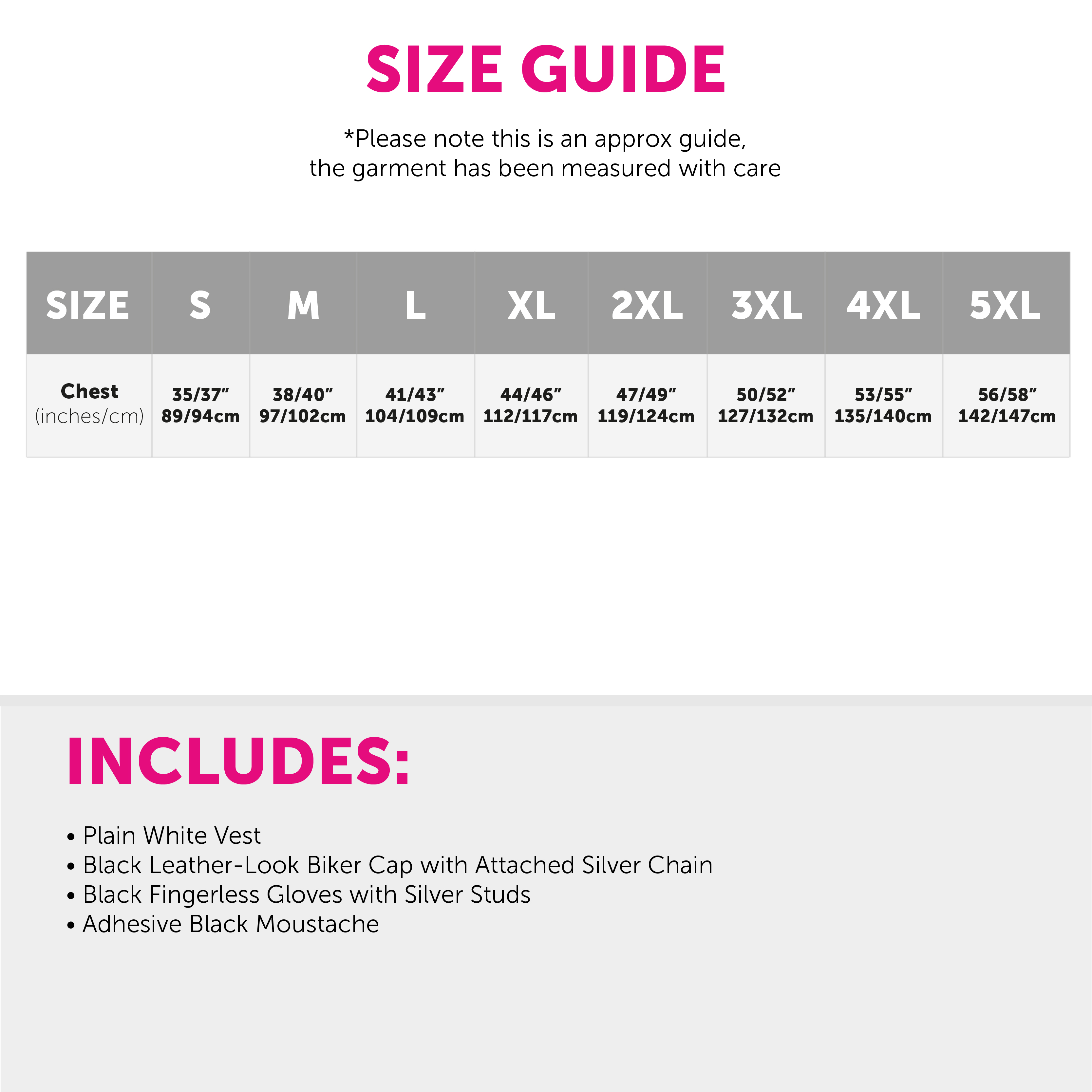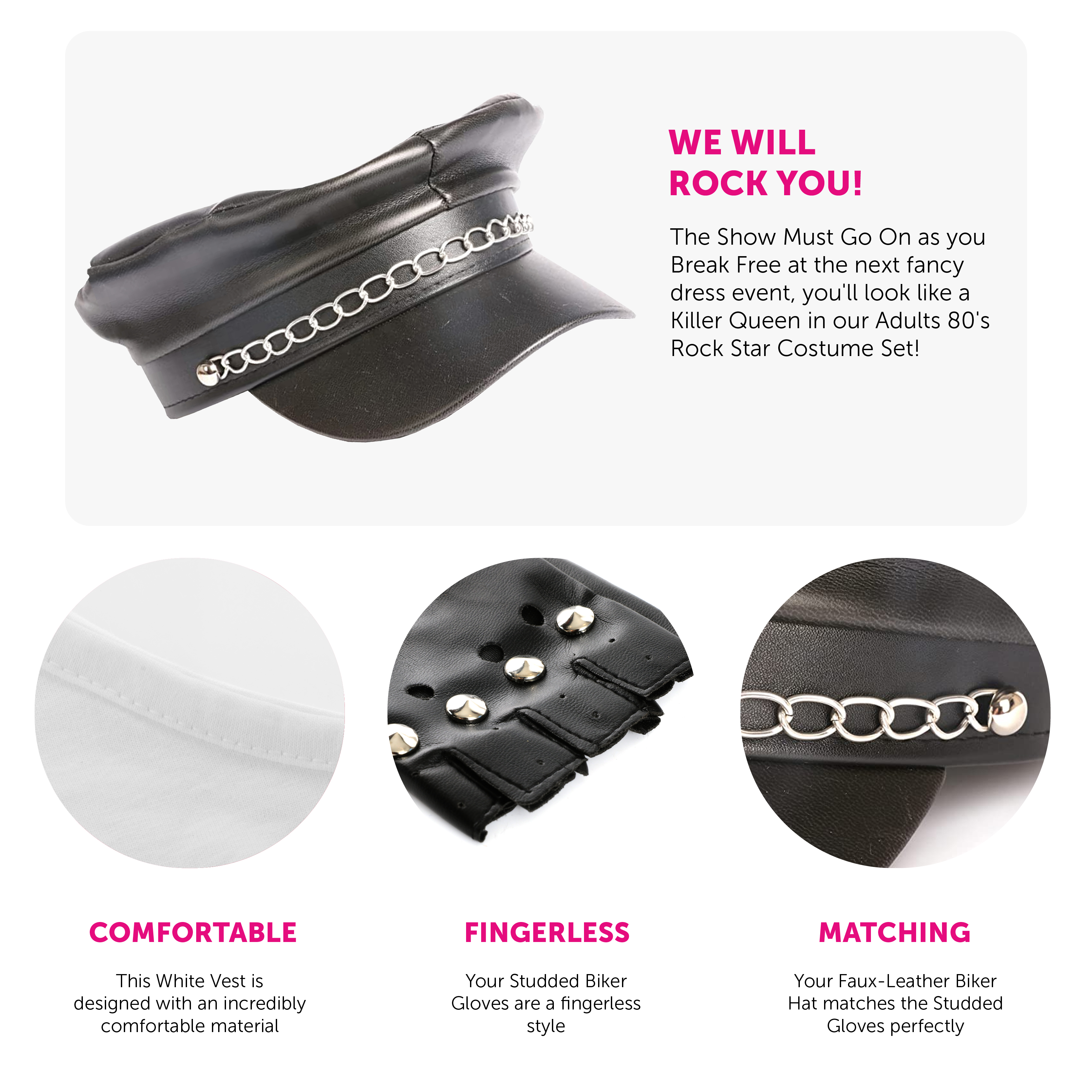 COSTUME SET INCLUDES: This 80's Rock Star Accessory Set includes a Plain White Vest, a Black Faux-Leather Biker Cap with Silver Chain detail, a Black Adhesive Moustache, and a pair of Faux-Leather Fingerless Biker Gloves - perfect for music events!