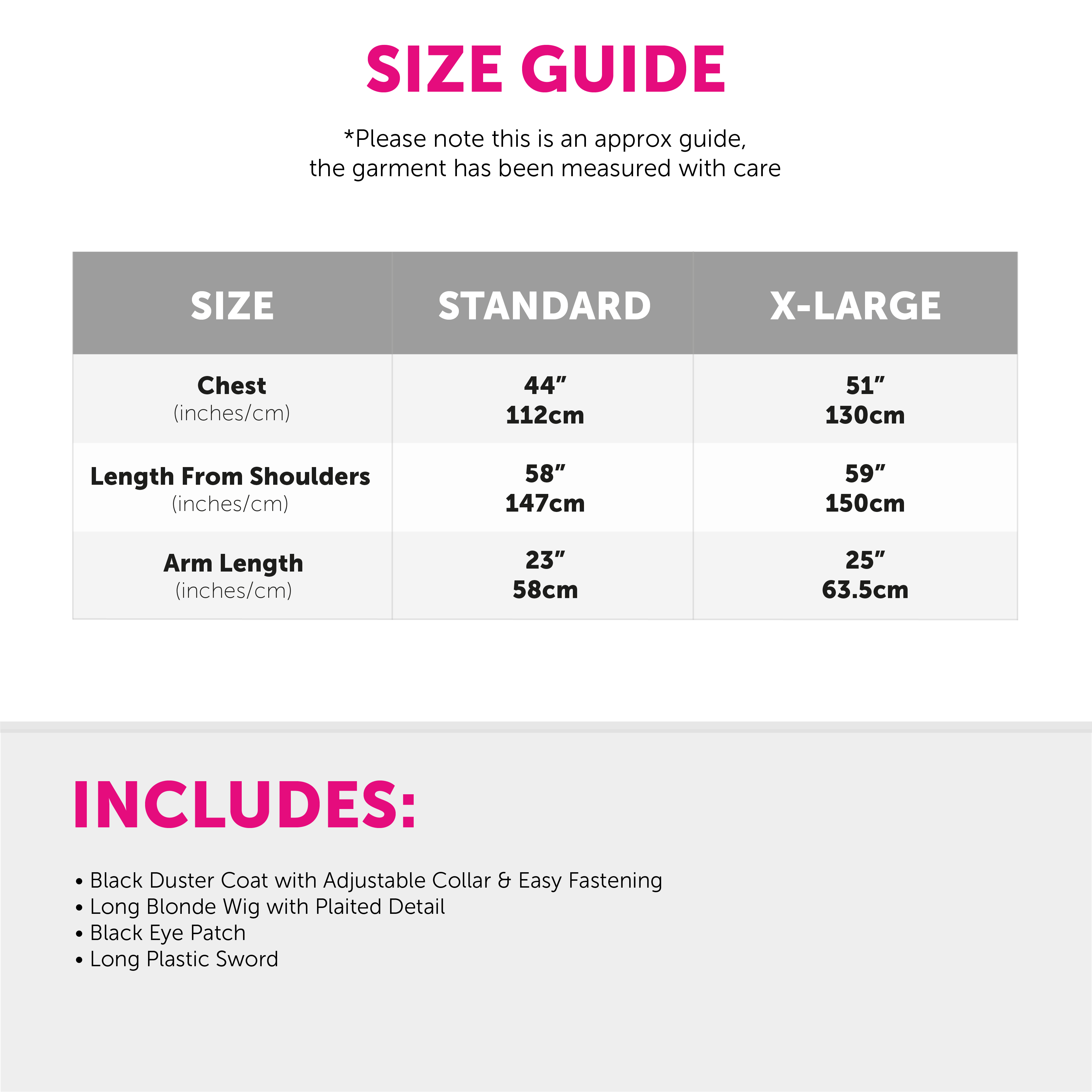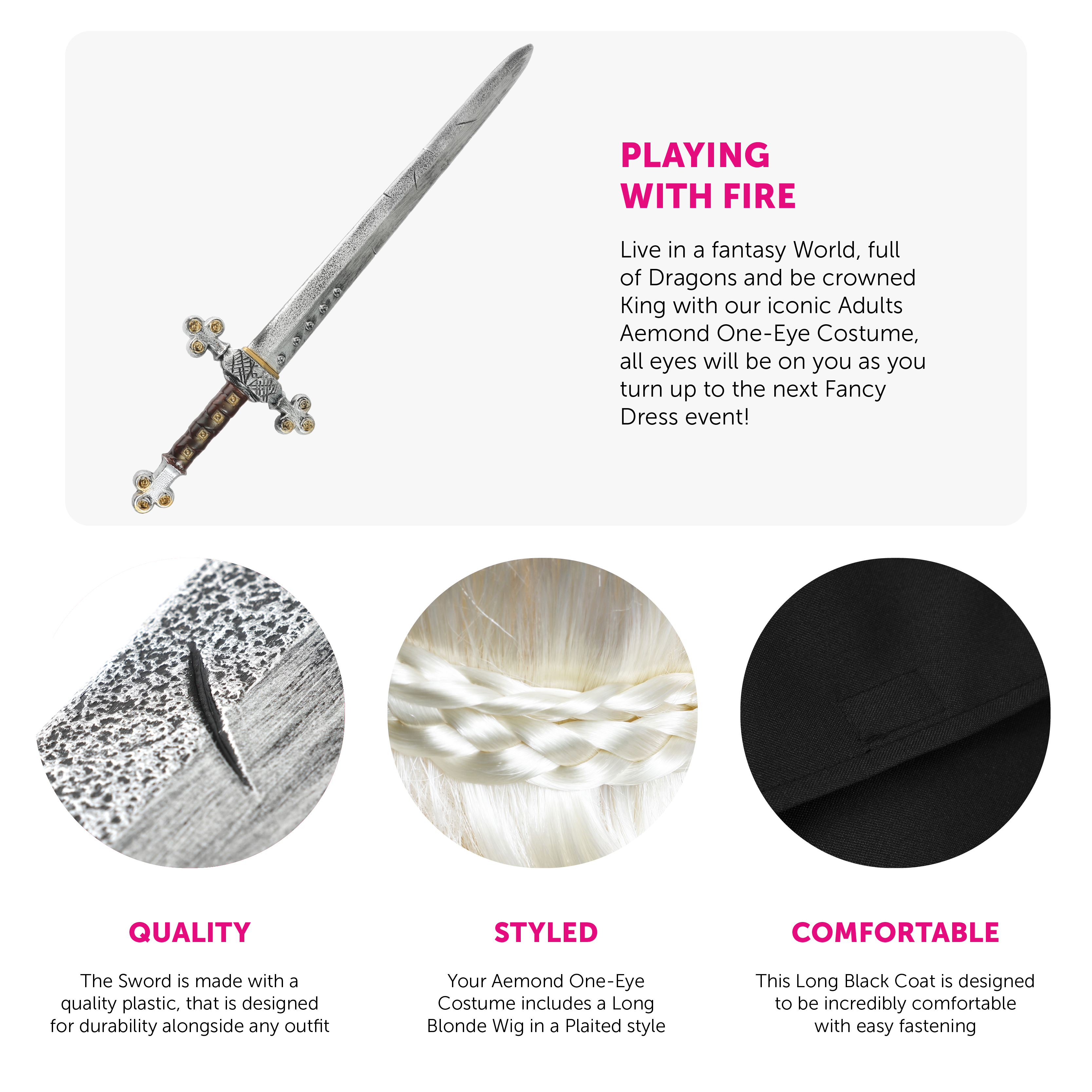 COSTUME DETAILS: Your Adults Aemond One-Eye Costume includes a Long Black Duster Jacket, a Long Blonde Wig with plaited detail, a Black Eye Patch, and a Plastic Sword, the perfect Costume for any fancy dress event!