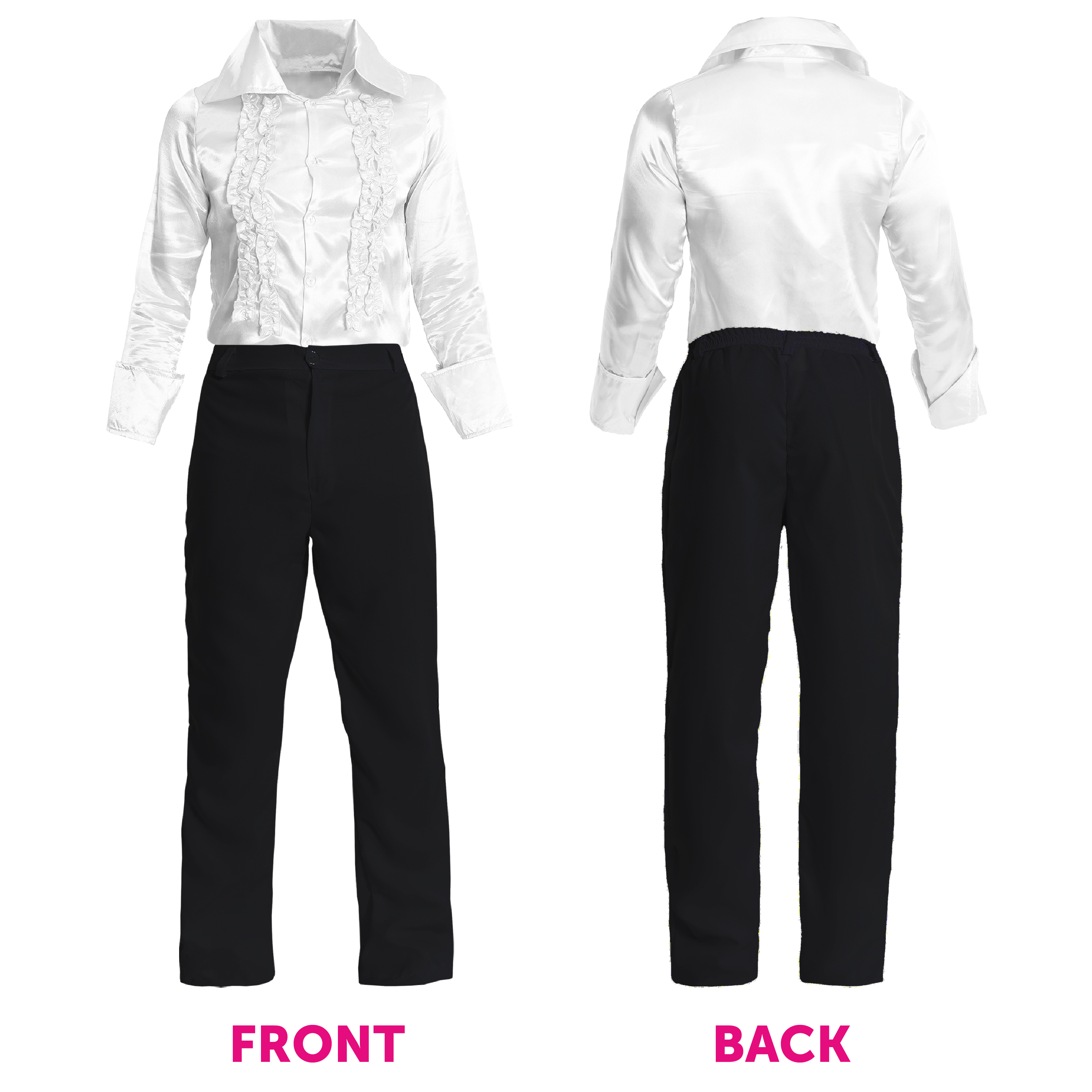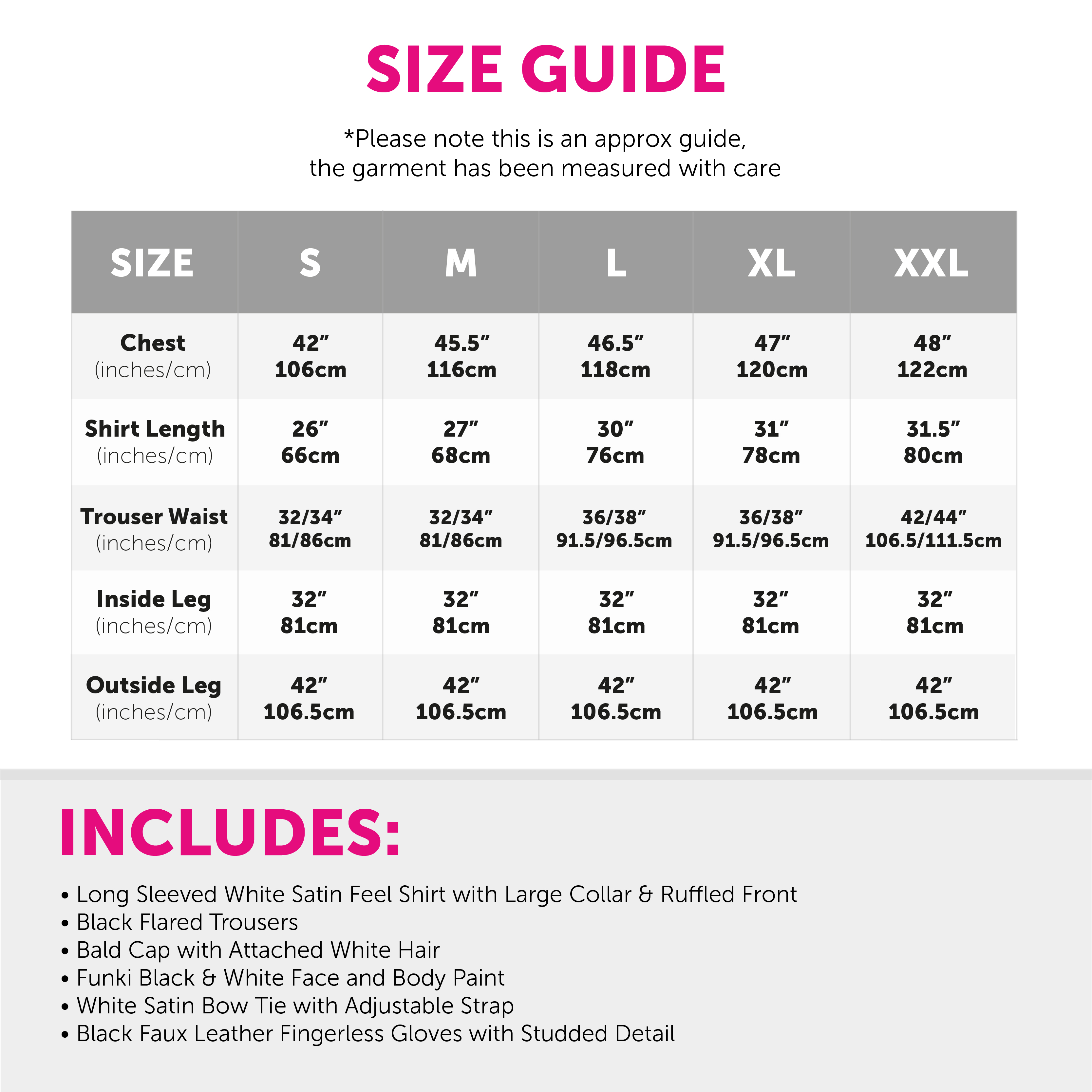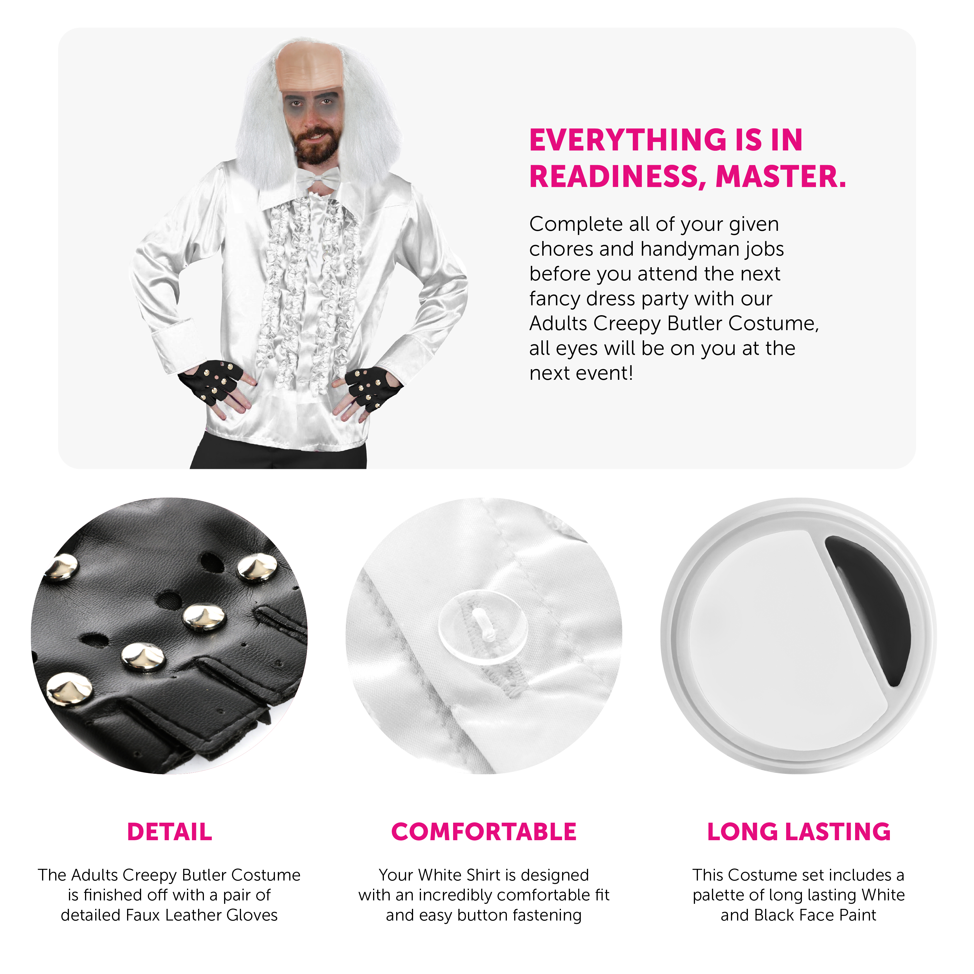 COSTUME INCLUDES: The Adults Creepy Butler Costume includes a Bald Cap with attached White Hair, a White Shirt with Frilly detail on the front, a pair of Black Flared Trousers, a palette of Funki Black and White Face Paint, Black Faux Leather Fingerless Gloves with Silver Studded detail, and a White Satin Bow Tie with an adjustable strap, the perfect look for any fancy dress event!