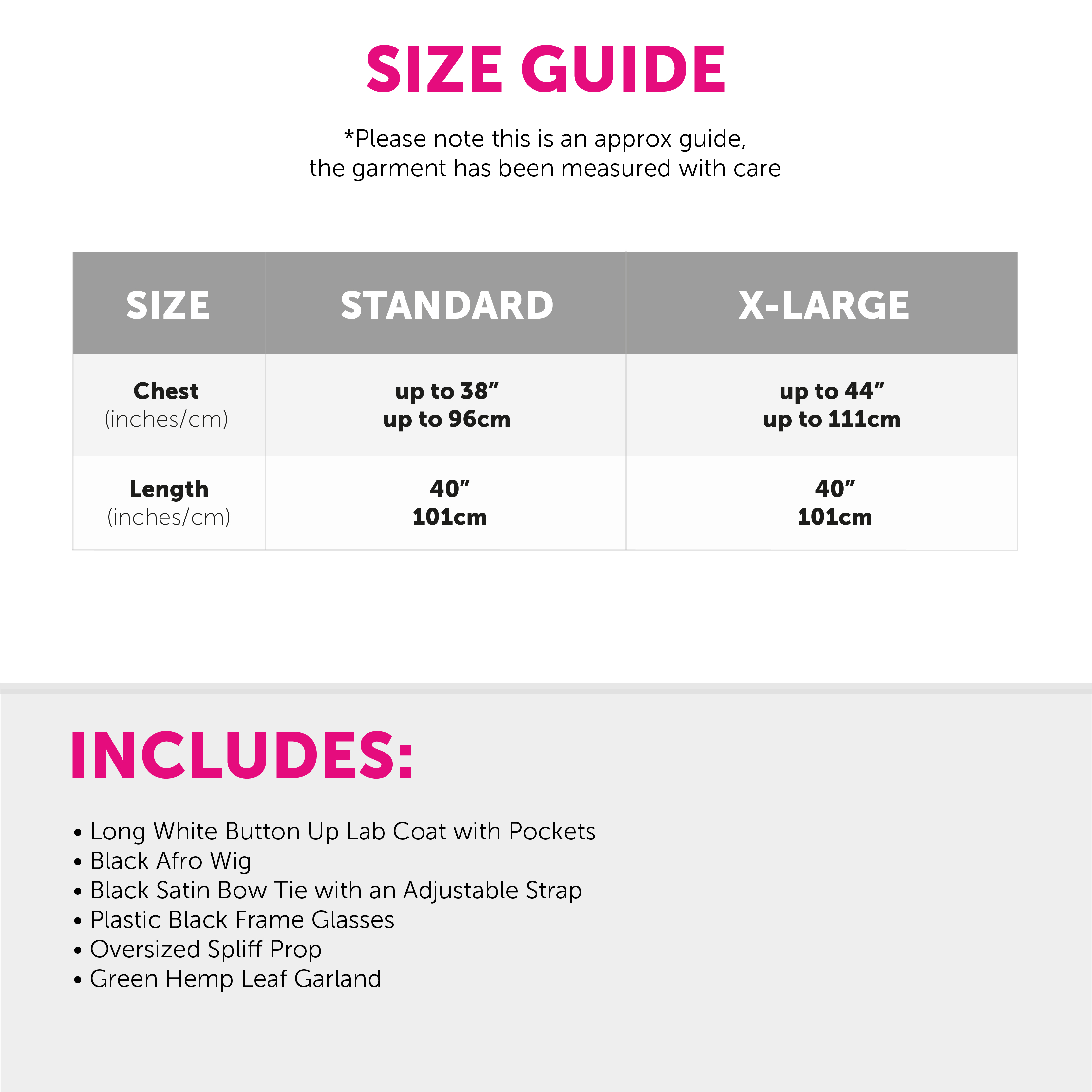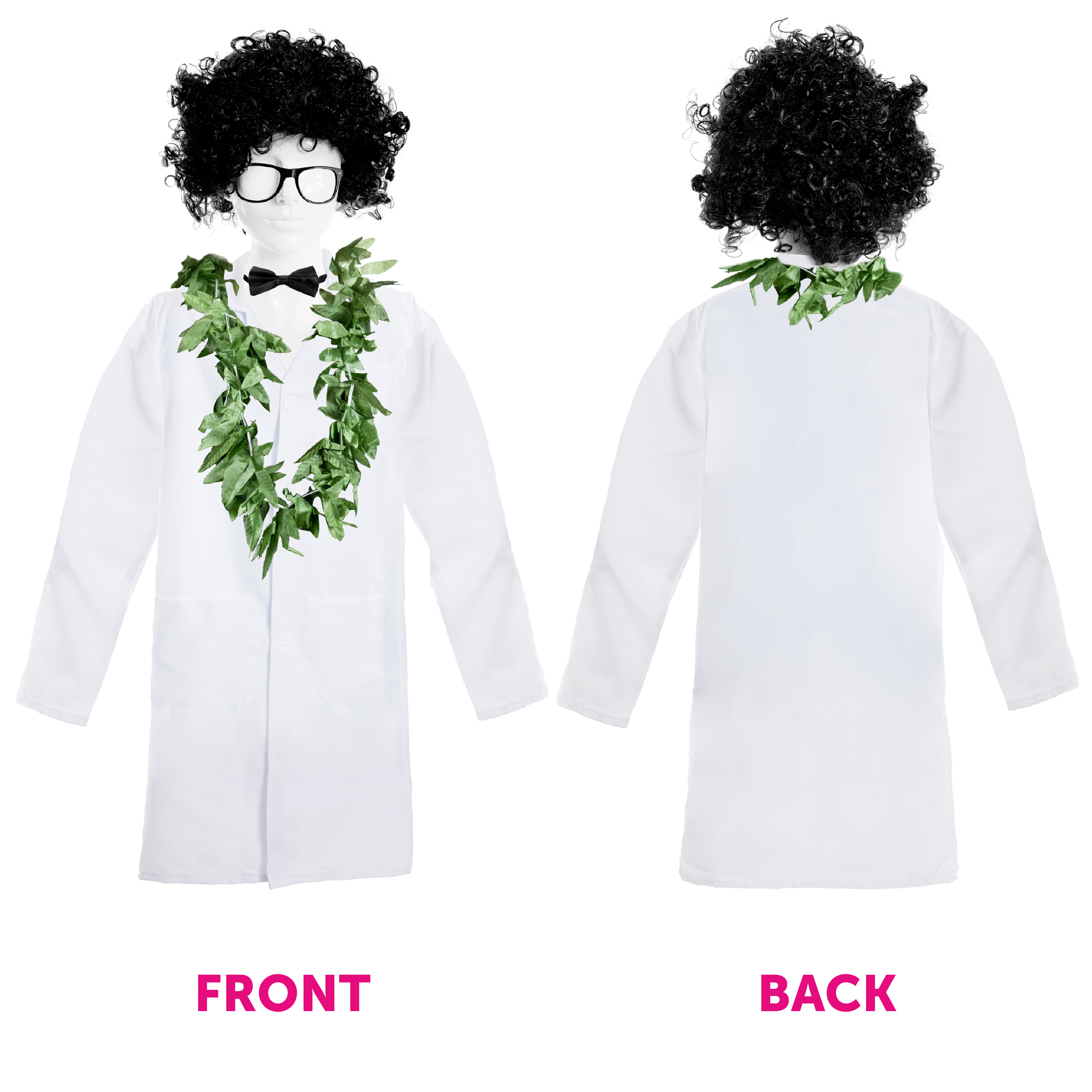 COSTUME INCLUDES: Your Adults Doctor Greenfinger Costume Set includes a Long White Lab Coat with pockets and button up fastening, a Black Afro Wig, plastic Black Frame Glasses, Black Satin Bow Tie, a Green Hemp Leaf Garland, and an over sized Spliff Prop, the perfect look for any Hip Hop Fancy Dress event!