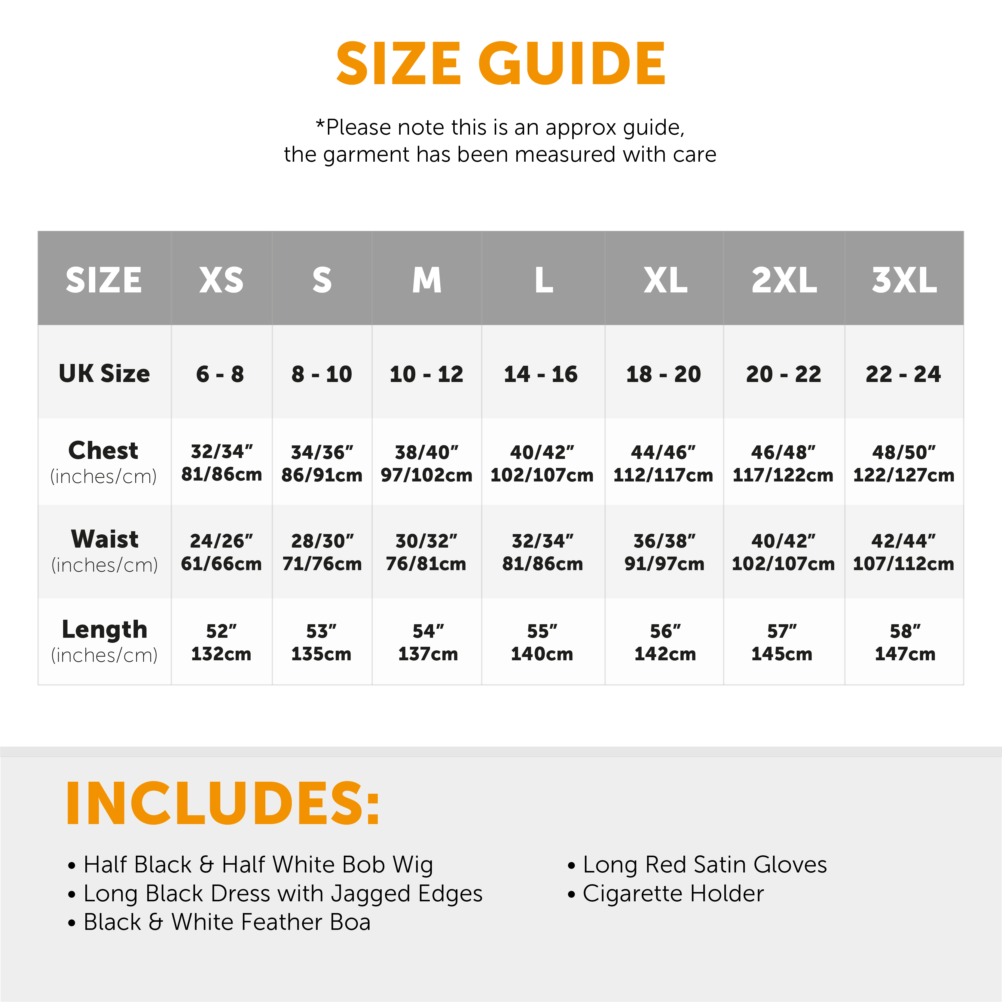 COSTUME INCLUDES: Your Ladies Evil Dog Lady Costume Set includes a half White and half Black Bob Wig, a Long Black Dress with a jagged edge, a Black and White Feather Boa, a pair of Long Red Gloves, and a Cigarette Holder, the perfect costume set for any fancy dress event!