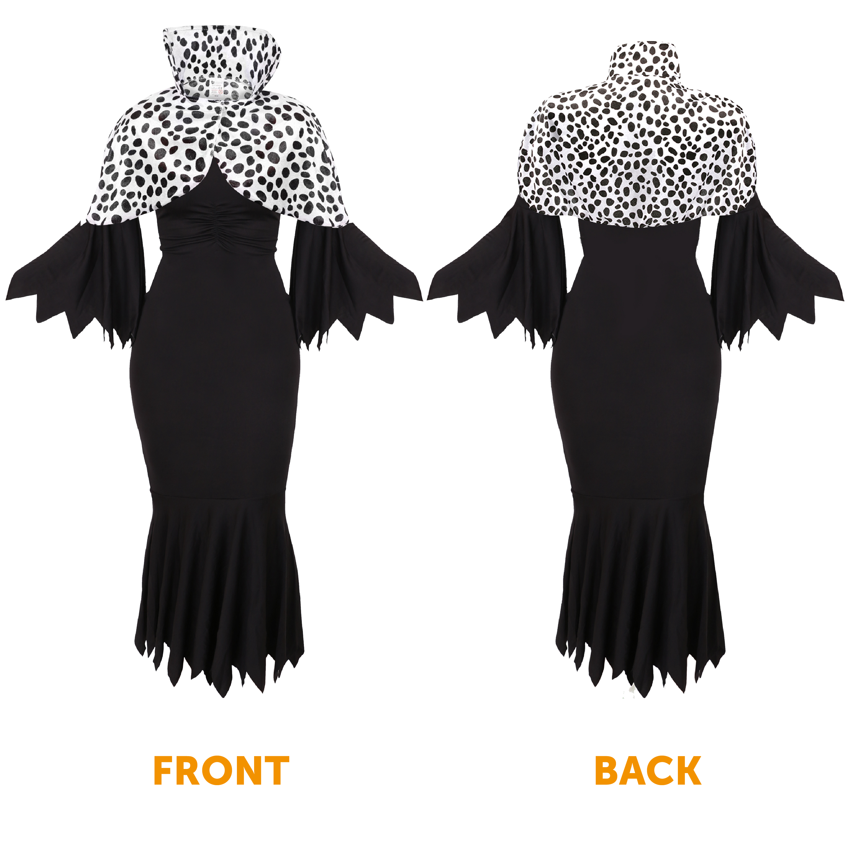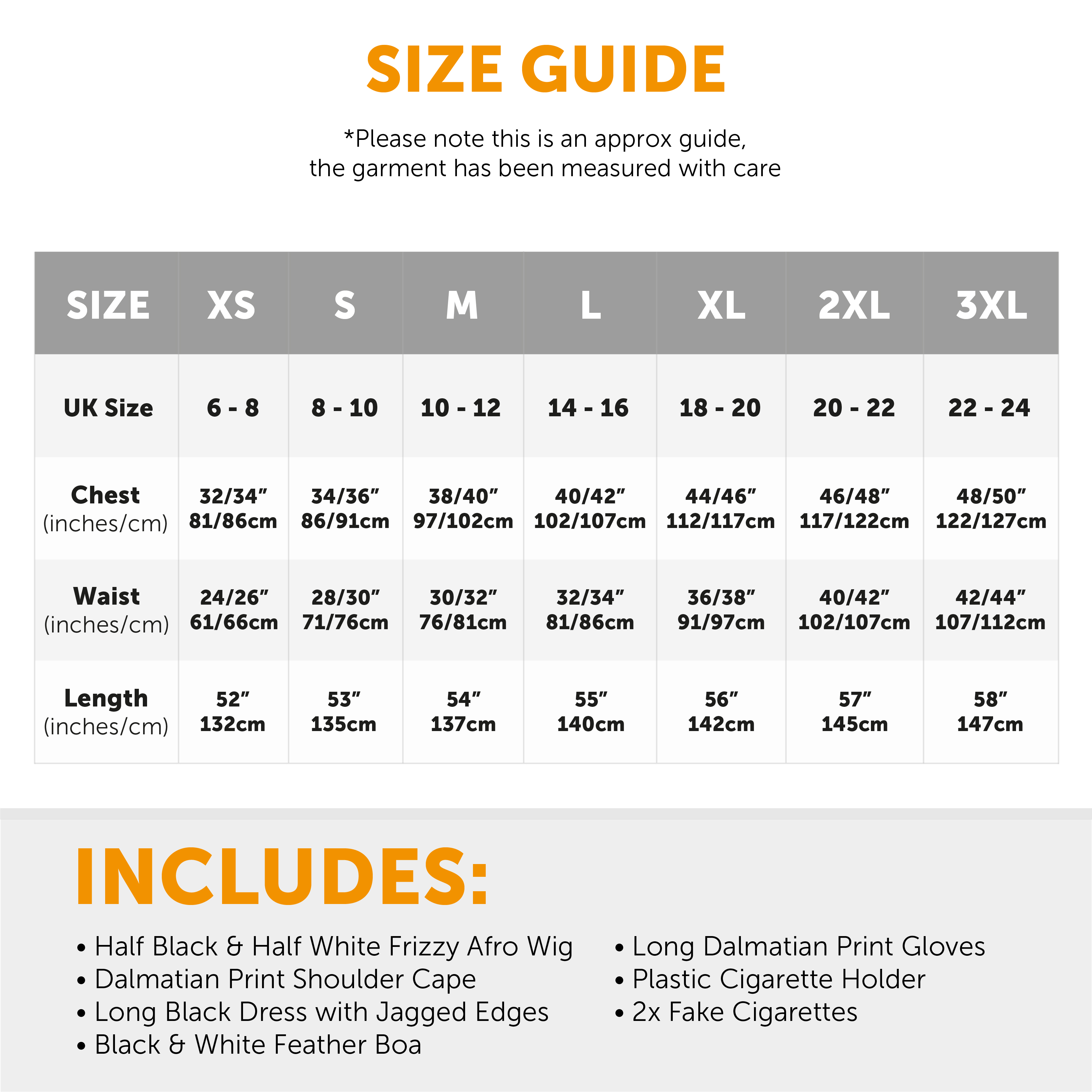 COSTUME INCLUDES: Your Ladies Deluxe Evil Dog Lady Costume Set includes a half White and half Black Crimped Afro Wig, an over the shoulder Dalmatian Cape, a Long Black Dress with a jagged edge, a Black and White Feather Boa, a pair of Dalmatian print Gloves, a Cigarette Holder, and 2x Fake Cigarettes, the perfect costume set for any fancy dress event!