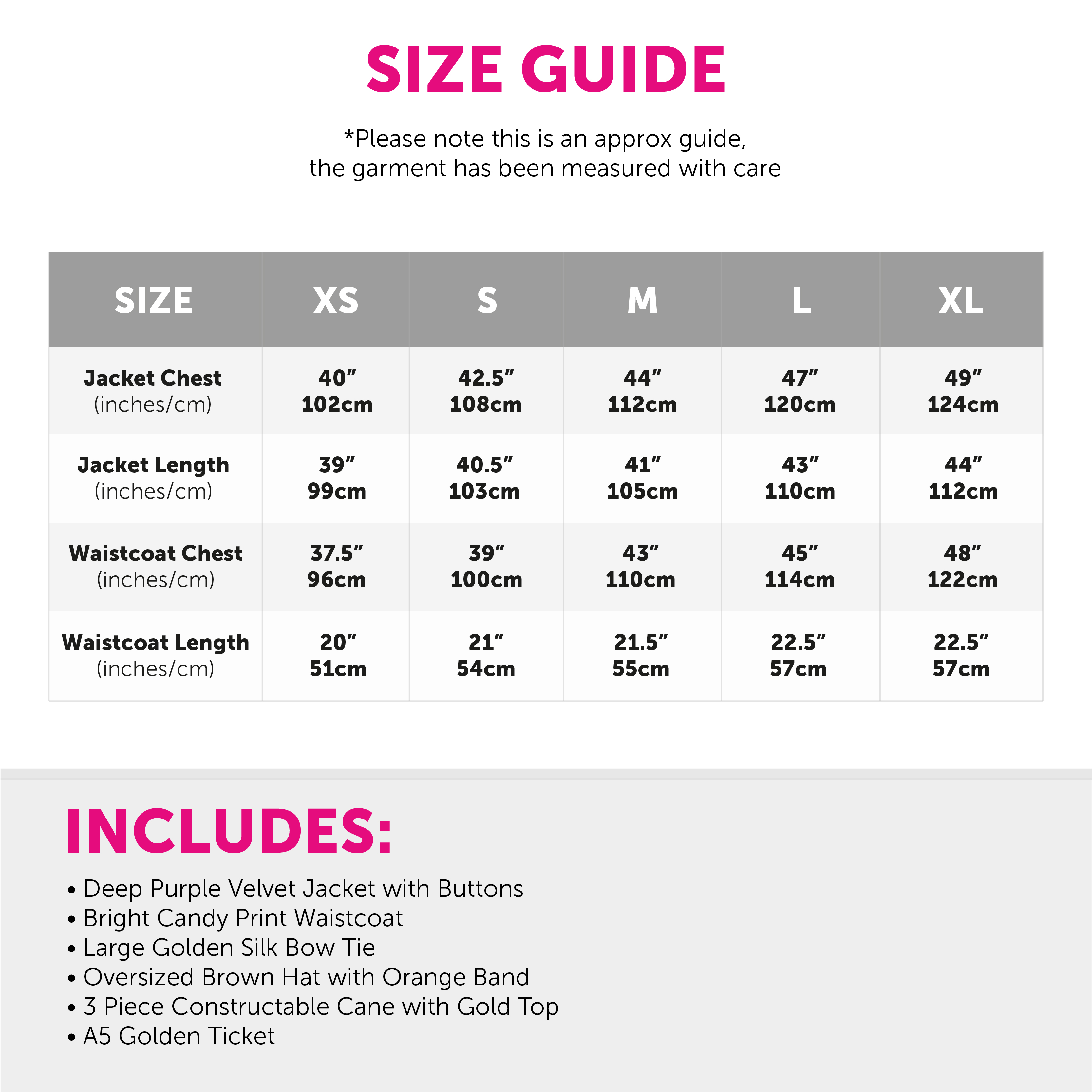 AVAILABLE IN MULTIPLE SIZES: This Adults Chocolate Factory Boss Costume is available in multiple sizes from X-Small to X-Large: X-Small - Jacket Chest 40" (102cm), Jacket Length 39" (99cm), Waistcoat Chest 37.5" (96cm), Waistcoat Length 20" (51cm) | Small - Jacket Chest 42.5" (108cm), Jacket Length 40.5" (103cm), Waistcoat Chest 39" (100cm), Waistcoat Length 21" (54cm) | Medium - Jacket Chest 44" (112cm), Jacket Length 41" (105cm), Waistcoat Chest 43" (110cm), Waistcoat Length 21.5" (55cm) | Large - Jacket Chest 47" (120cm), Jacket Length 43" (110cm), Waistcoat Chest 45" (114cm), Waistcoat Length 22.5" (57cm) | X-Large - Jacket Chest 49" (124cm), Jacket Length 44" (112cm), Waistcoat Chest 48" (122cm), Waistcoat Length 22.5" (57cm)