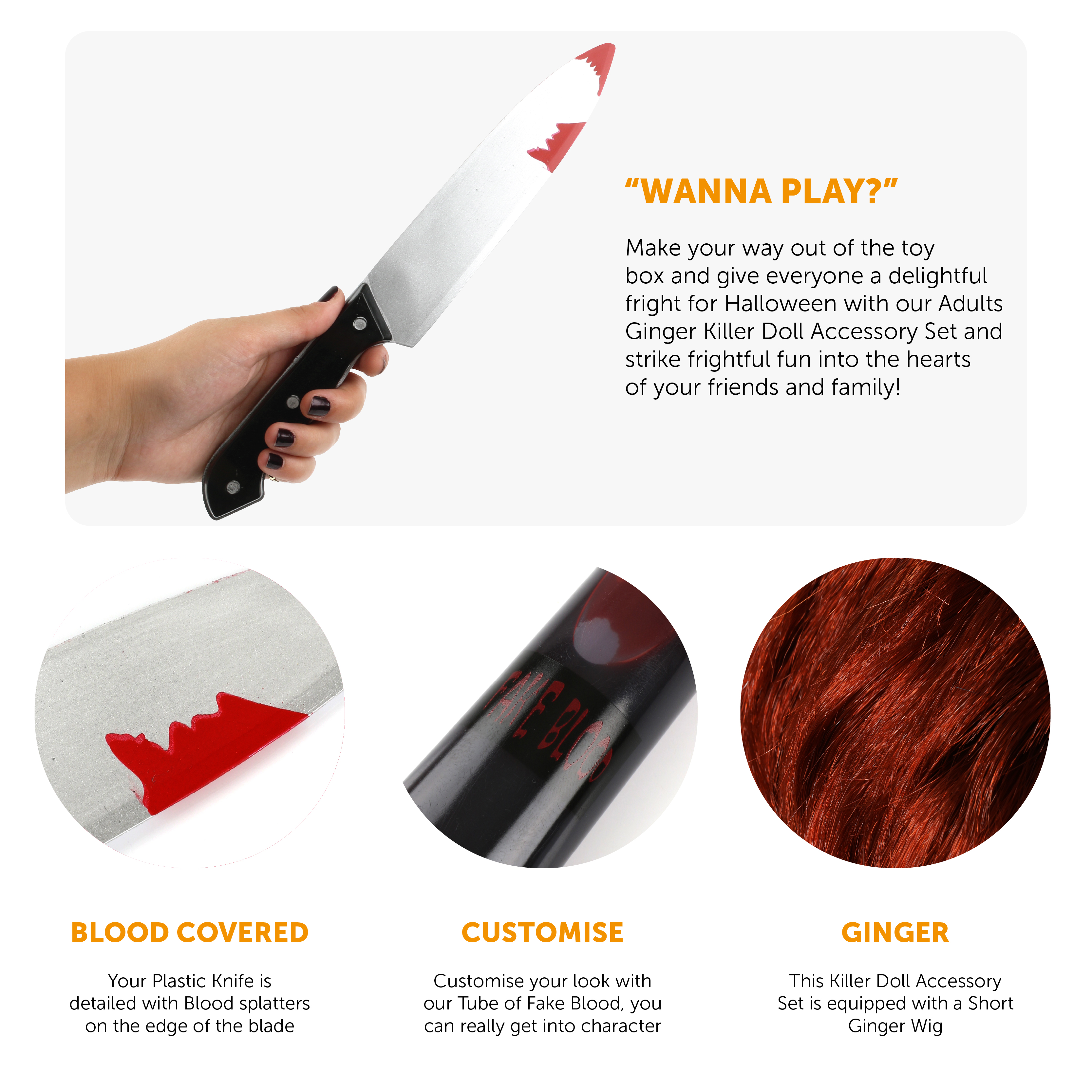 SET INCLUDES: Your Killer Doll Accessory Set includes a Short Ginger Wig, a Plastic Knife with Blood detail on the silver blade, and a Tube of Fake Blood, the perfect addition to your scary outfit idea!