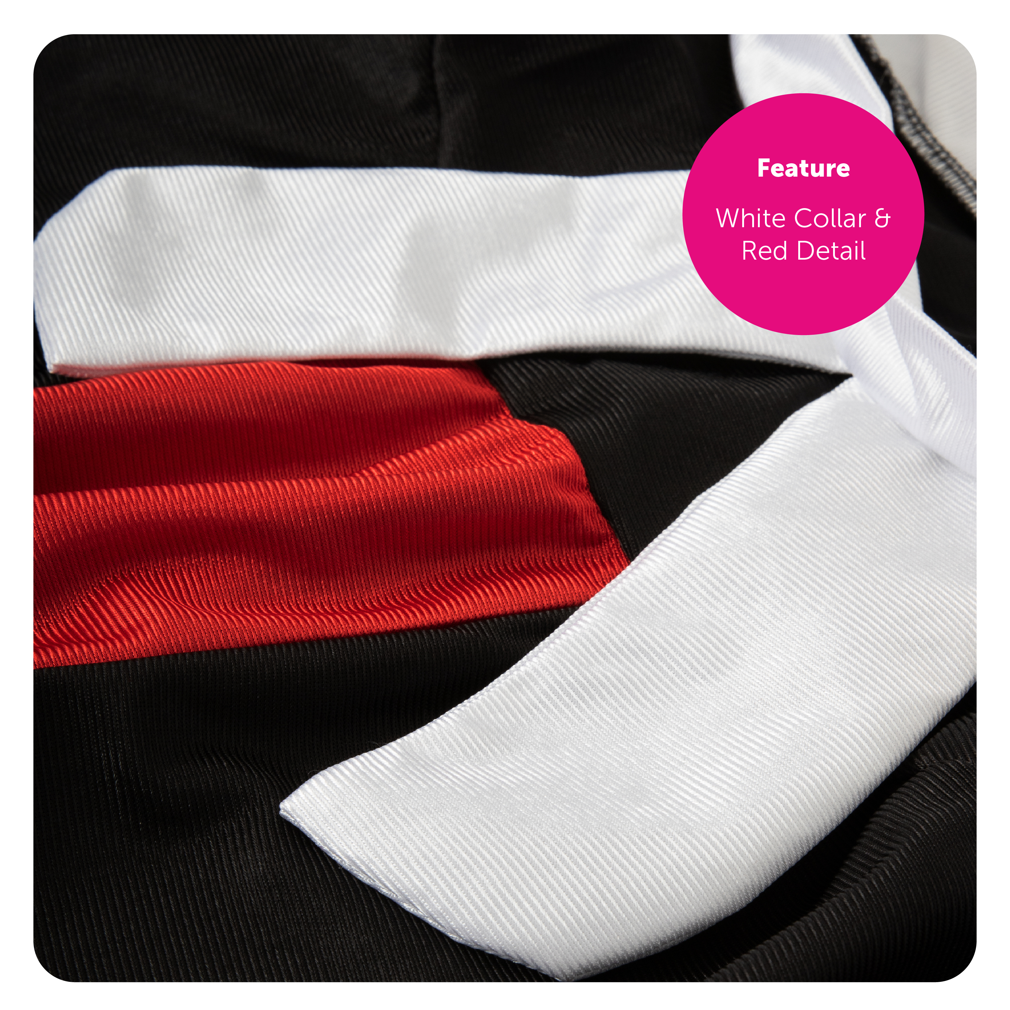 Command the courtroom with this classic long black Judge’s Robe, featuring striking red panelling and a white tie.