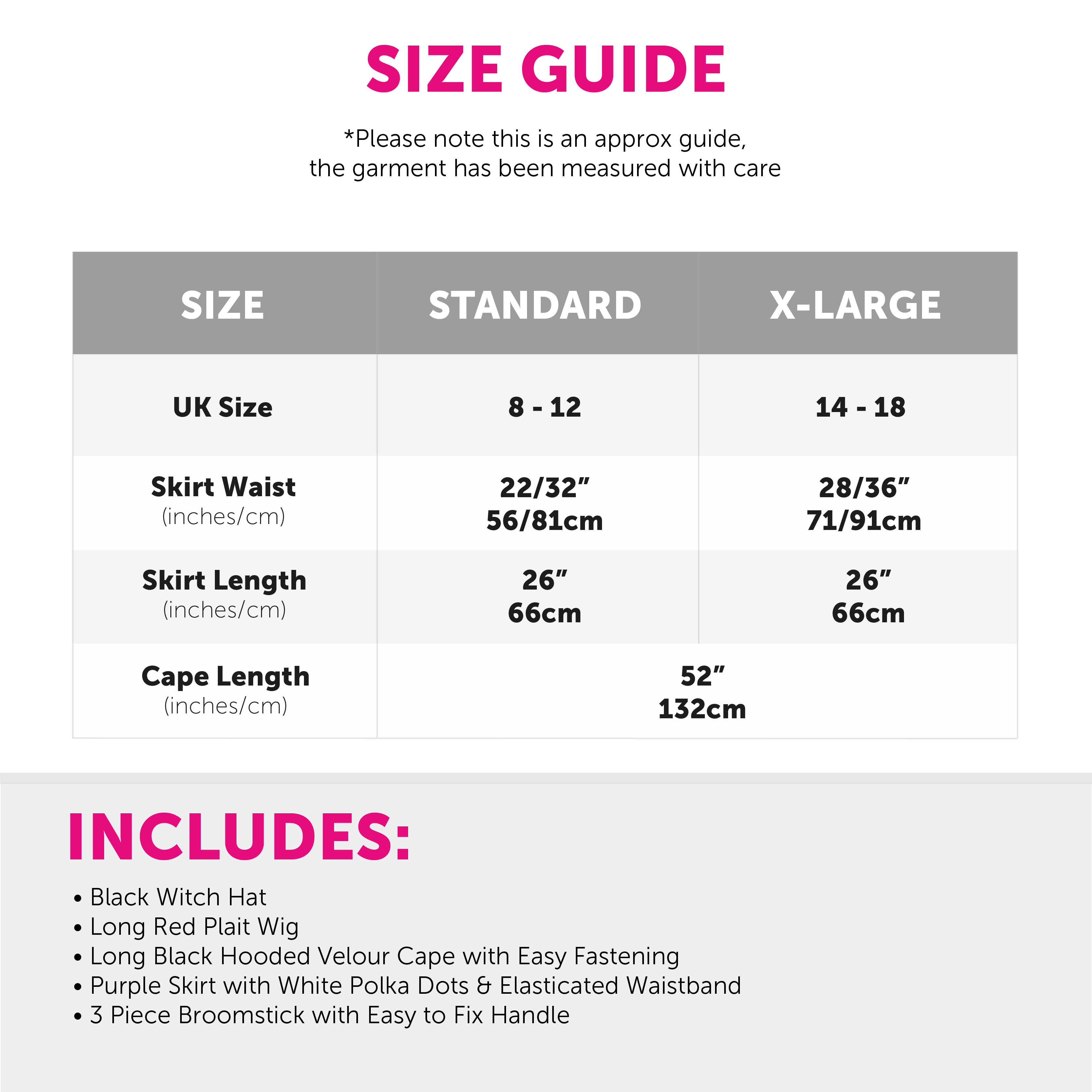 AVAILABLE IN TWO SIZES: Your Ladies Kind Witch Costume is available in two sizes only, Standard and Plus Size: Standard - (UK 8 - 12), Waist 22/32" (56/81cm), Length 26" (66cm) | Plus Size - (UK 14 - 18), Waist 28/36" (71/91cm), Length 26" (66cm)