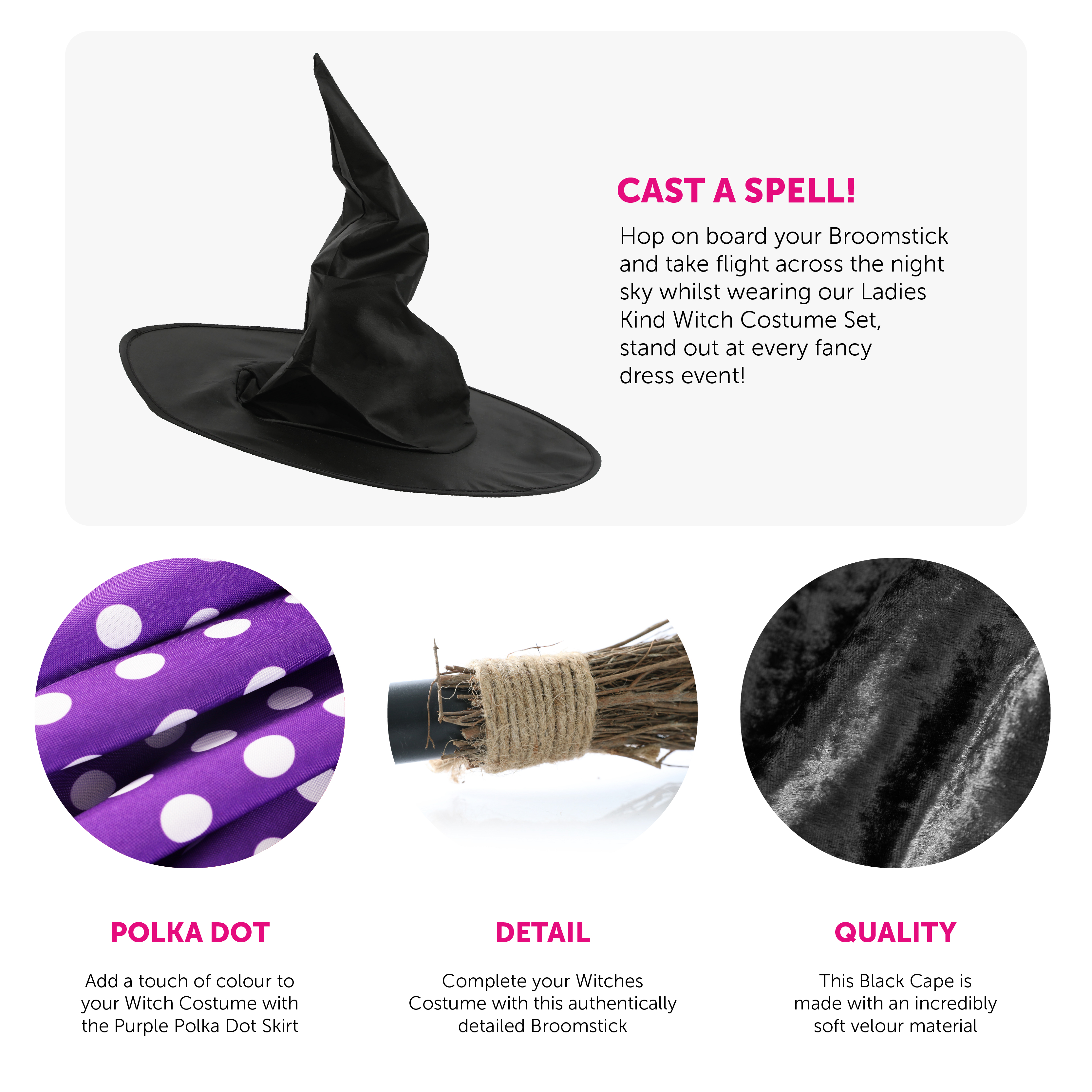 COSTUME INCLUDES: This Ladies Kind Witch Costume includes a Black Witches Hat, a Red Plait Wig, a soft Black Velour Hooded Cape with hook and loop fastening, a Purple and White Polka Dot Skirt, and a 3 piece constructable Broomstick, the perfect look for World Book Day!