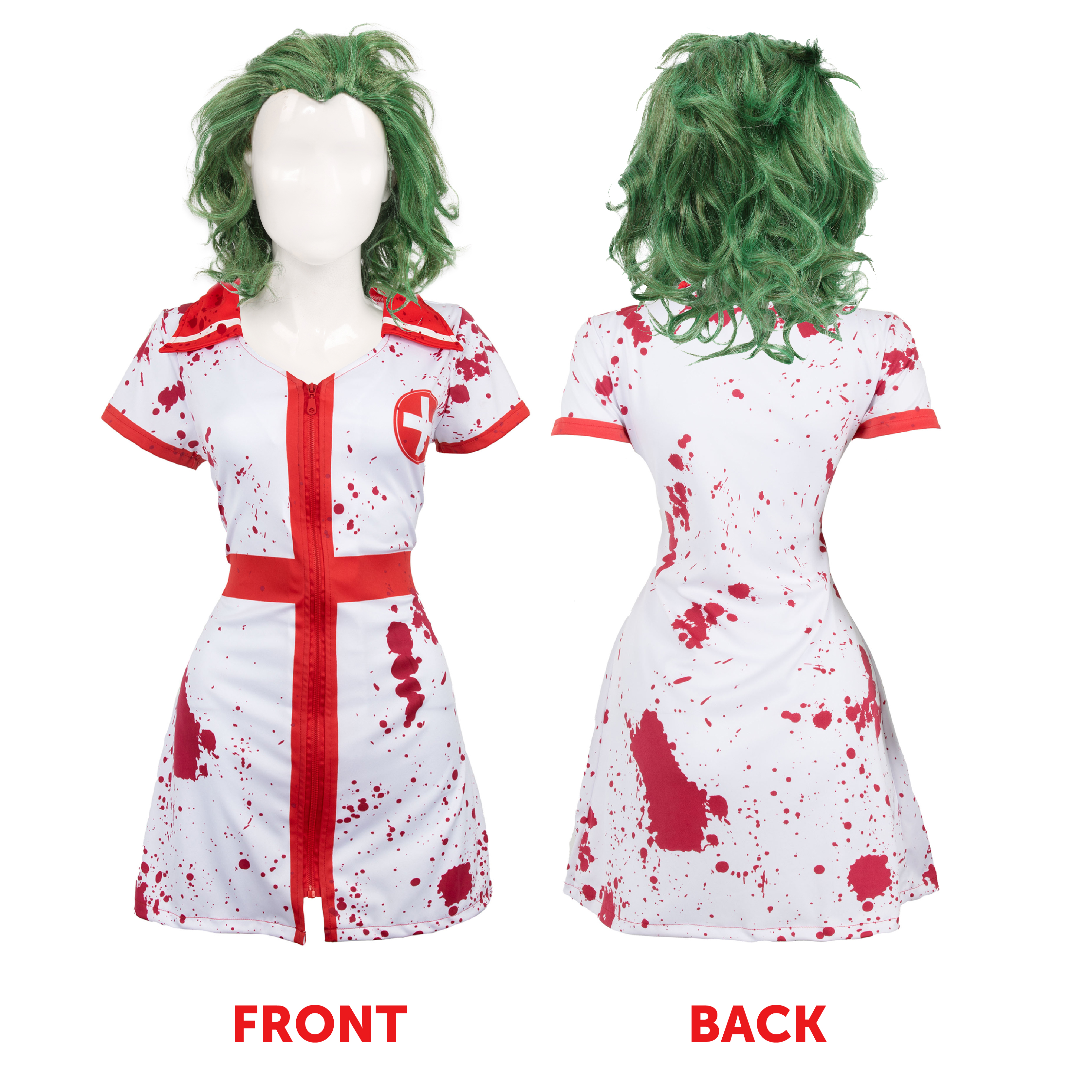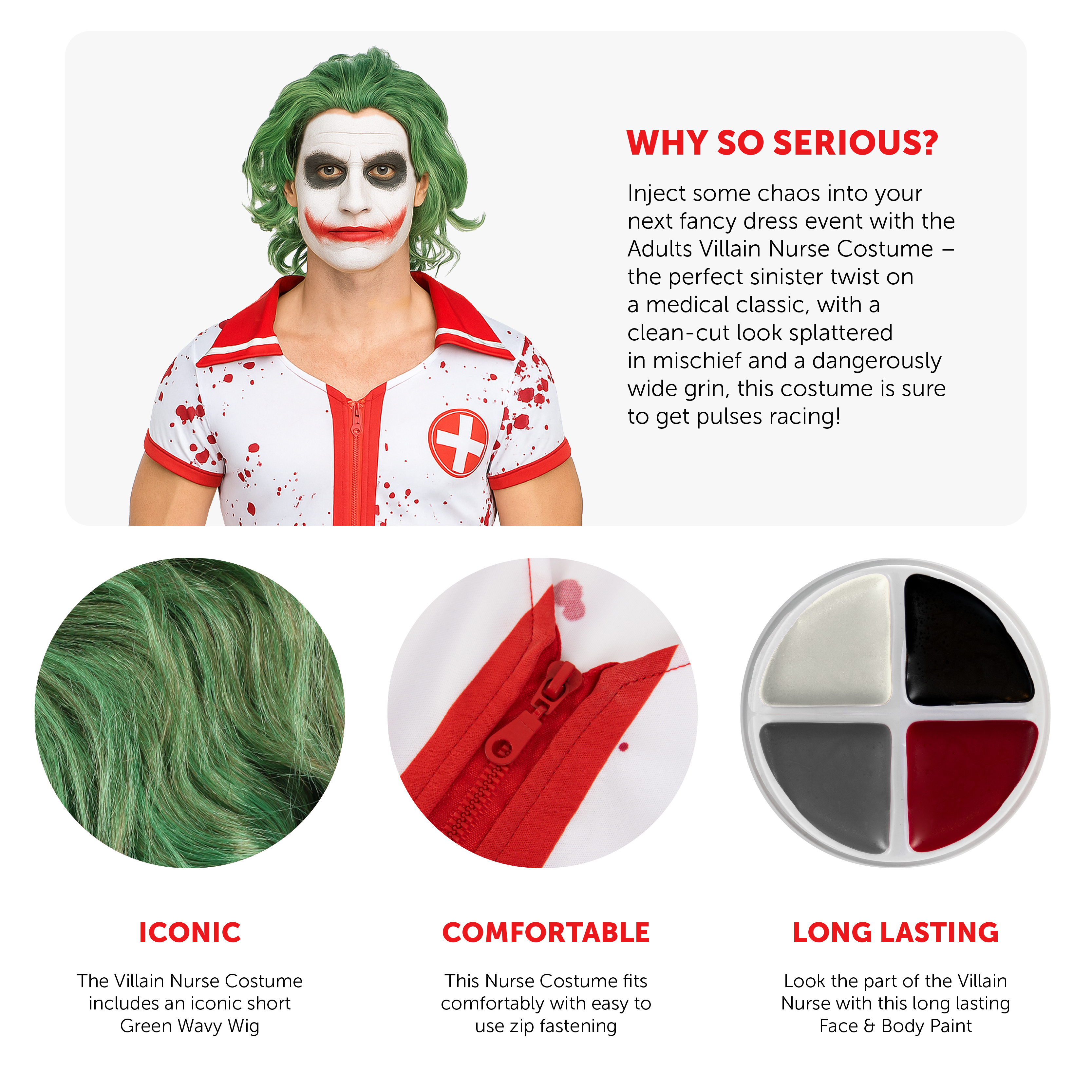 COSTUME INCLUDES: Your Adults Villain Nurse Costume includes a Short White dress with a White Cross Symbol, Red Detailing with an easy Zip up front, an iconic Green Wig, and a palette of Face & Body Paint with Fake Blood!