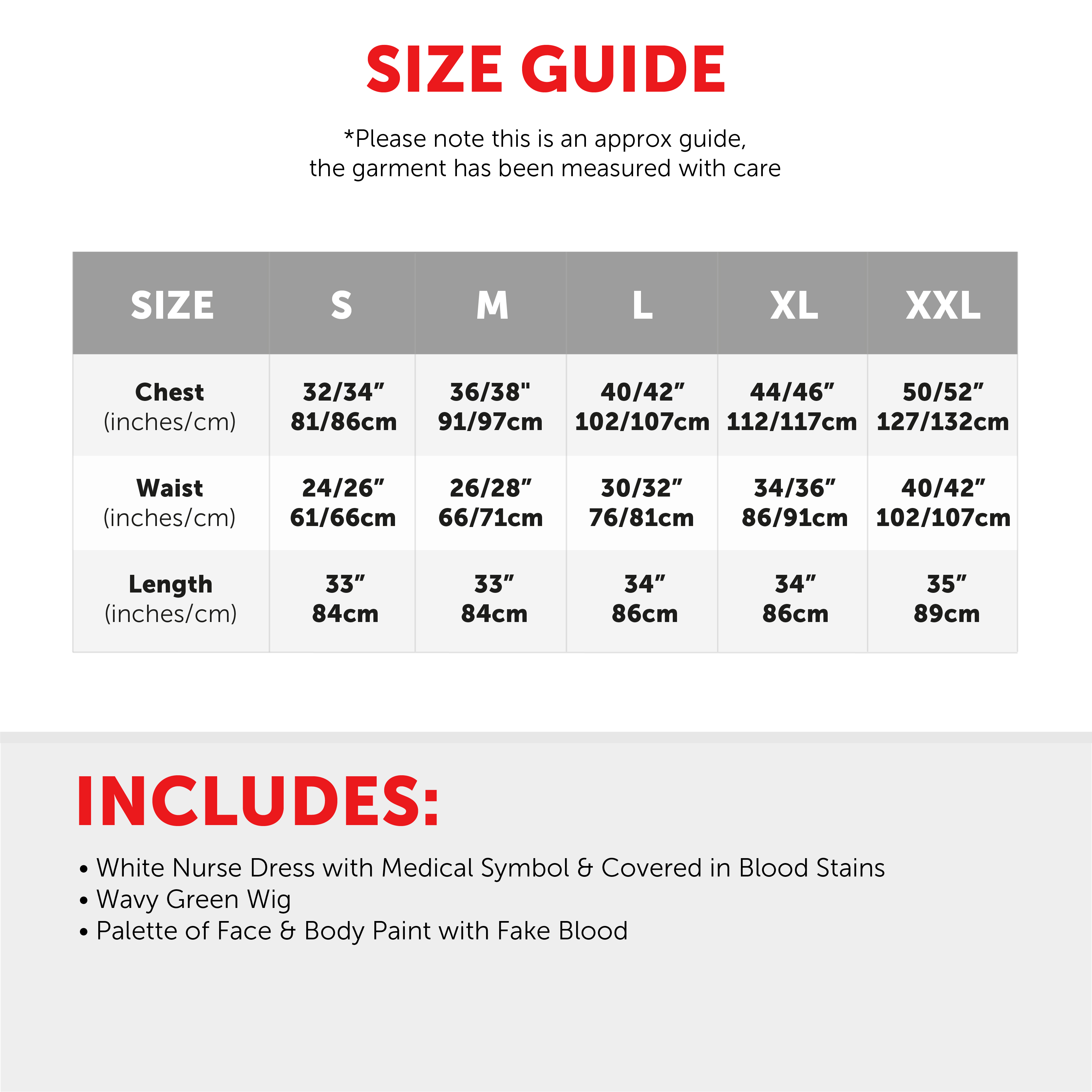 AVAILABLE IN MULTIPLE SIZES: Your Adults Villain Nurse Costume is available in multiple sizes from Small to XX-Large: Small - Chest 32/34" (81/86cm), Waist 24/26" (61/66cm), Length 33" (84cm) | Medium - Chest 36/38" (91/97cm), Waist 26/28" (66/71cm), Length 33" (84cm) | Large - Chest 40/42" (102/107cm), Waist 30/32" (76/81cm), Length 34" (86cm) | X-Large - Chest 44/46" (112/117cm), Waist 34/36" (86/91cm), Length 34" (86cm) | XX-Large - Chest 50/52" (127/132cm), Waist 40/42 (102/107cm),  Length 35" (89cm)