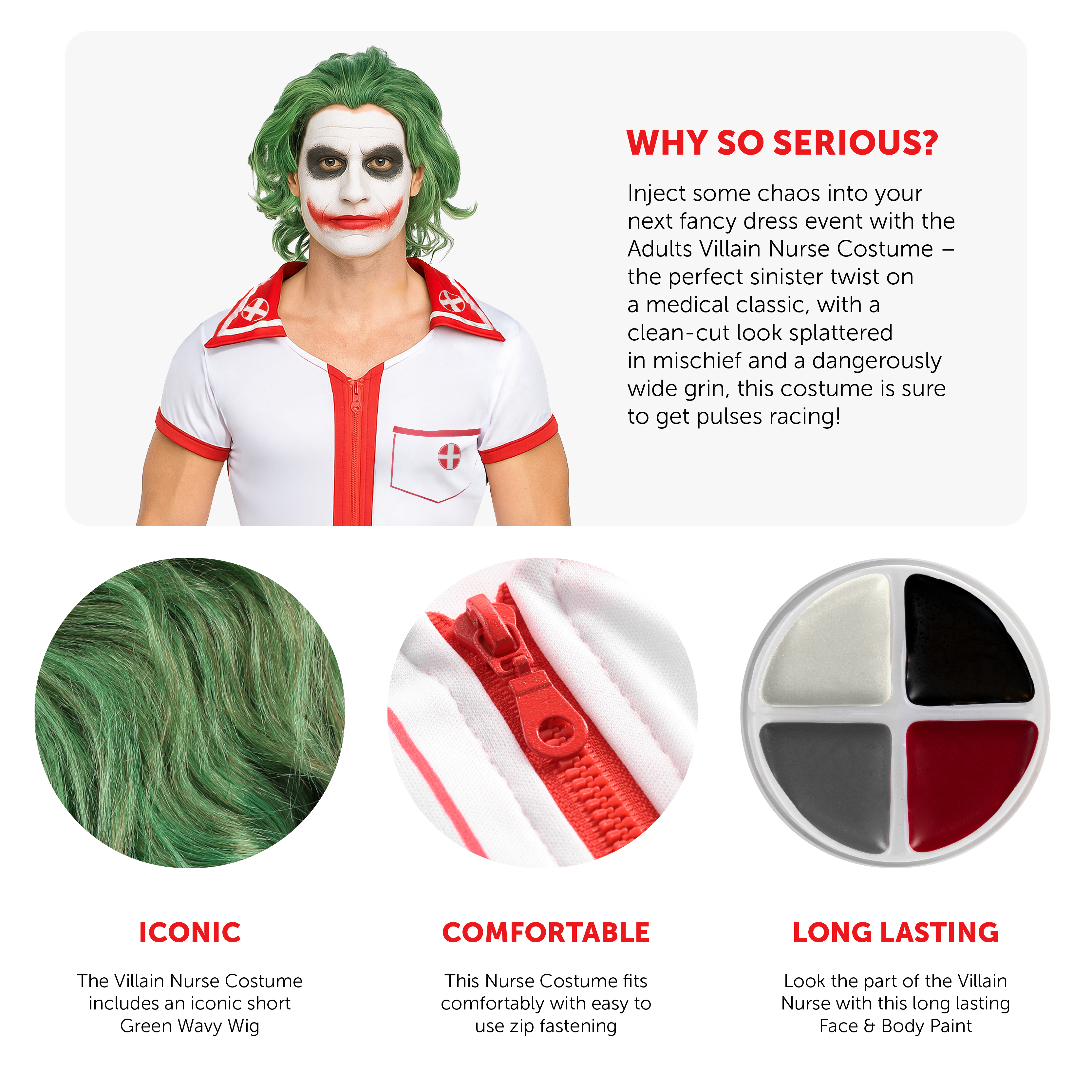 COSTUME INCLUDES: Your Adults Villain Nurse Costume includes a Short White dress with a White Cross Symbol, Red Detailing with an easy Zip up front, an iconic Green Wig, and a palette of Face & Body Paint with Fake Blood!