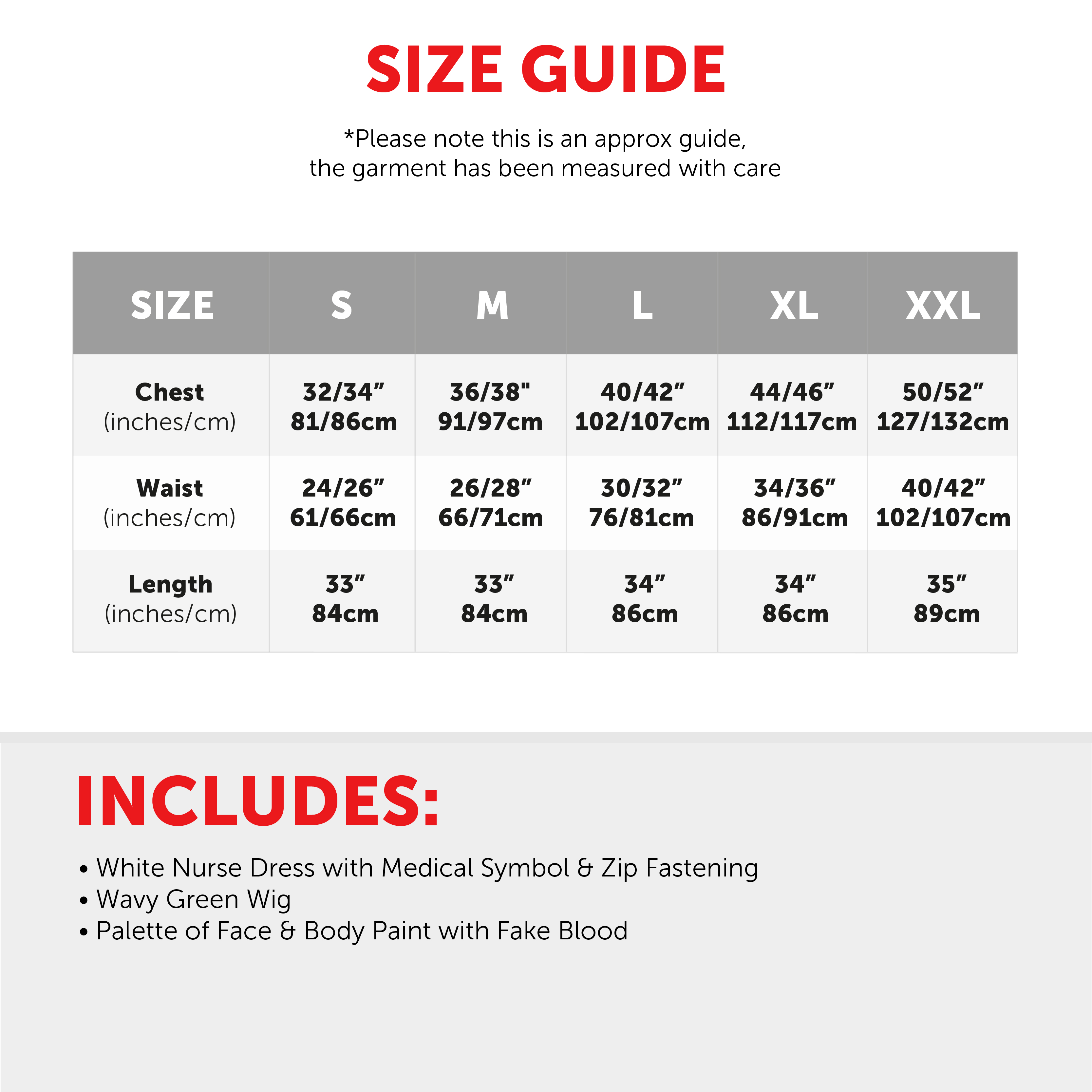AVAILABLE IN MULTIPLE SIZES: Your Adults Villain Nurse Costume is available in multiple sizes from Small to XX-Large: Small - Chest 32/34" (81/86cm), Waist 24/26" (61/66cm), Length 33" (84cm) | Medium - Chest 36/38" (91/97cm), Waist 26/28" (66/71cm), Length 33" (84cm) | Large - Chest 40/42" (102/107cm), Waist 30/32" (76/81cm), Length 34" (86cm) | X-Large - Chest 44/46" (112/117cm), Waist 34/36" (86/91cm), Length 34" (86cm) | XX-Large - Chest 50/52" (127/132cm), Waist 40/42 (102/107cm),  Length 35" (89cm)