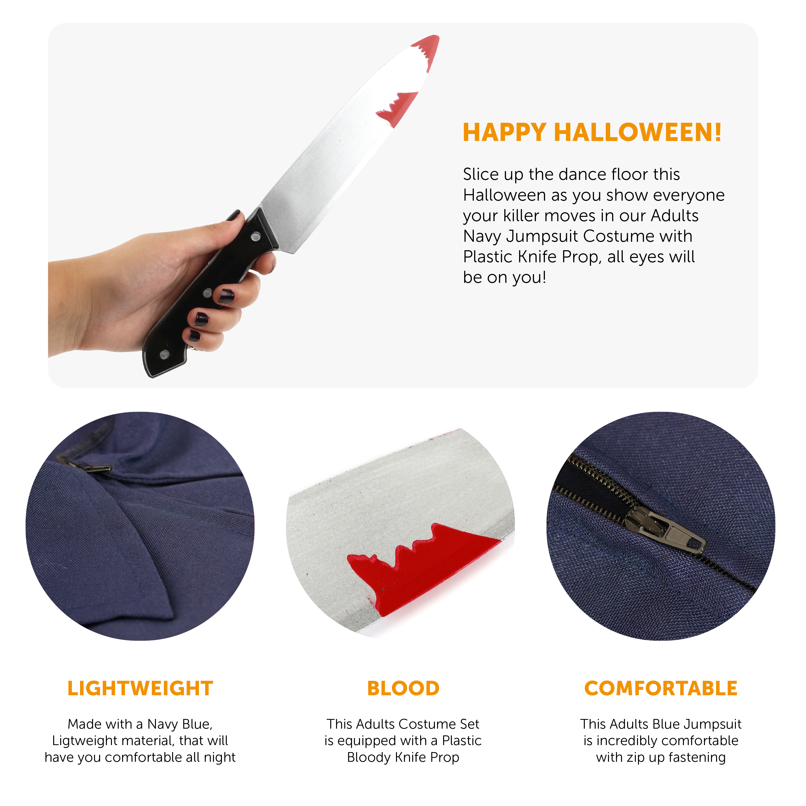 PERFECT FOR HALLOWEEN & OTHER FANCY DRESS: Whether you're looking for that perfect Halloween Costume, or becoming an iconic Horror Movie Character, look no further, our Adults Navy Blue Jumpsuit Costume and Plastic Knife Prop Set is the perfect outfit for you!