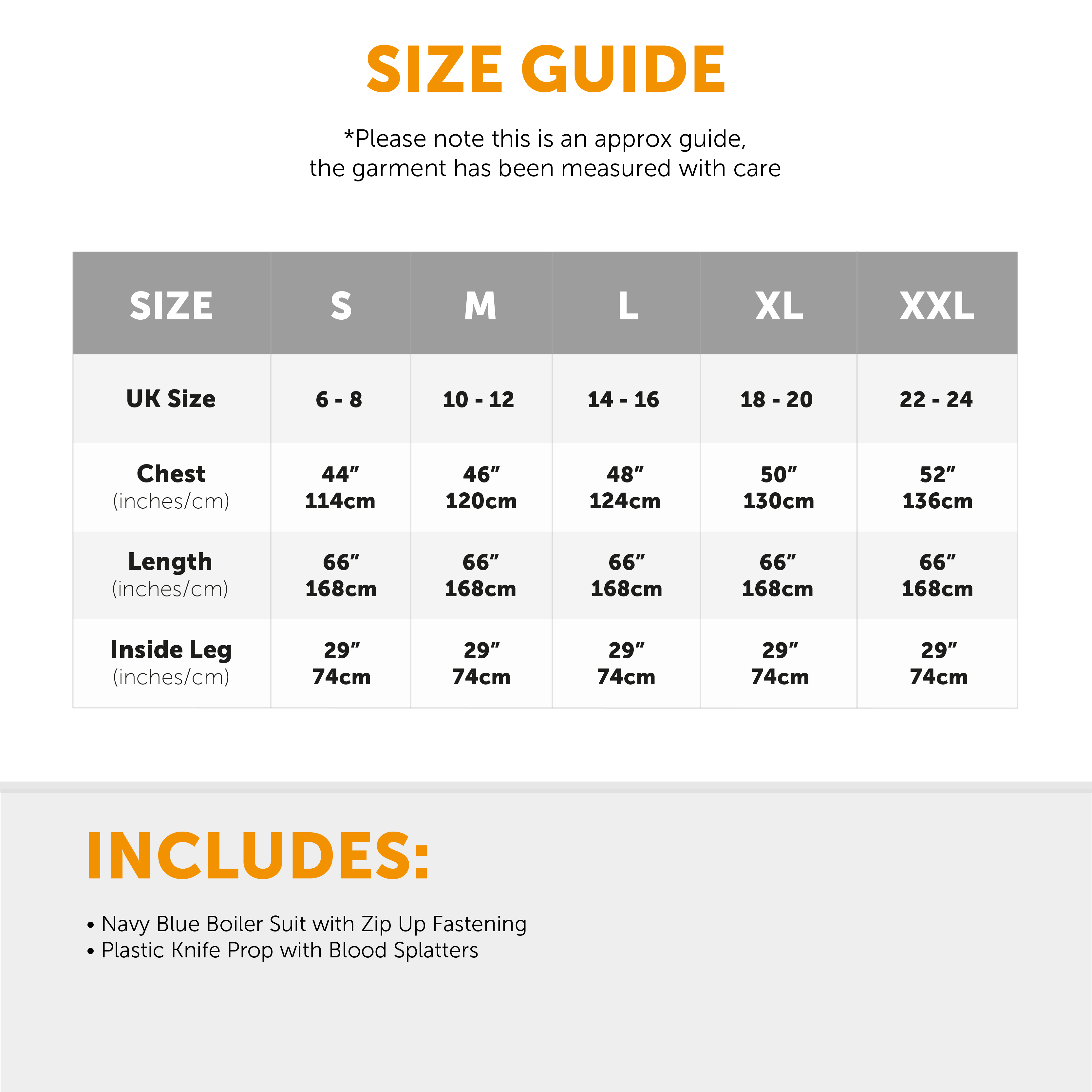 COSTUME INCLUDES: This Adults Costume includes a Navy Blue, all-in-one, long sleeved Boiler Suit, with comfortable zip up fastening, pockets on the front and finished with a quality style collar, and a Plastic Knife Prop, covered in blood splatters up the blade, a simple Costume to put the fright into the party!