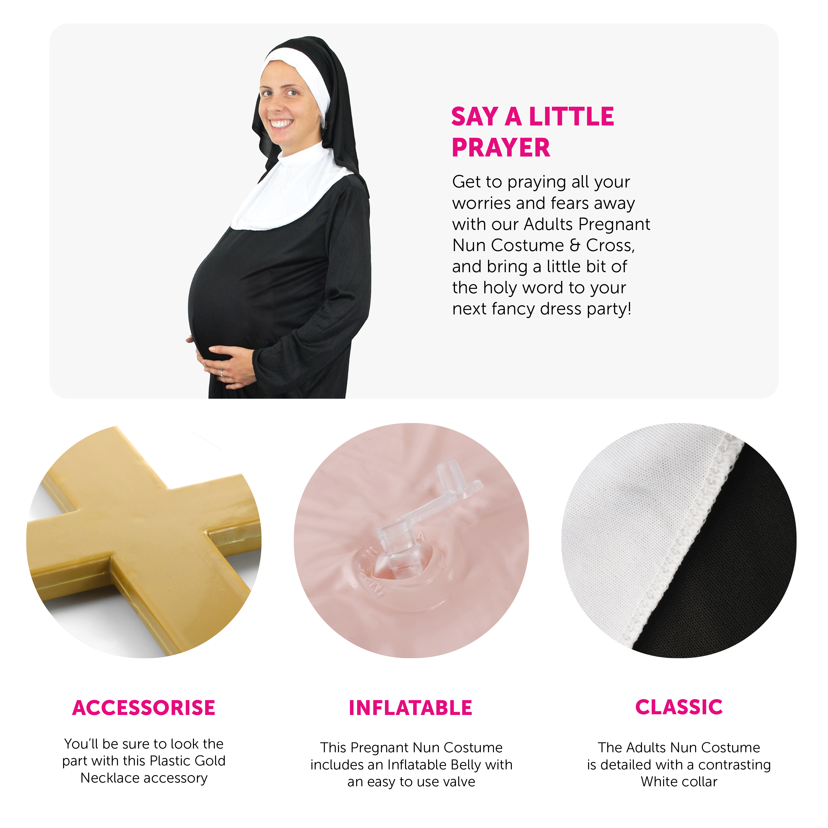 COSTUME INCLUDES: Your Adults Pregnant Nun Costume includes a Black Long loose-fitting Tunic with White Nun Collar, a Black Belt, a Black Cowl, an Inflatable Belly with an easy to use valve, and a Plastic Gold Cross Necklace, for you to look like the real deal at the next fancy dress event!