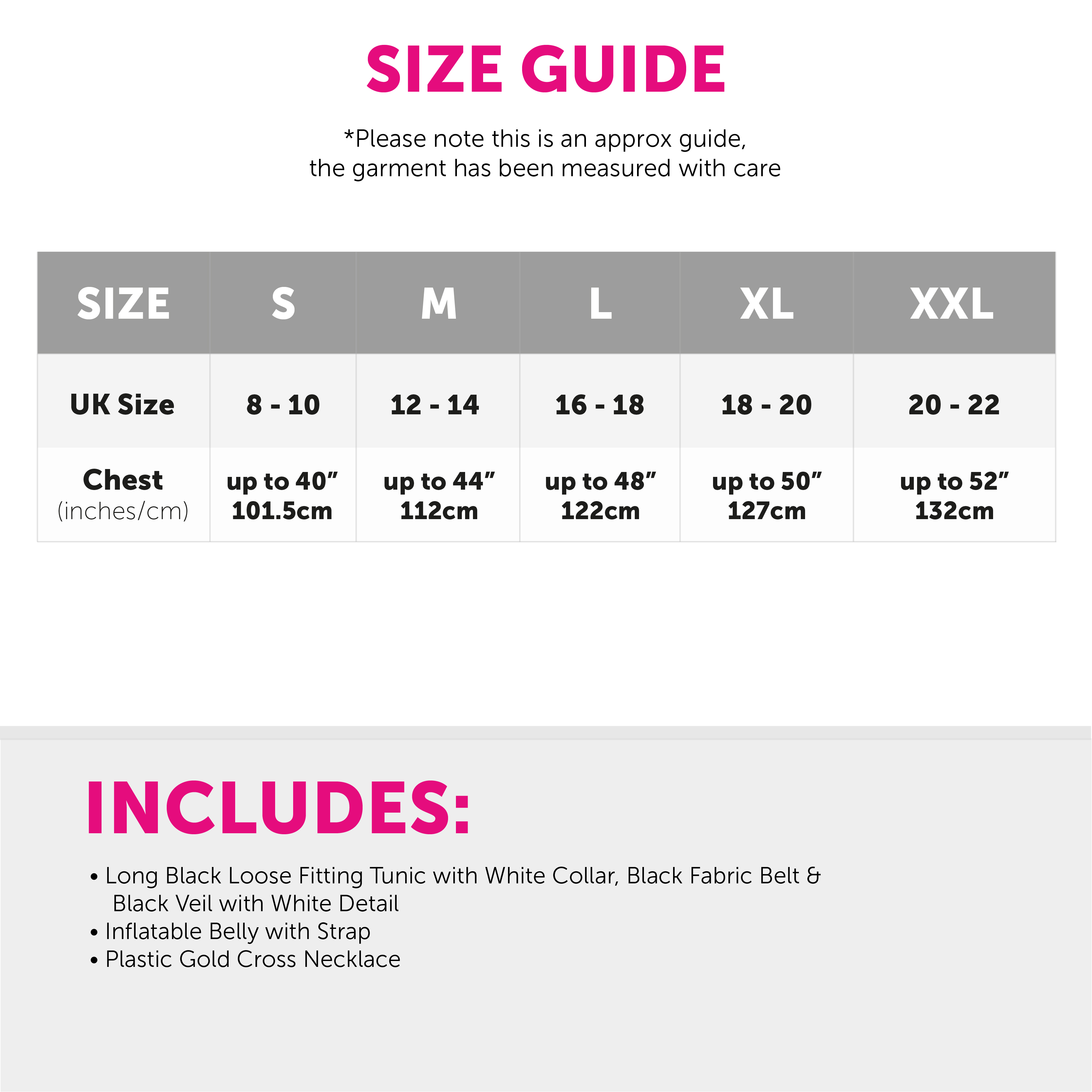 AVAILABLE IN MULTIPLE SIZES: Your Adults Pregnant Nun Costume is unisex and is available in sizes Small to XX-Large: Small (UK Size 8 - 10) Chest up to 40" (101.5cm) | Medium (UK Size 12 - 14), Chest up to 44" (112cm) | Large (UK Size 16 - 18), Chest up to 48" (122cm) | X Large (UK Size 18 - 20), Chest up to 50" (127cm) | XX Large (UK Size 20 - 22), Chest up to 52" (132cm)