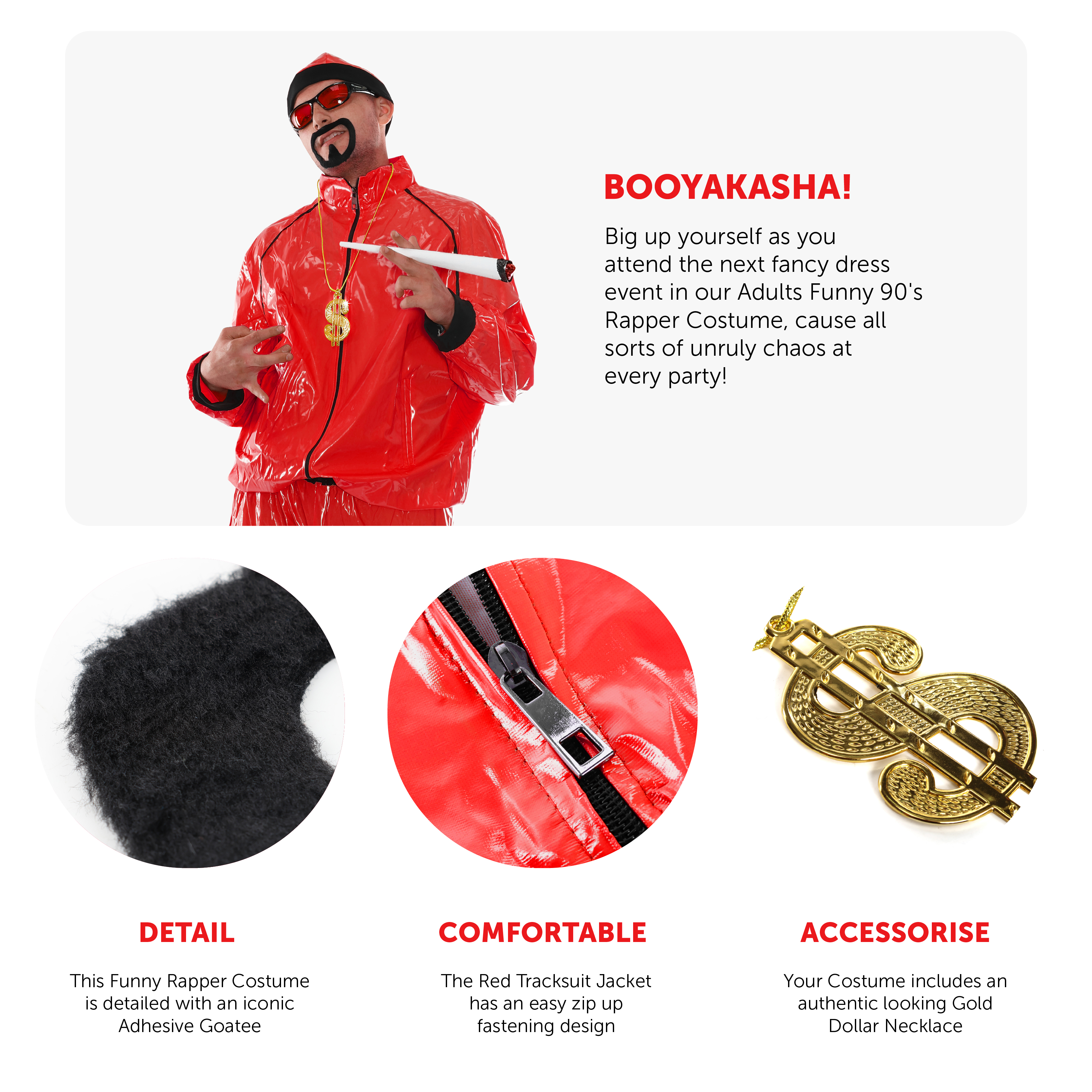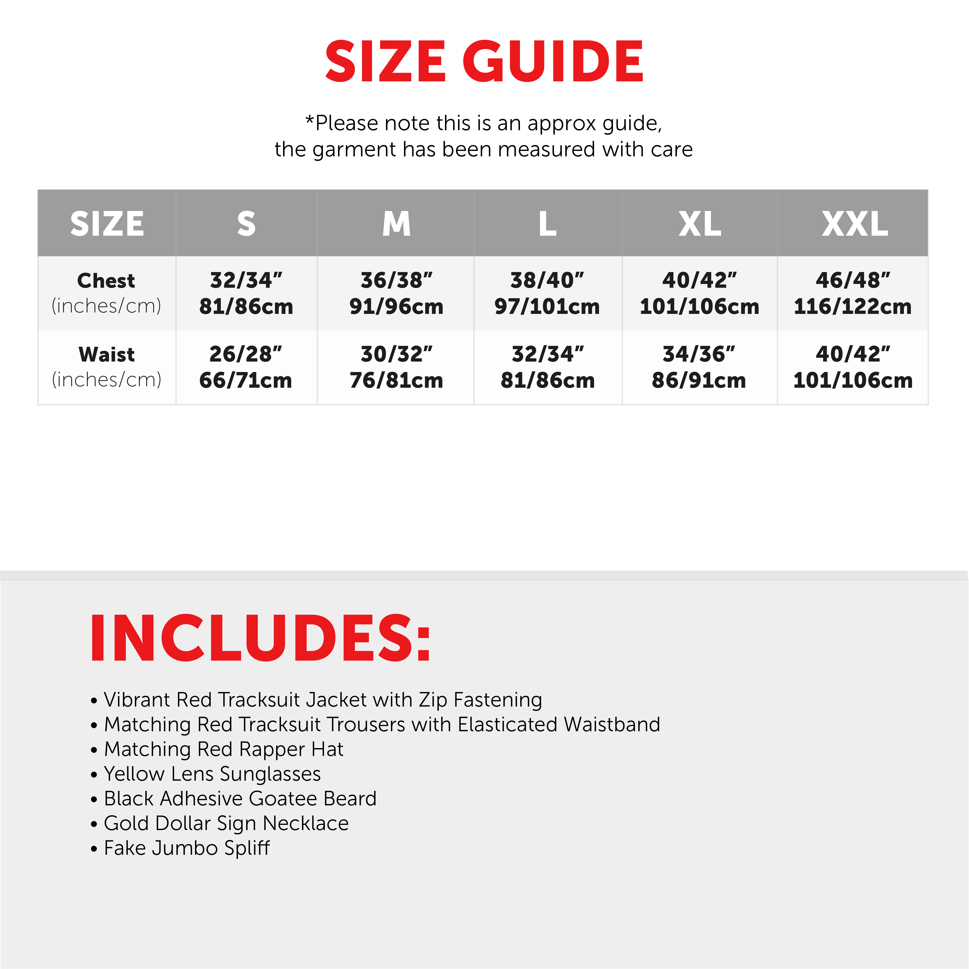 COSTUME DETAILS: Your Funny Rapper Costume includes a vibrant Red Tracksuit Jacket with matching Trousers and Hat, Sunglasses, a Black Adhesive Goatee Beard, a Plastic Dollar Sign Necklace, and a Fake Jumbo Spliff, the perfect Costume set for any fancy dress event!