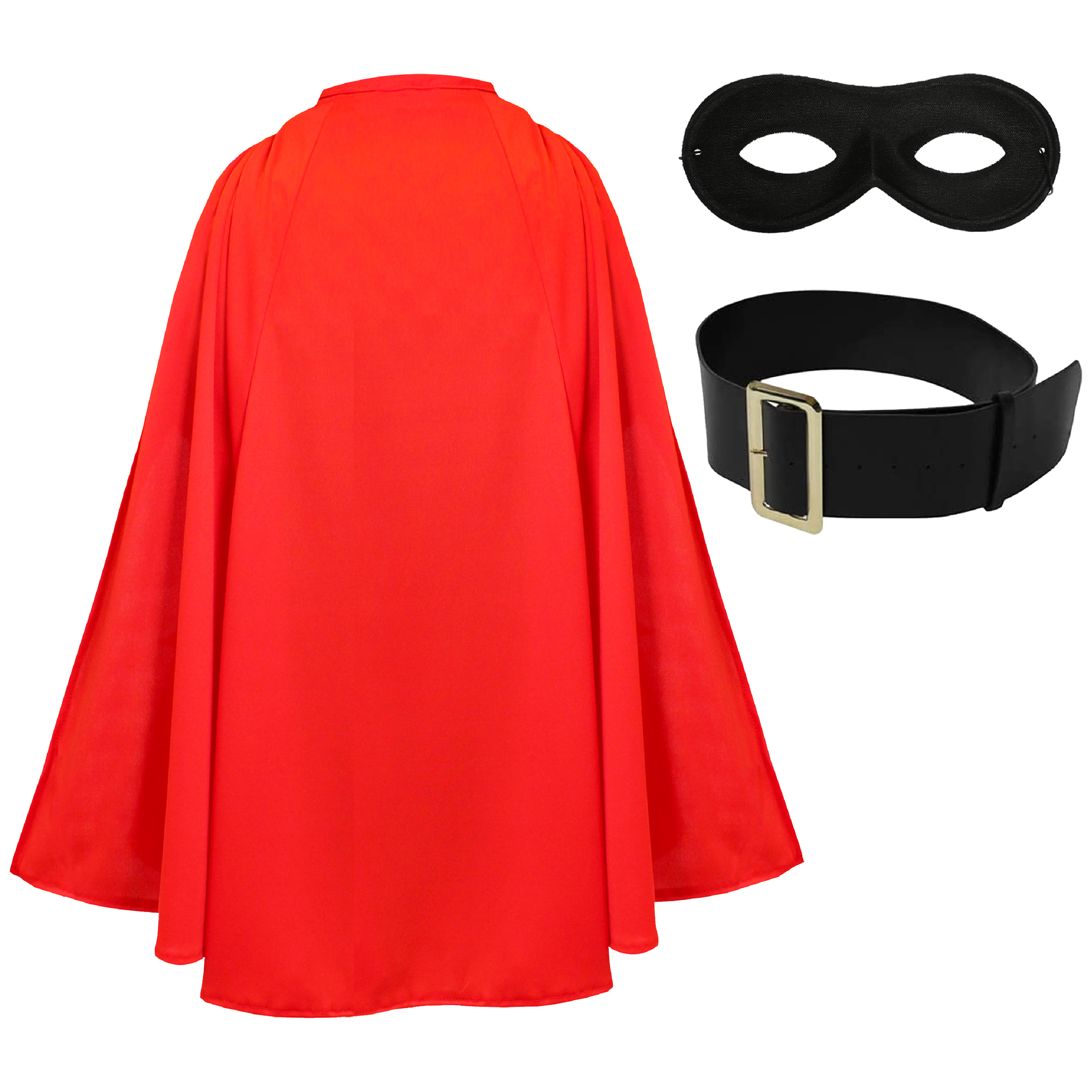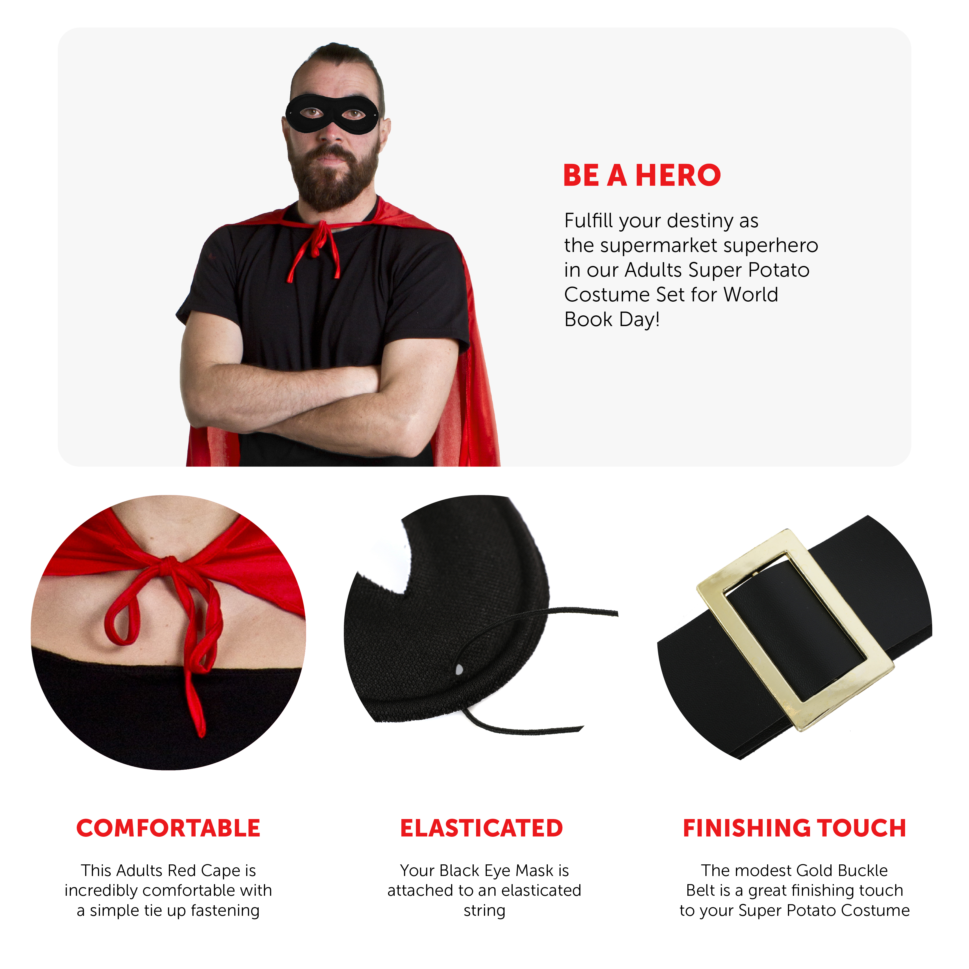 SET DETAILS: Your Adults Super Potato Set includes a Red Hero Cape with easy fastening, a Black Belt, and a Black Superhero Mask with an elasticated strap to complete your hero look!