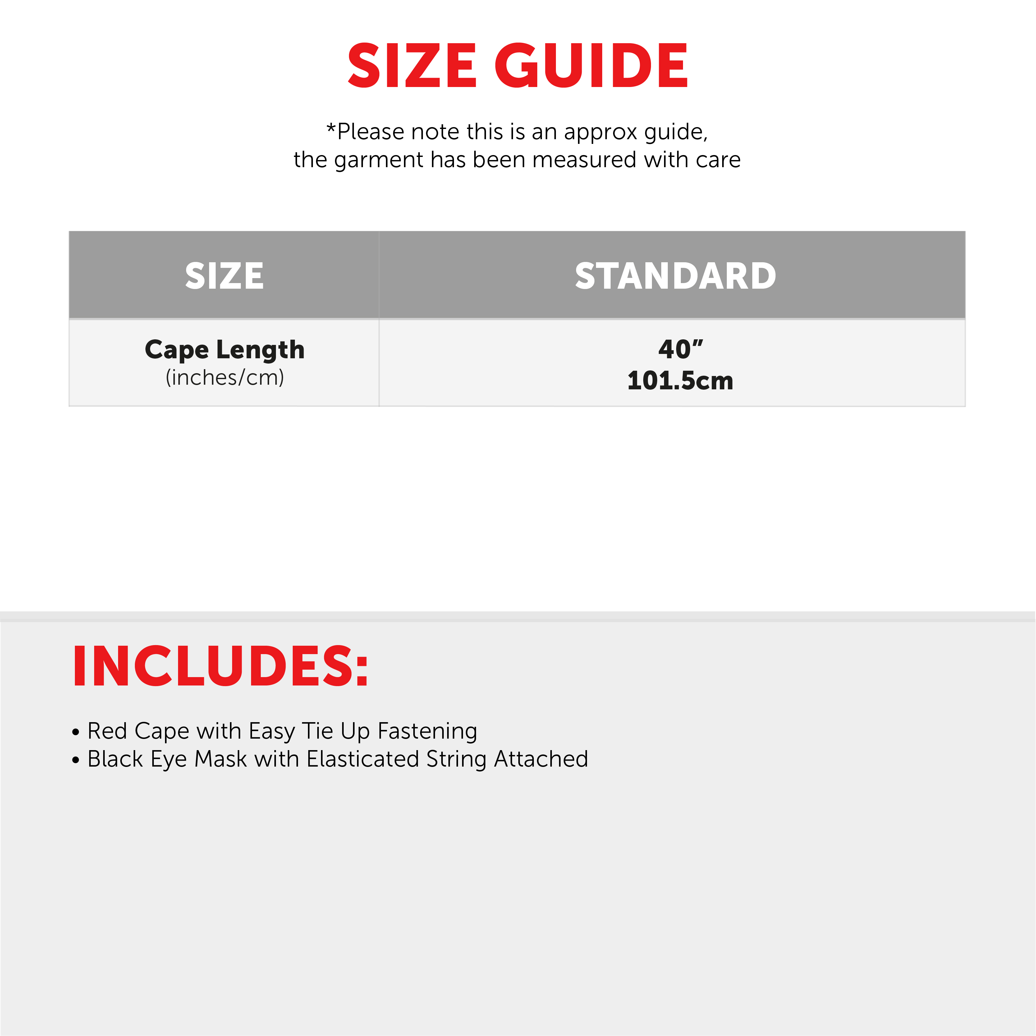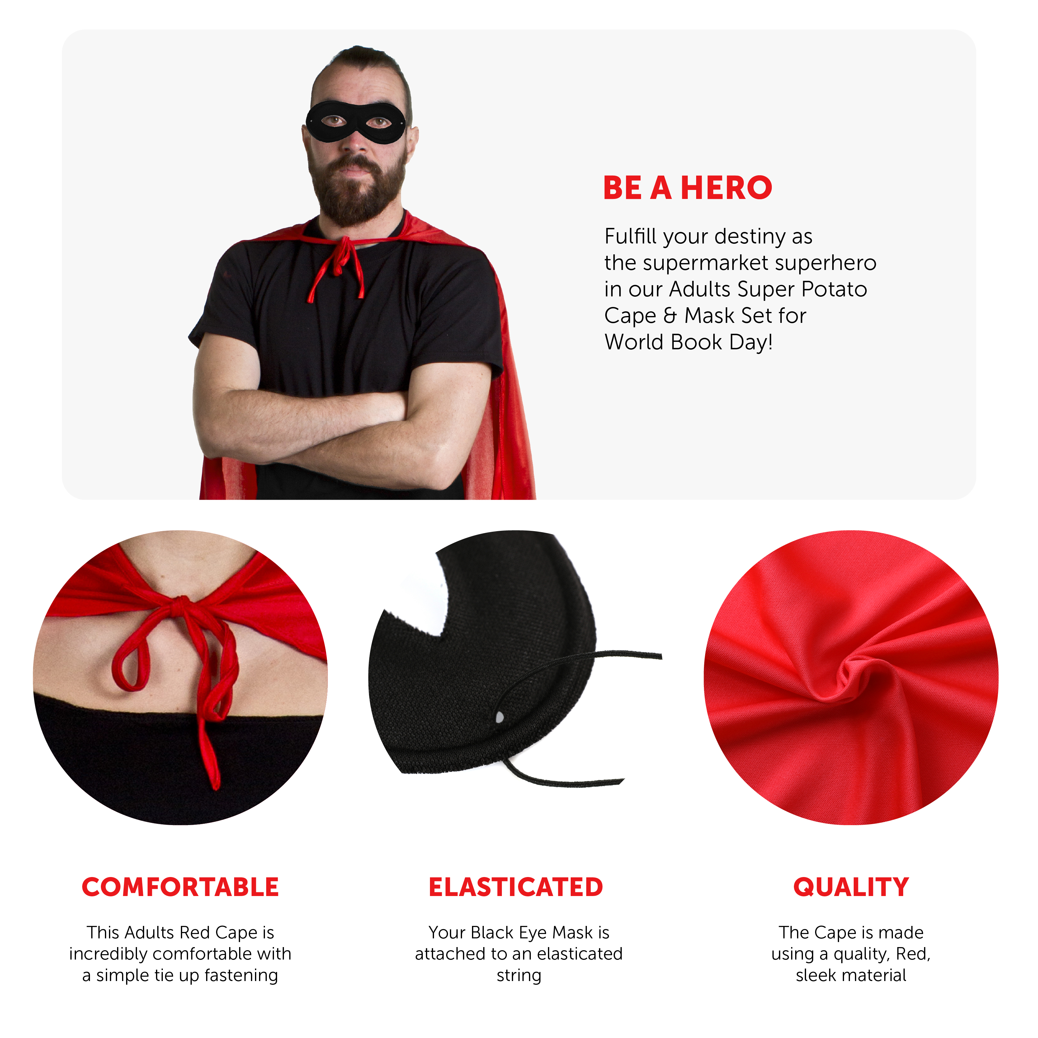 SET DETAILS: Your Adults Super Potato Set includes a Red Hero Cape with easy fastening, and a Black Superhero Mask with an elasticated strap to complete your hero look!