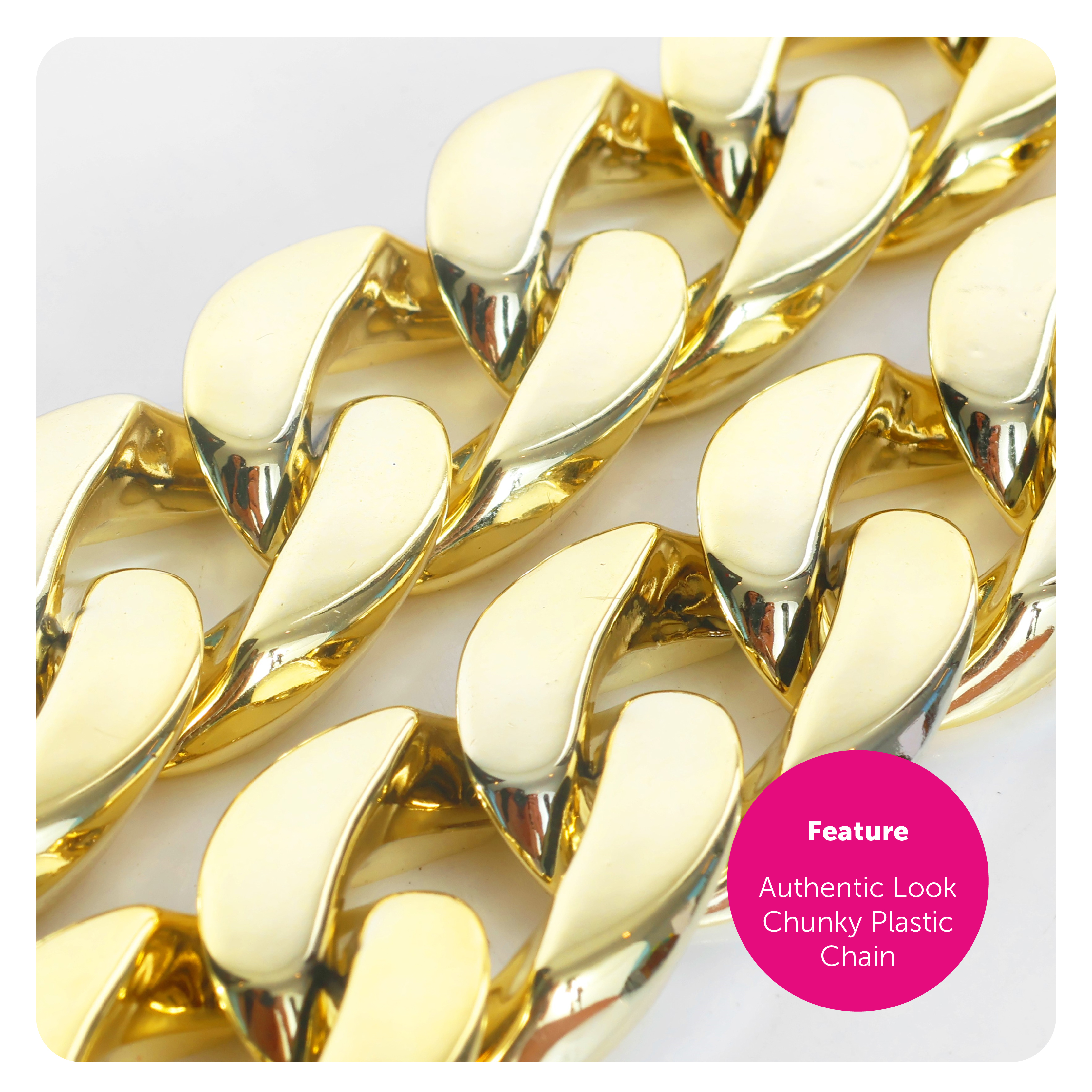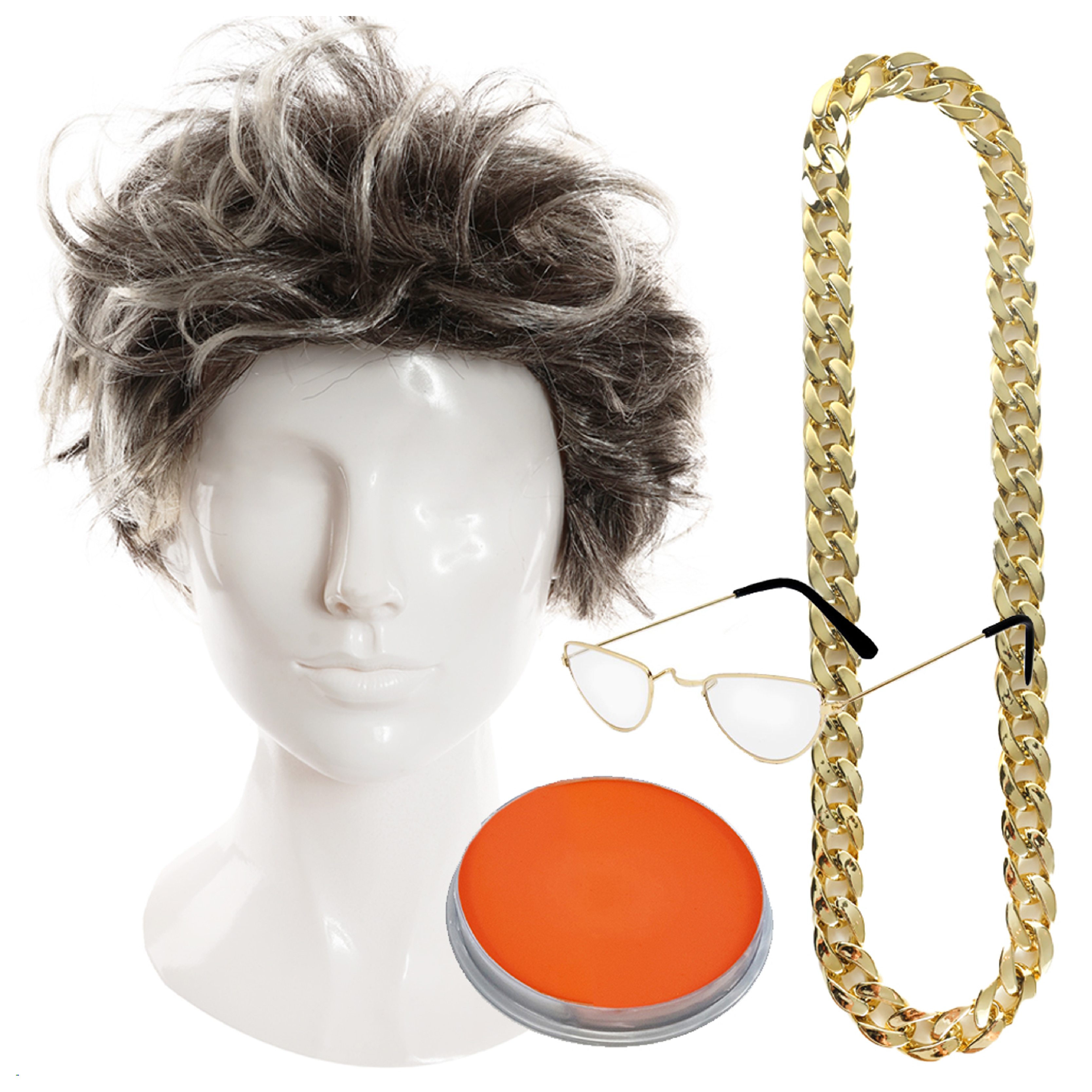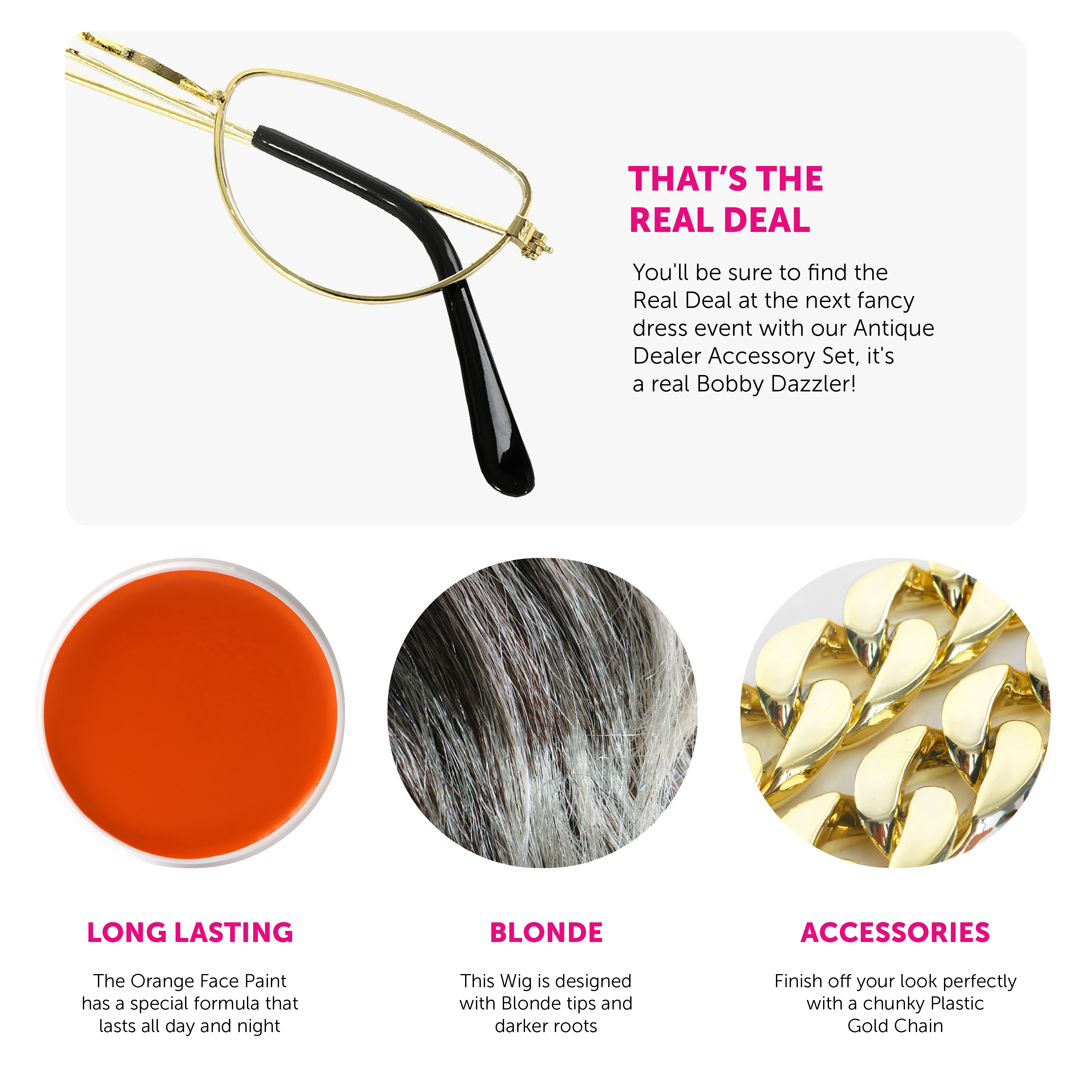 SET INCLUDES: This Antique Dealer Accessory Set includes a Wig, Gold Framed Half Moon Glasses, a Palette of Orange Face Paint, and a Chunky Plastic Gold Chain Necklace, the perfect look for any fancy dress event!