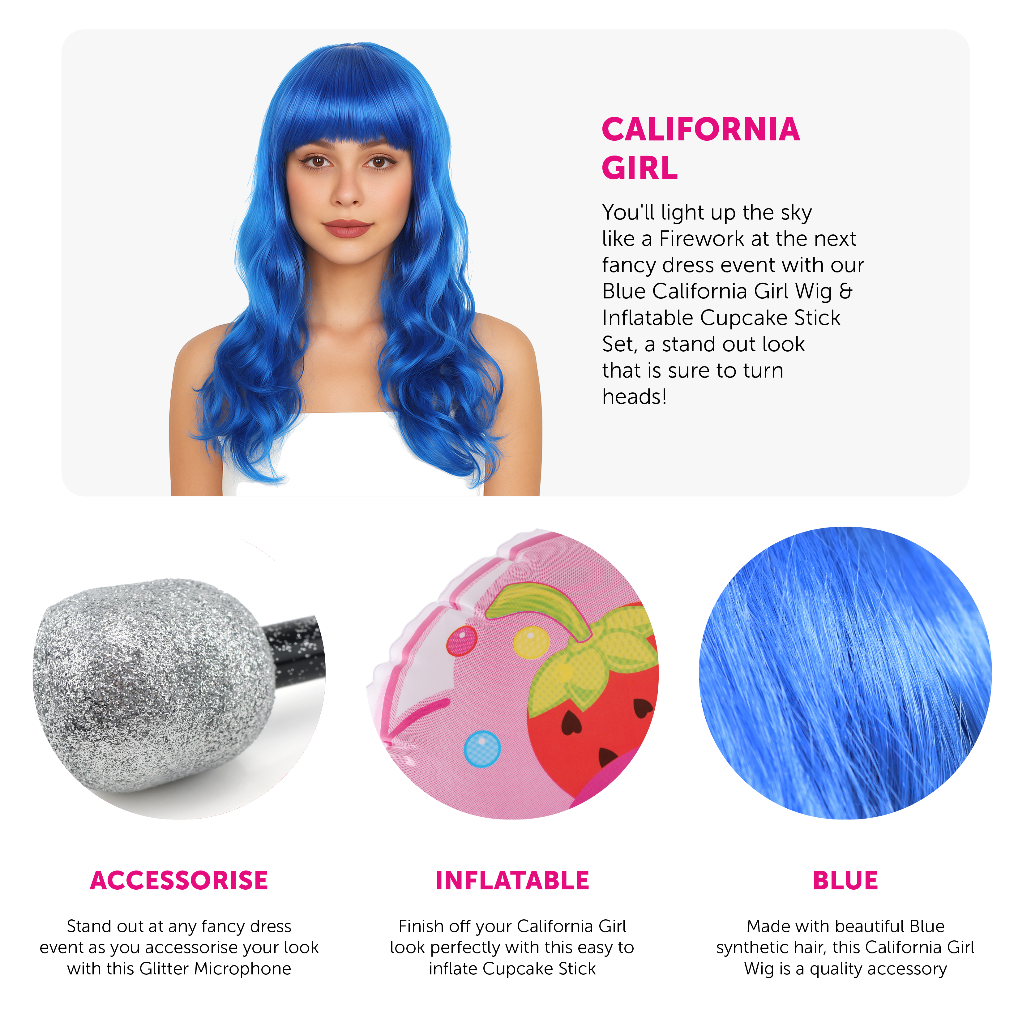 SET INCLUDES: This Accessory Set includes a Mid-length Wavy Blue Wig, designed to fit most adults comfortably, a Glitter Microphone, and an Inflatable Cupcake Stick, with a colourful Cupcake design, detailed with sprinkles and a Strawberry, the perfect Accessory Set for music themed fancy dress events!