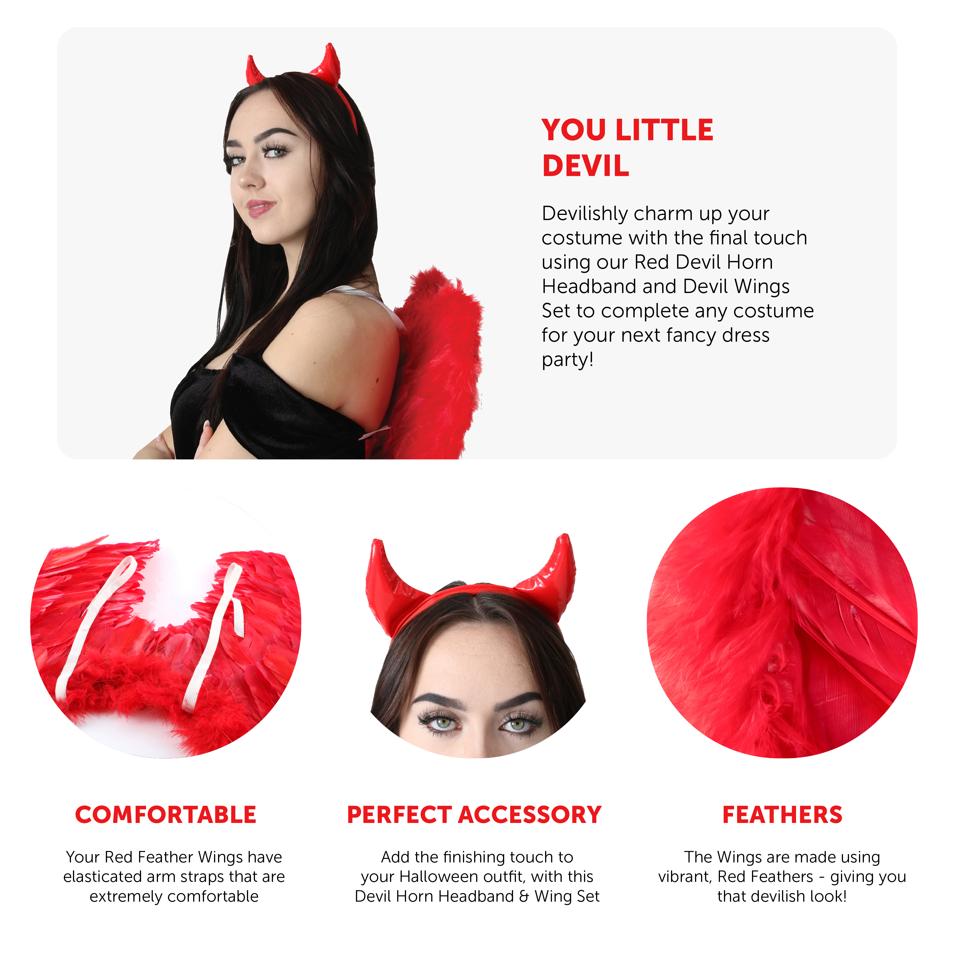 DEVIL HORN HEADBAND & WINGS SET: Devilishly charm up your costume with the final touch using our Red Devil Horn Headband and Devil Wings Set to complete any costume for your next fancy dress party!