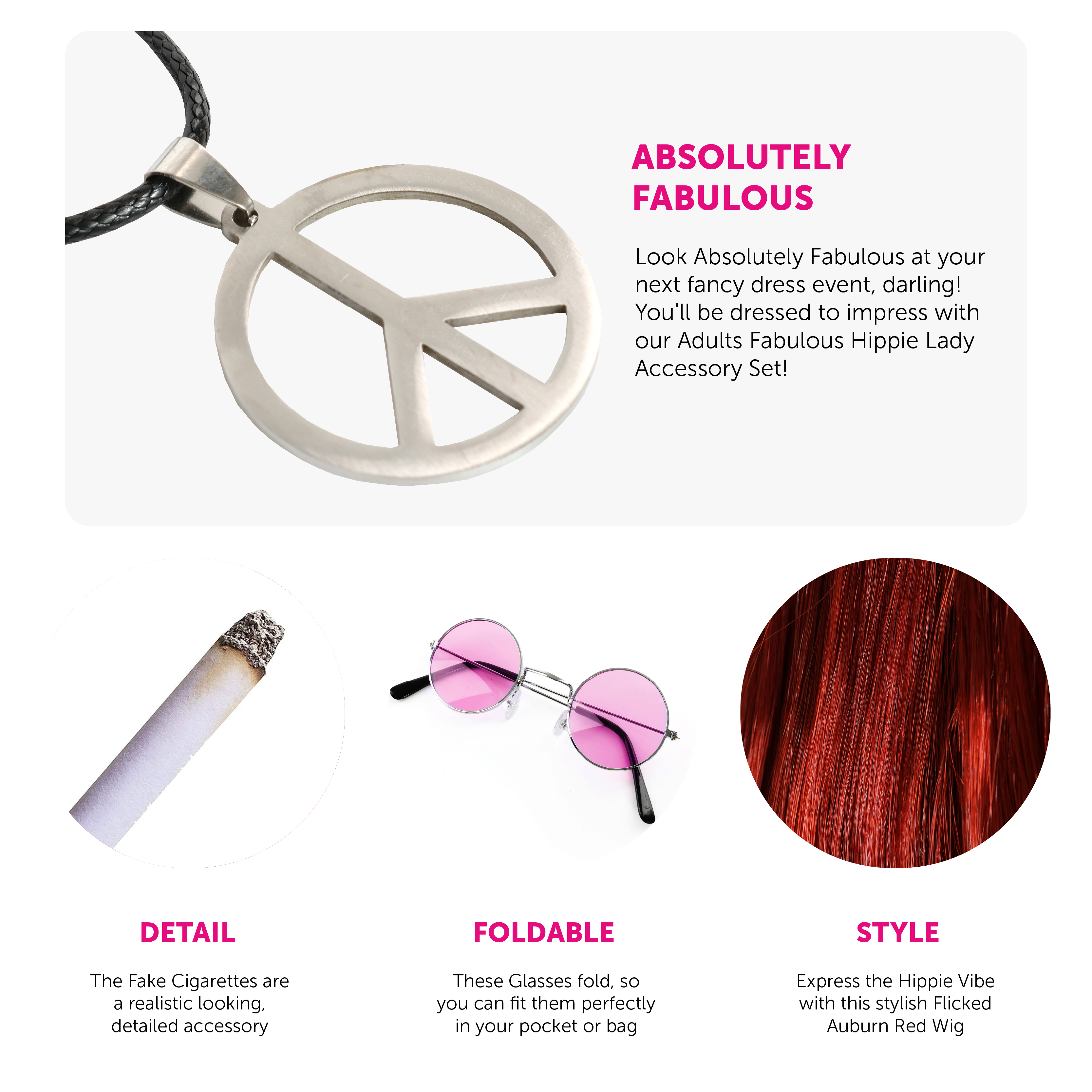 ACCESSORY SET INCLUDES: This Adults Fabulous Hippie Lady Accessory Set includes Pink Round Lens Glasses, a Long Auburn Flicked Wig, a Black Rope Necklace with a Silver Peace Pendant, a Pack of 2 realistic looking Fake Cigarettes, and
