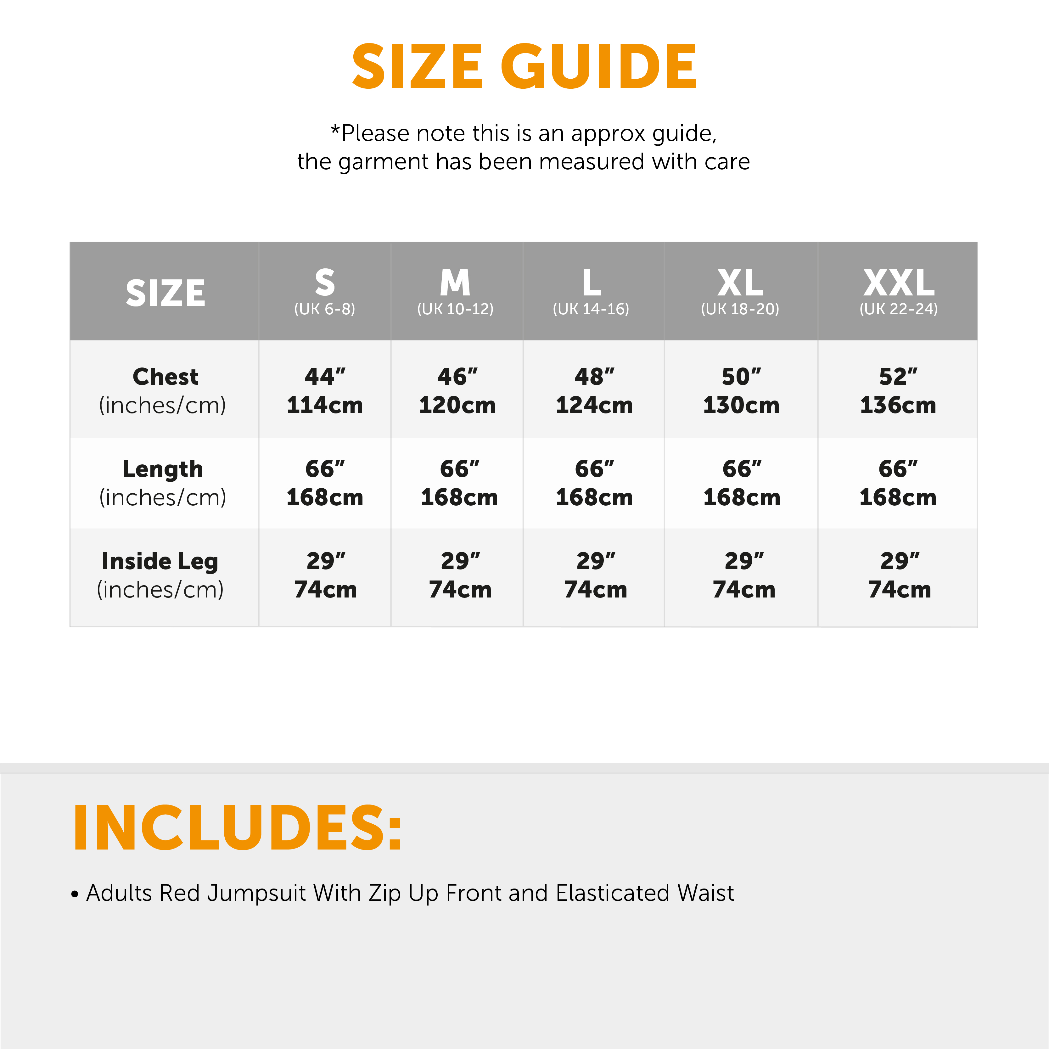 AVAILABLE IN MULTIPLE SIZES: Your Adults Red Jumpsuit Costumes are available in multiple sizes, from Small to XX-Large: