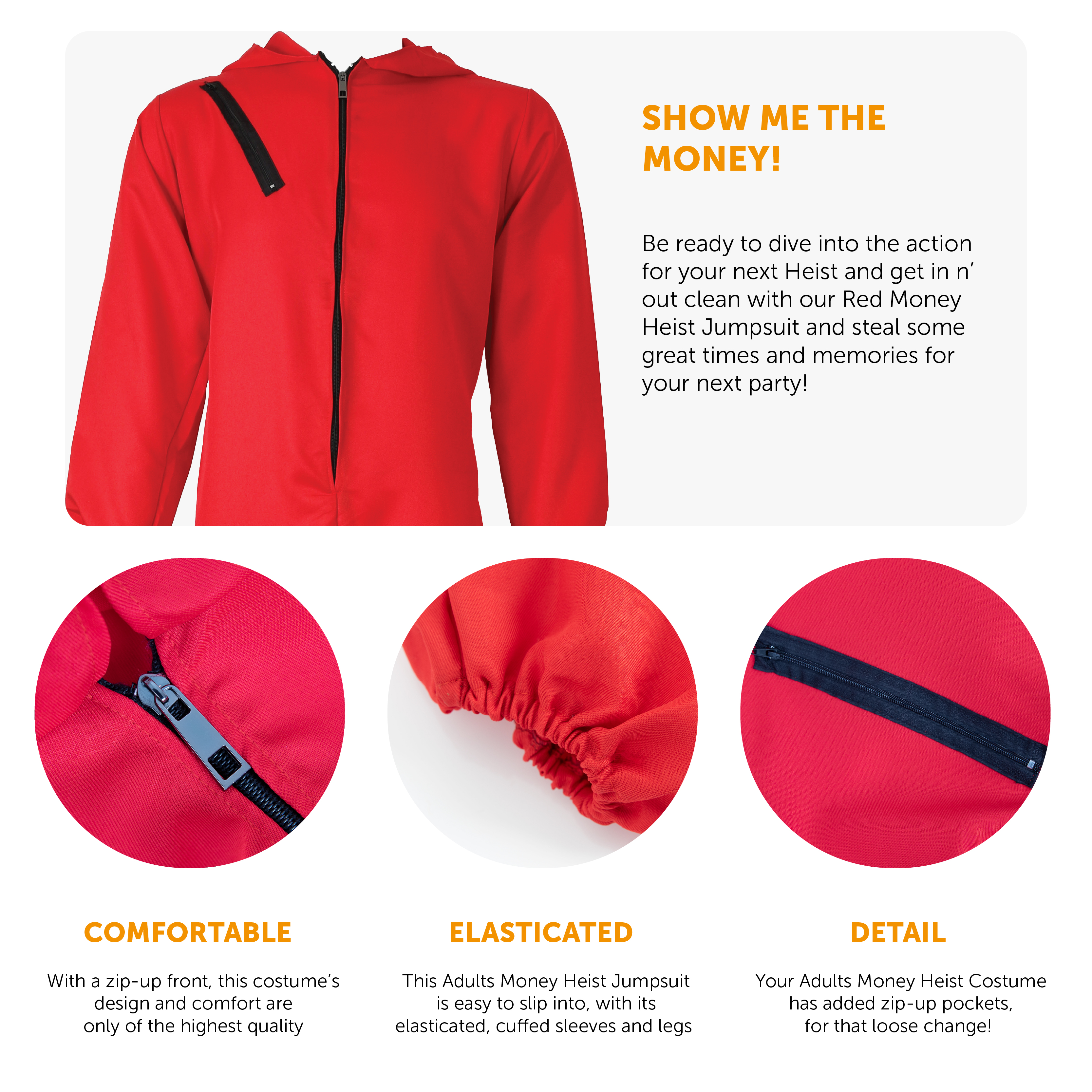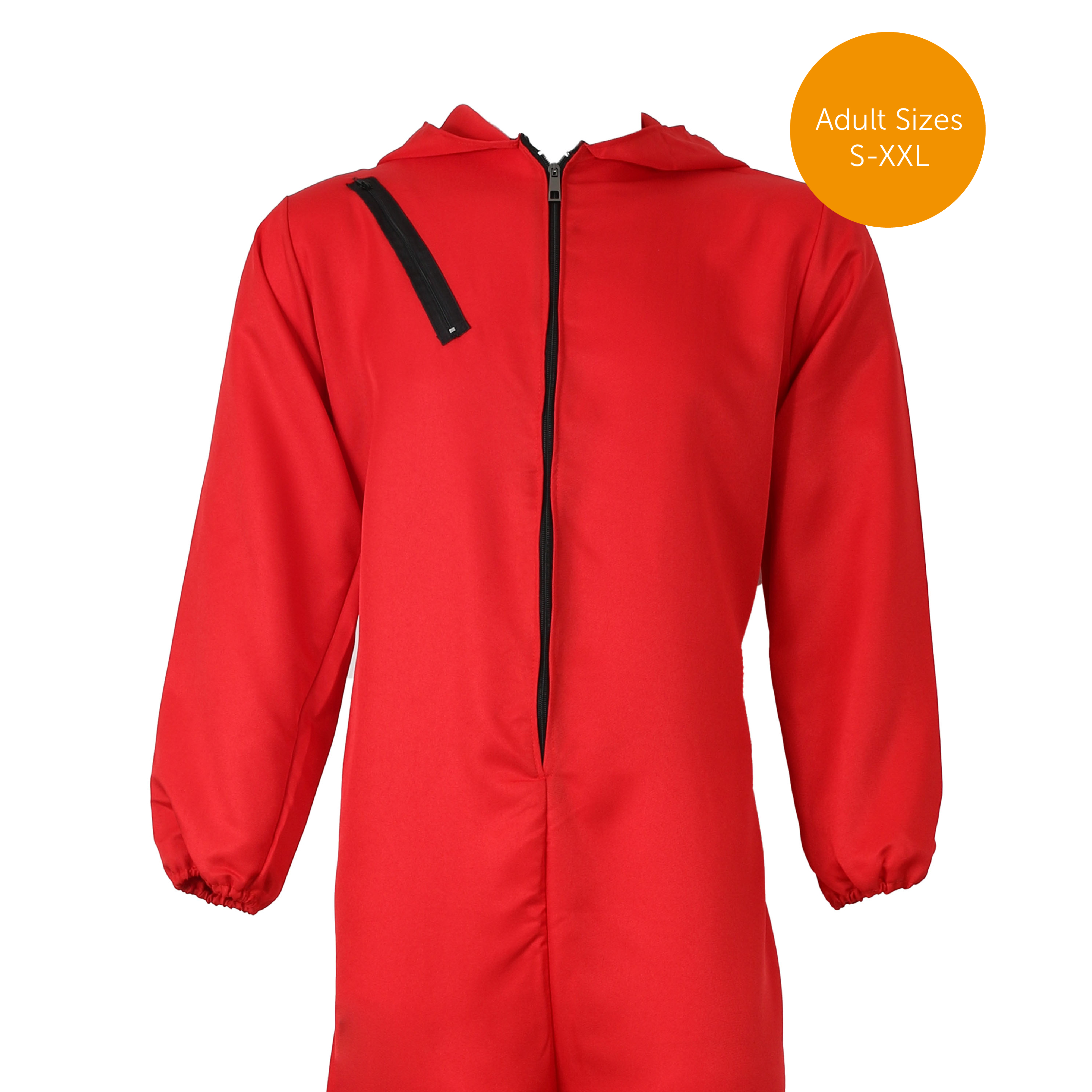 RED JUMPSUIT COSTUME DETAILS: Your Adults Money Heist Costume Set includes a Red Adult sized Money Heist Jumpsuit, with a main and small zipper, and an attached hood to complete your look!