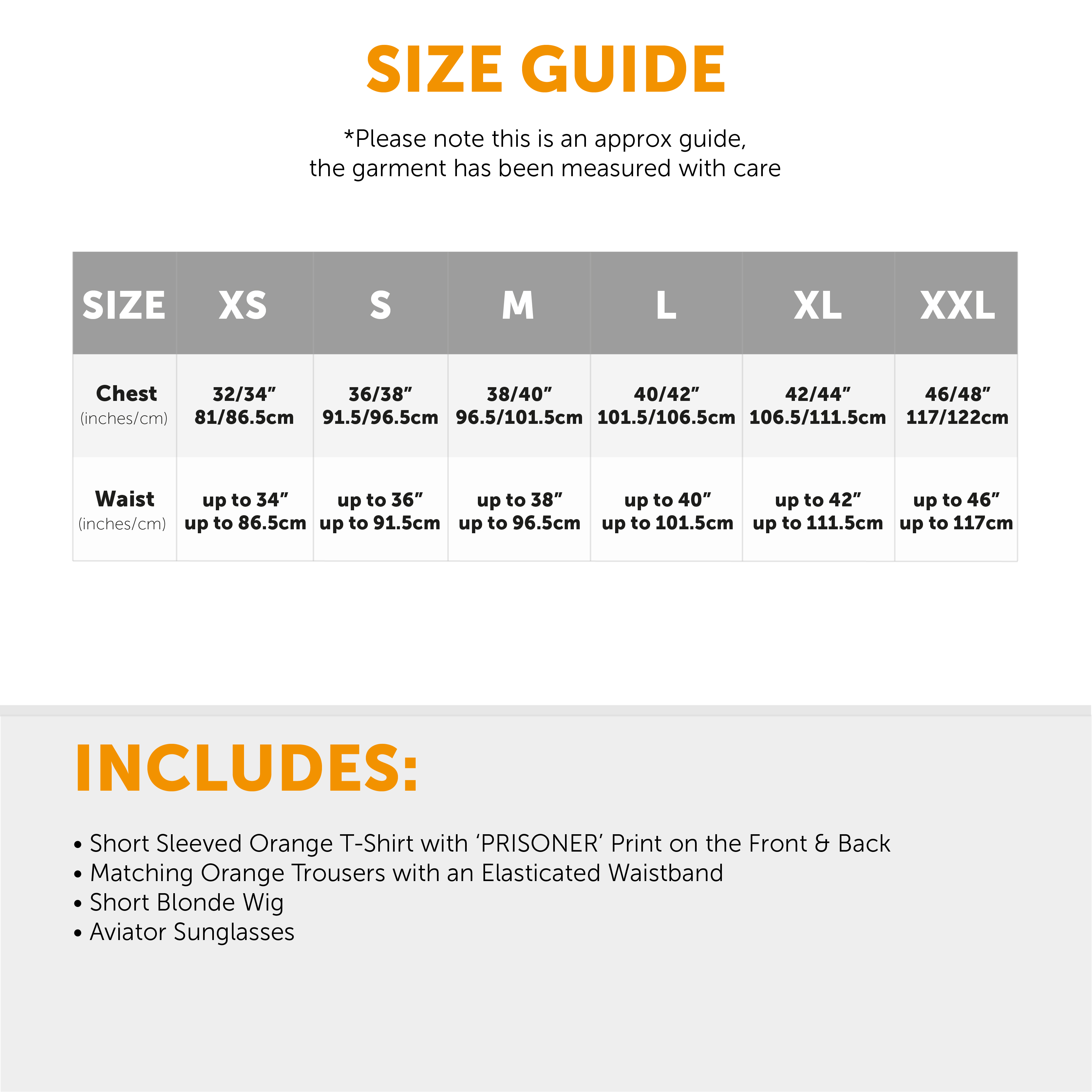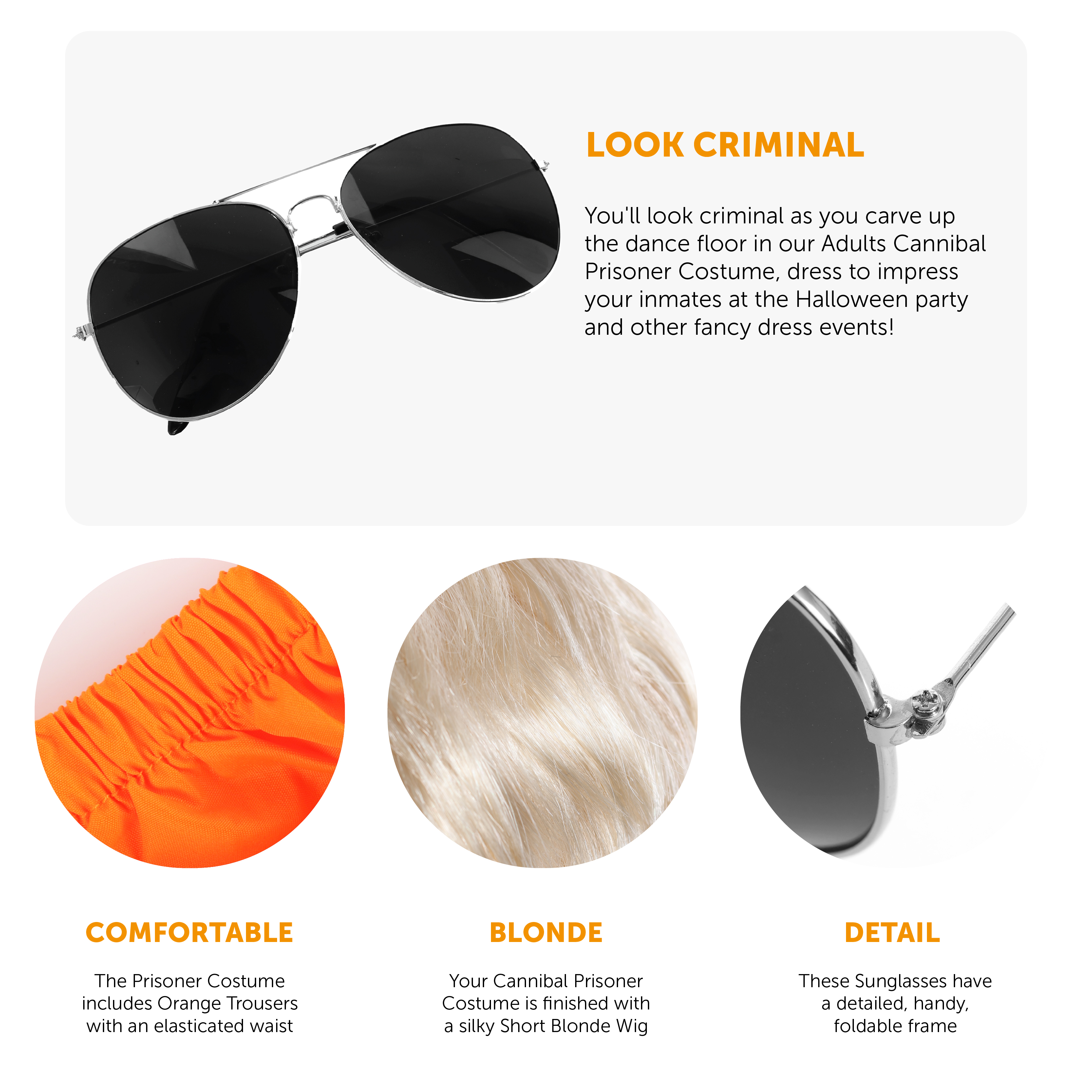 CANNIBAL PRISONER COSTUME: This Adults Cannibal Prisoner Costume includes an Orange Prisoner Convict Top with ‘PRISONER’ print on front and back, matching Orange Trousers with an Elasticated Waistband, a pair of Aviator style Sunglasses and a Short Blonde Wig!
