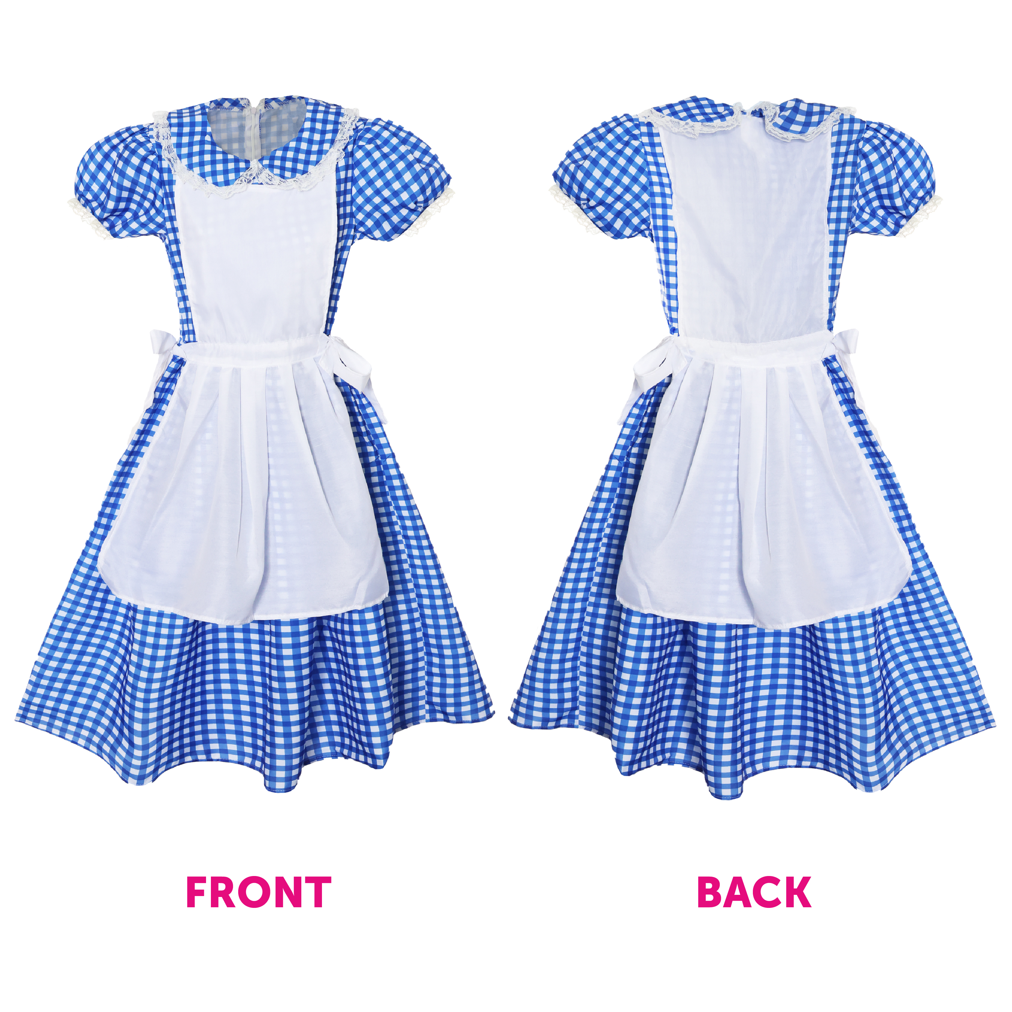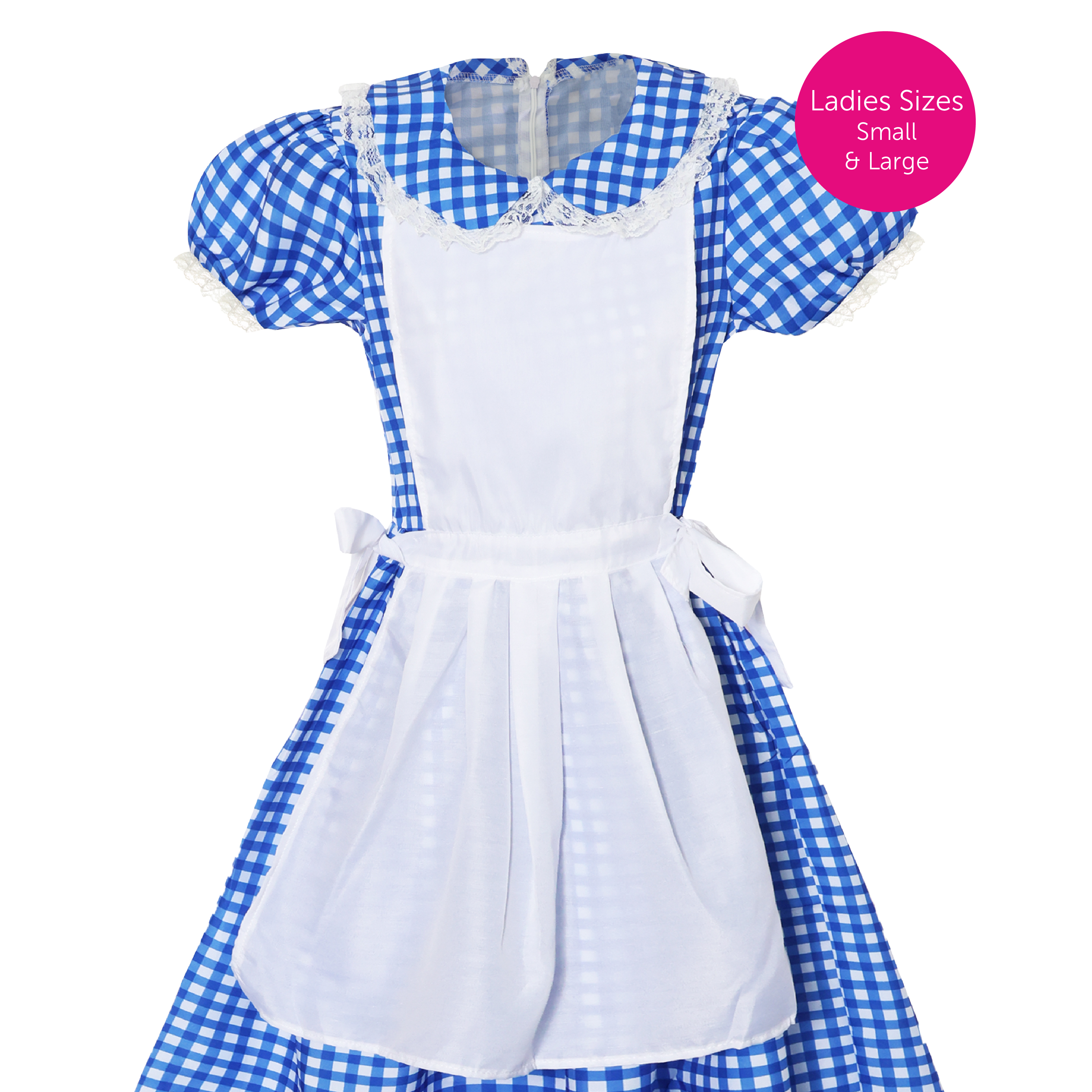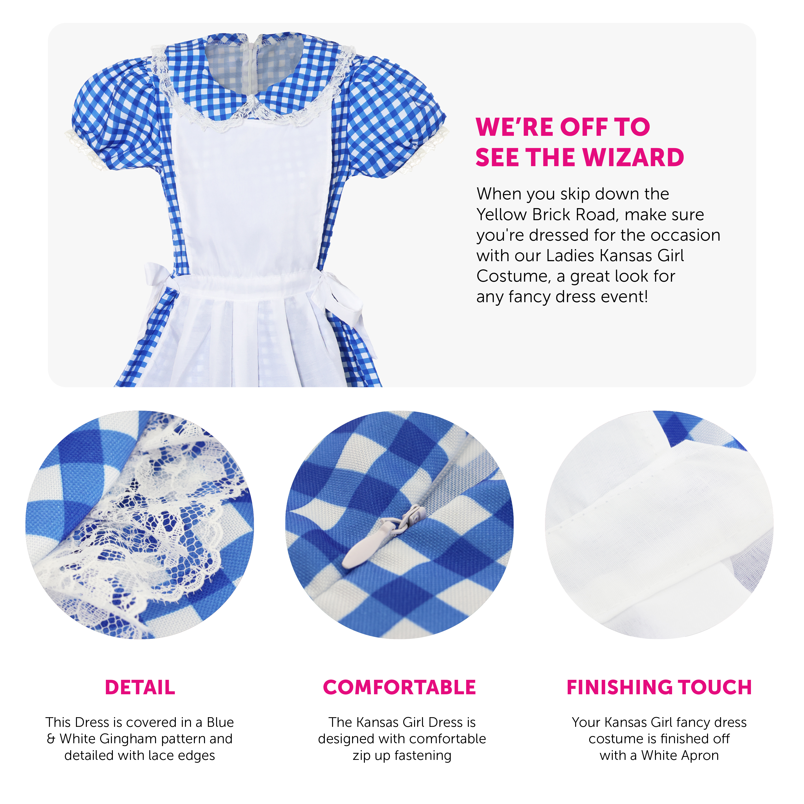 COSTUME DETAILS: Your Kansas Girl Costume is a Blue and White Gingham Dress with easy zip up fastening, and a White Apron attached, the perfect look for any fancy dress event!