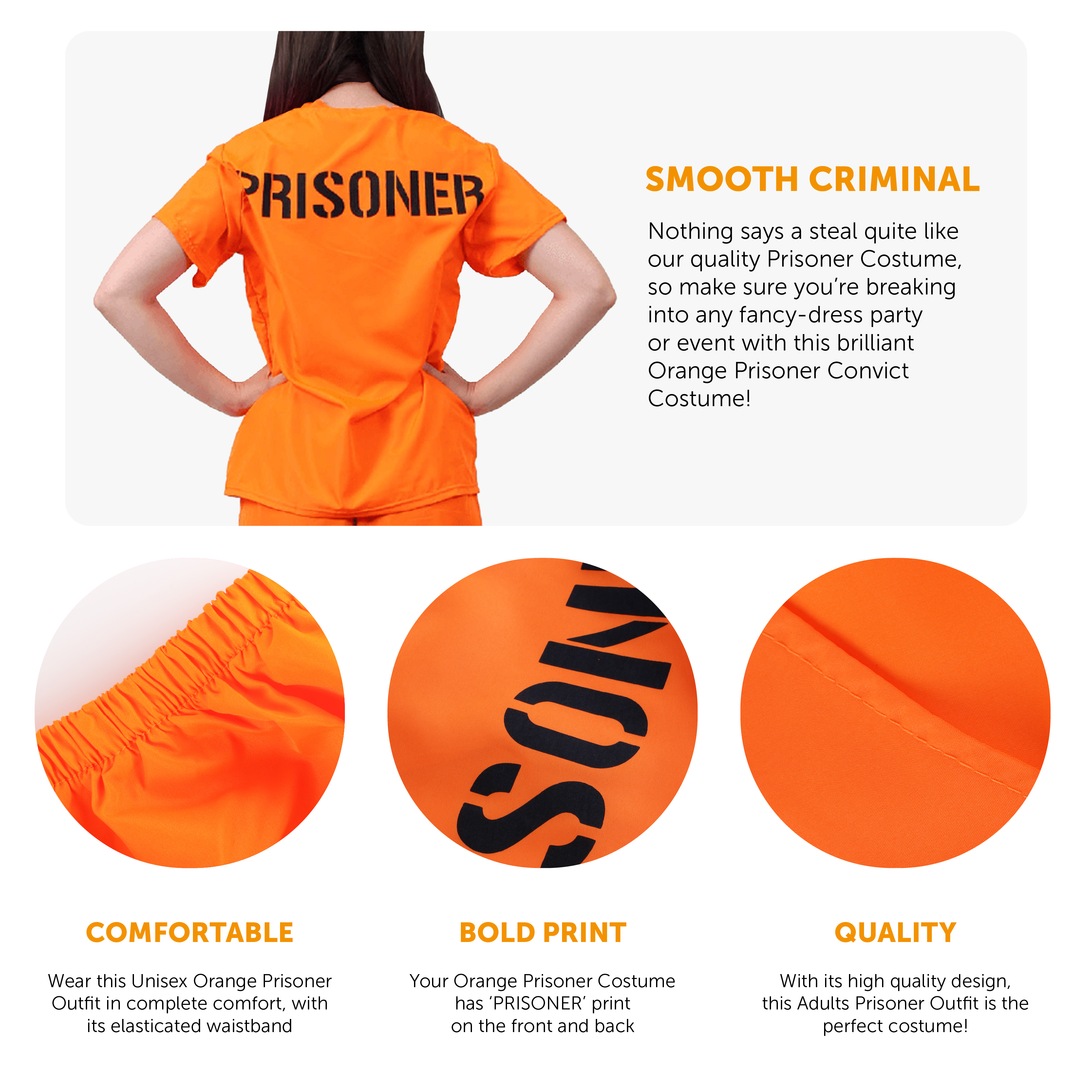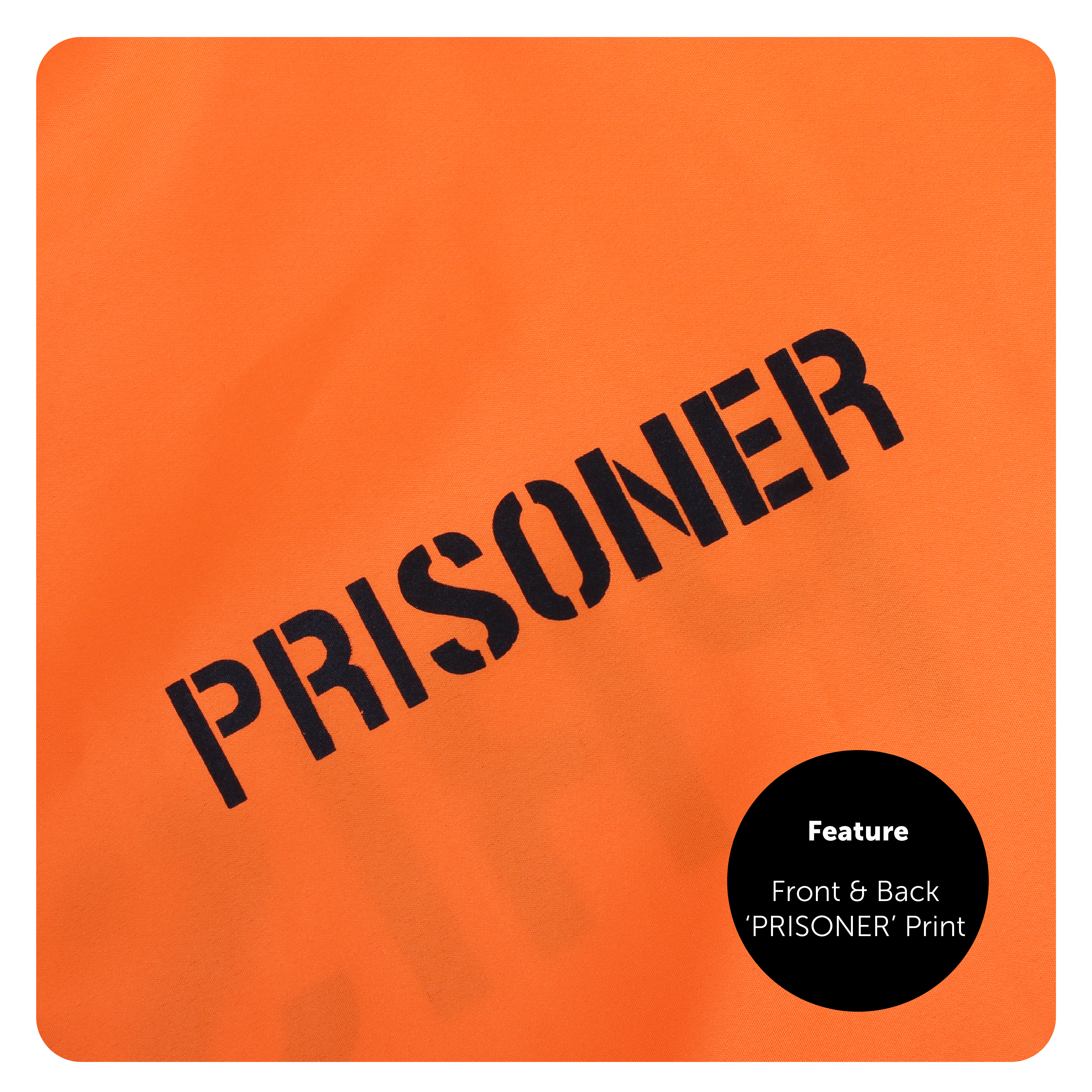 COSTUME INCLUDES: This Adults Prisoner Costume Set includes a vibrant Orange Top with ‘PRISONER’ printed on the front and back, matching Orange Trousers with an elasticated waistband, and Plastic Shackles, the perfect Costume for any fancy dress party!