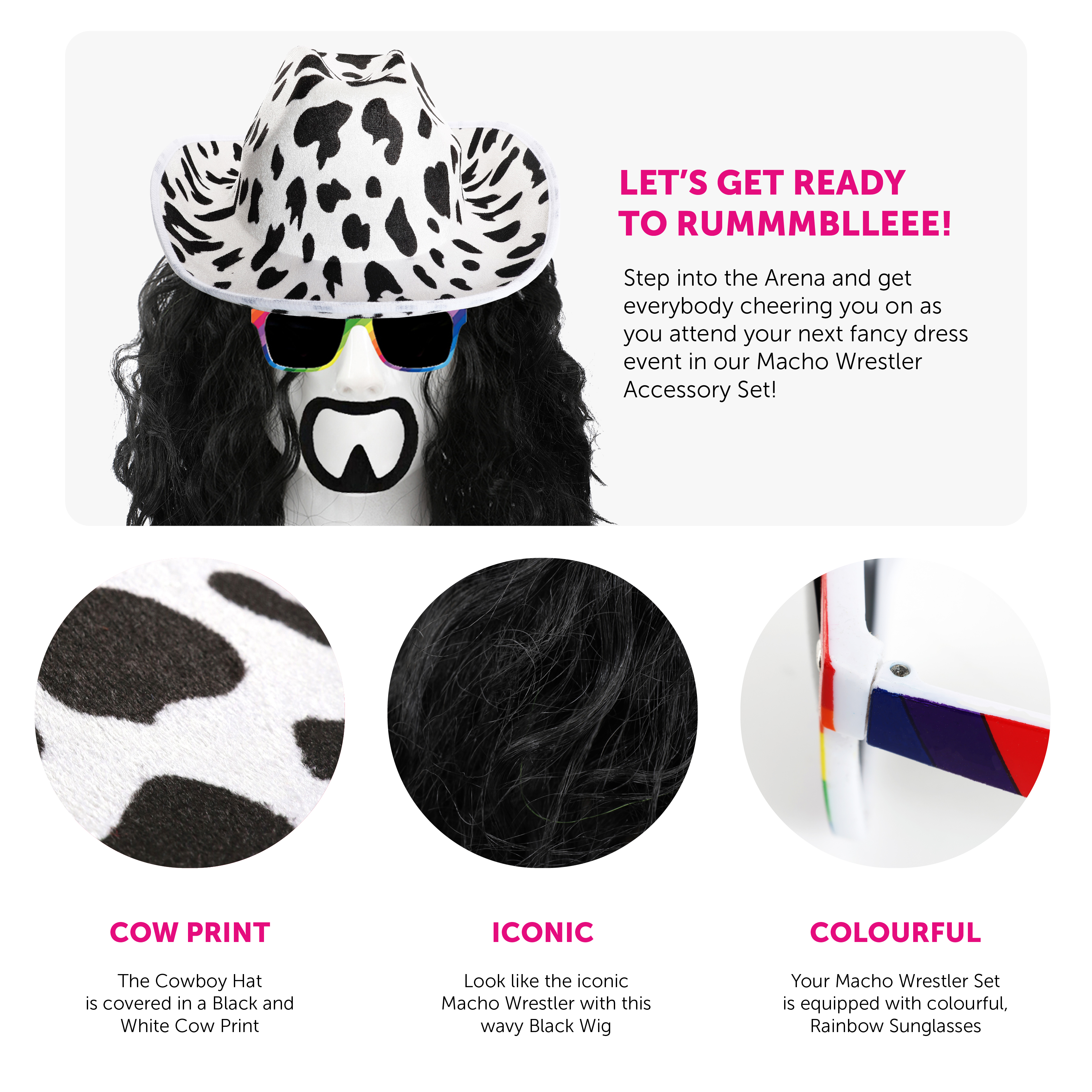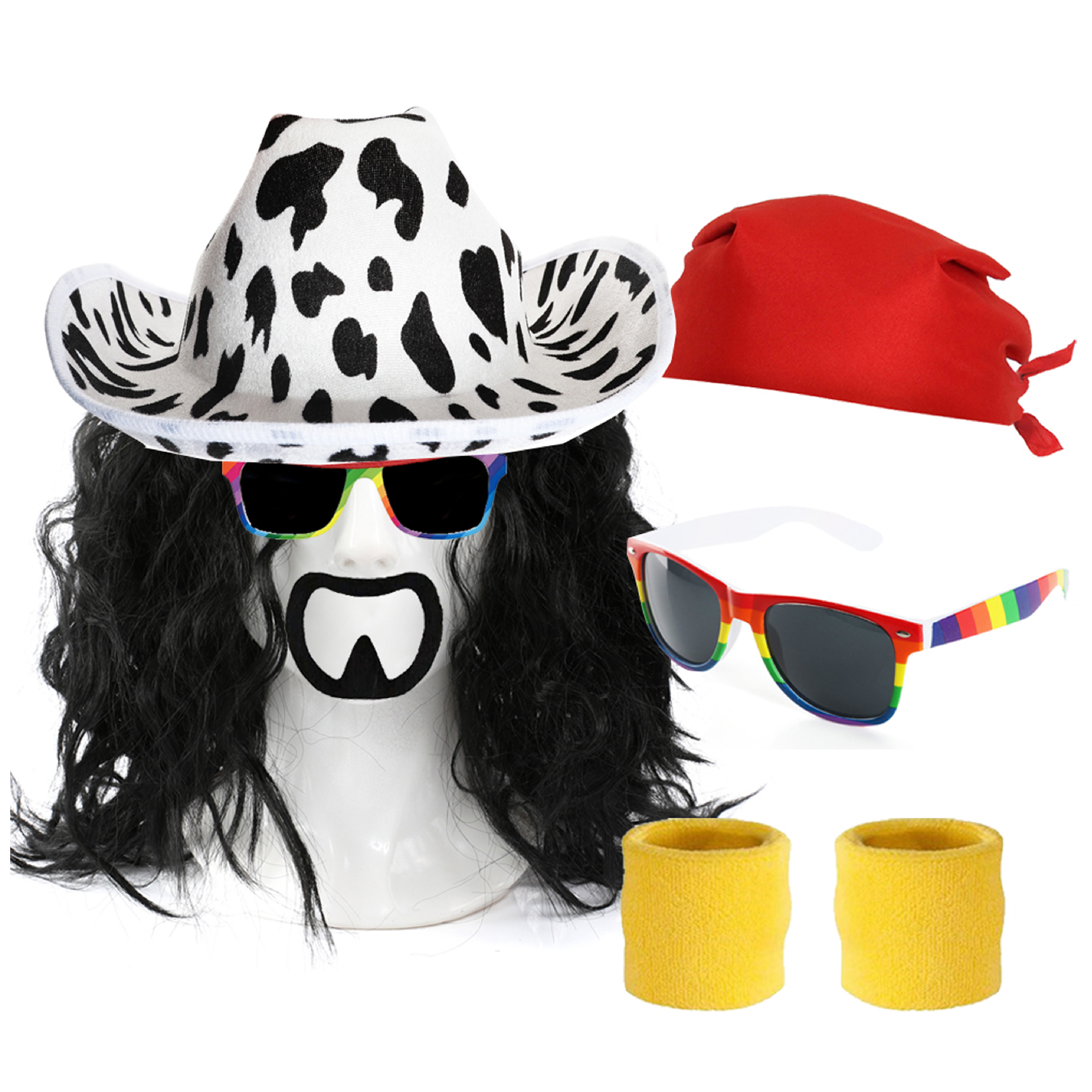 SET INCLUDES: This Macho Wrestler Accessory Set includes a relaxed Black Afro Wig, an Adhesive Black Goatee, a White and Black Cow Print Cowboy Hat, Sunglasses with colourful Rainbow Frames, a Red Bandana, and a pair of Yellow Sweatbands, to help you finish off your desired look!