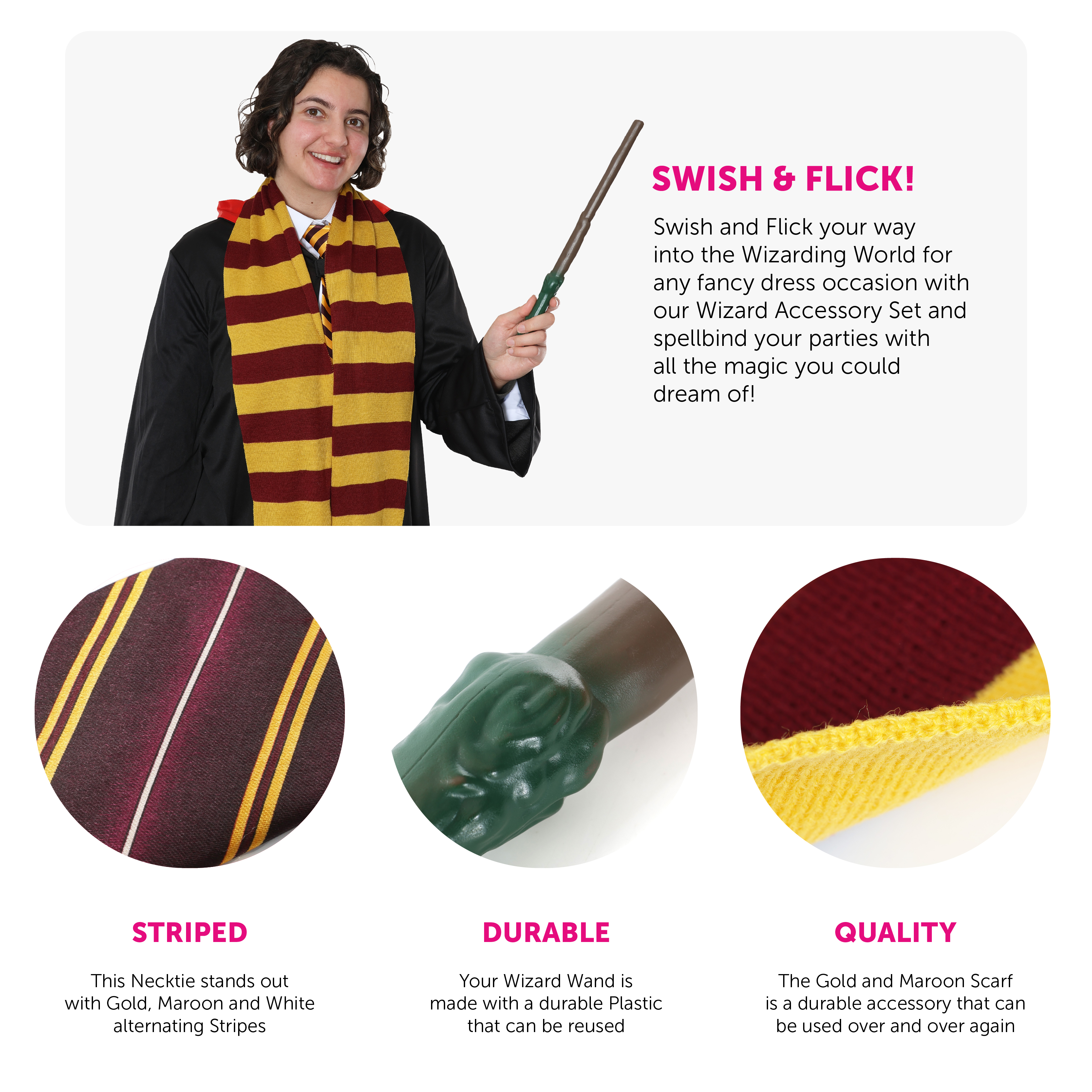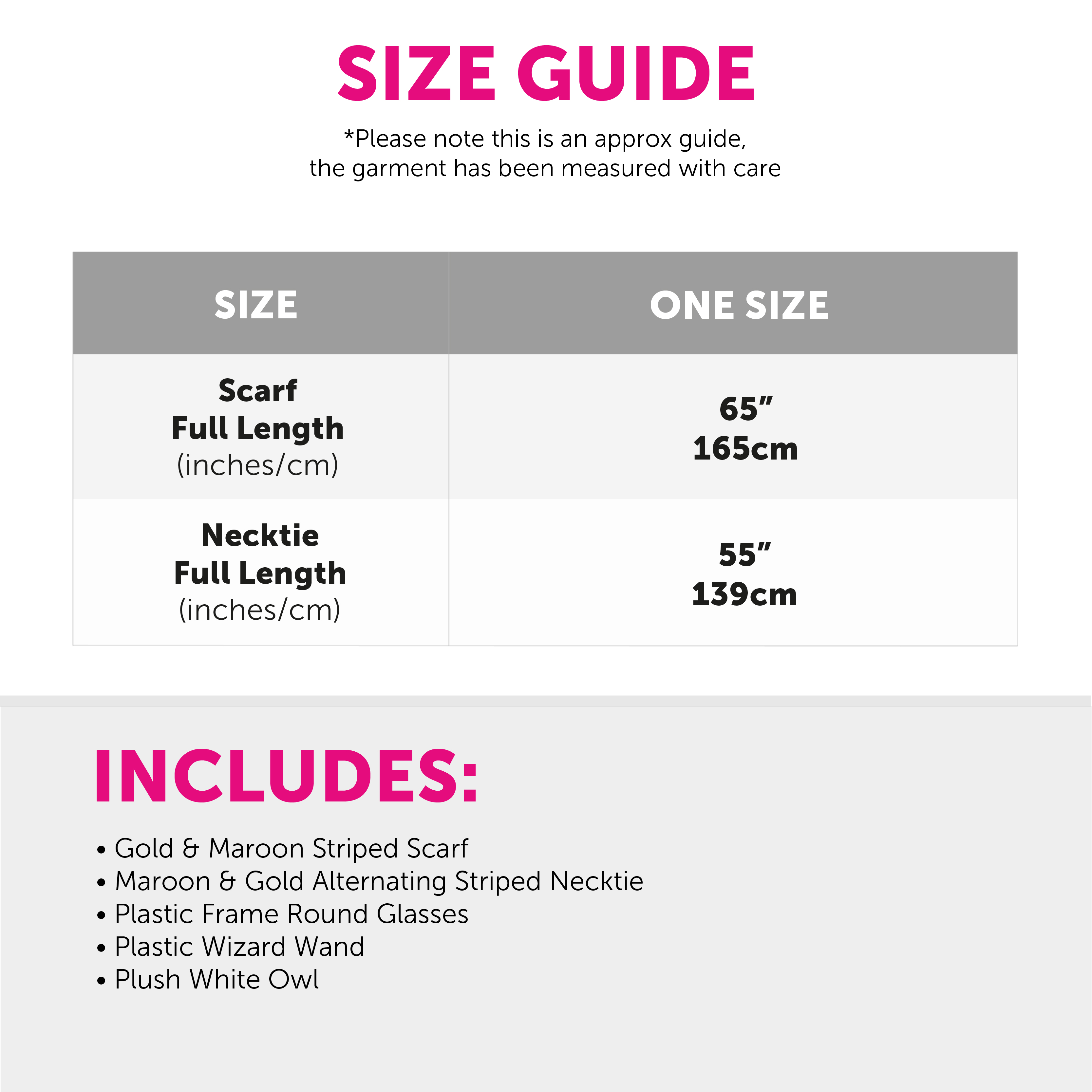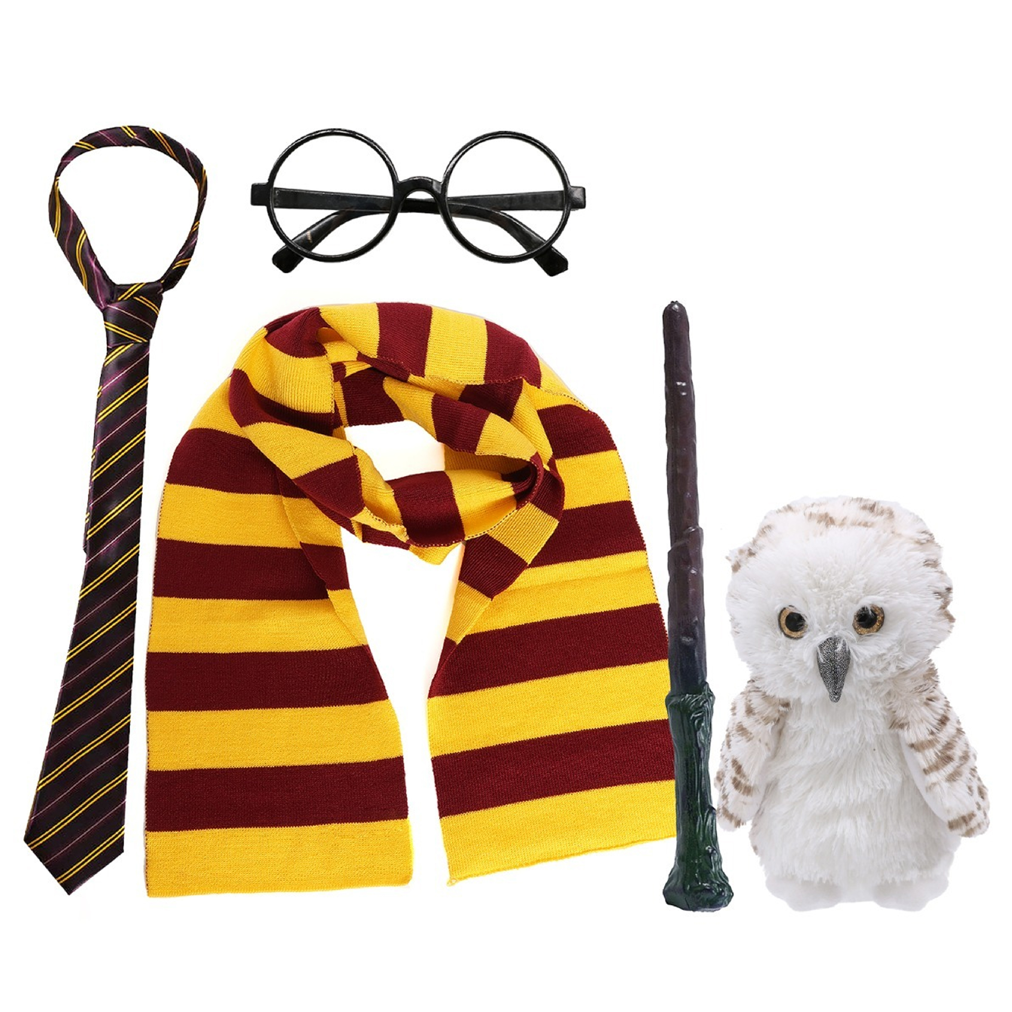 SET INCLUDES: Your Wizard Accessory Set includes a Maroon and Gold Striped Scarf, a Striped Tie, Round Glasses with Plastic Frames, a Plastic Wizard Wand, and a Plush White Owl!