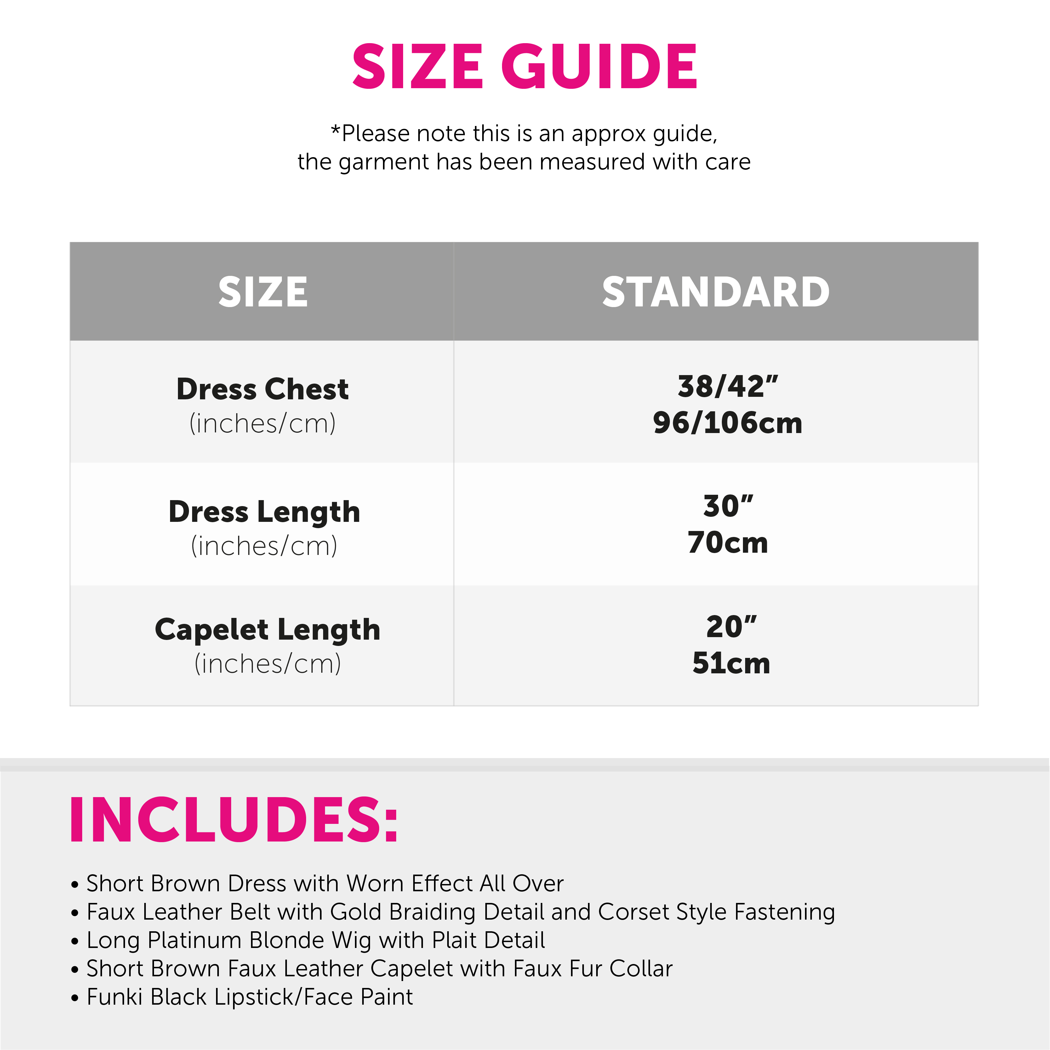 COSTUME DETAILS: Your Ladies Viking Warrior Costume includes a beautifully wavy, Long Blonde Wig with a delicate Plaited style on top and down both sides, a loose fitting, short Brown Dress with a rough, worn effect all over, a Faux Leather Belt with Corset style fastening and Gold Braiding detail, a miniature Brown, Faux Leather Cape with a Faux Fur Collar and a stick of Funki Black Face Paint/Lipstick!