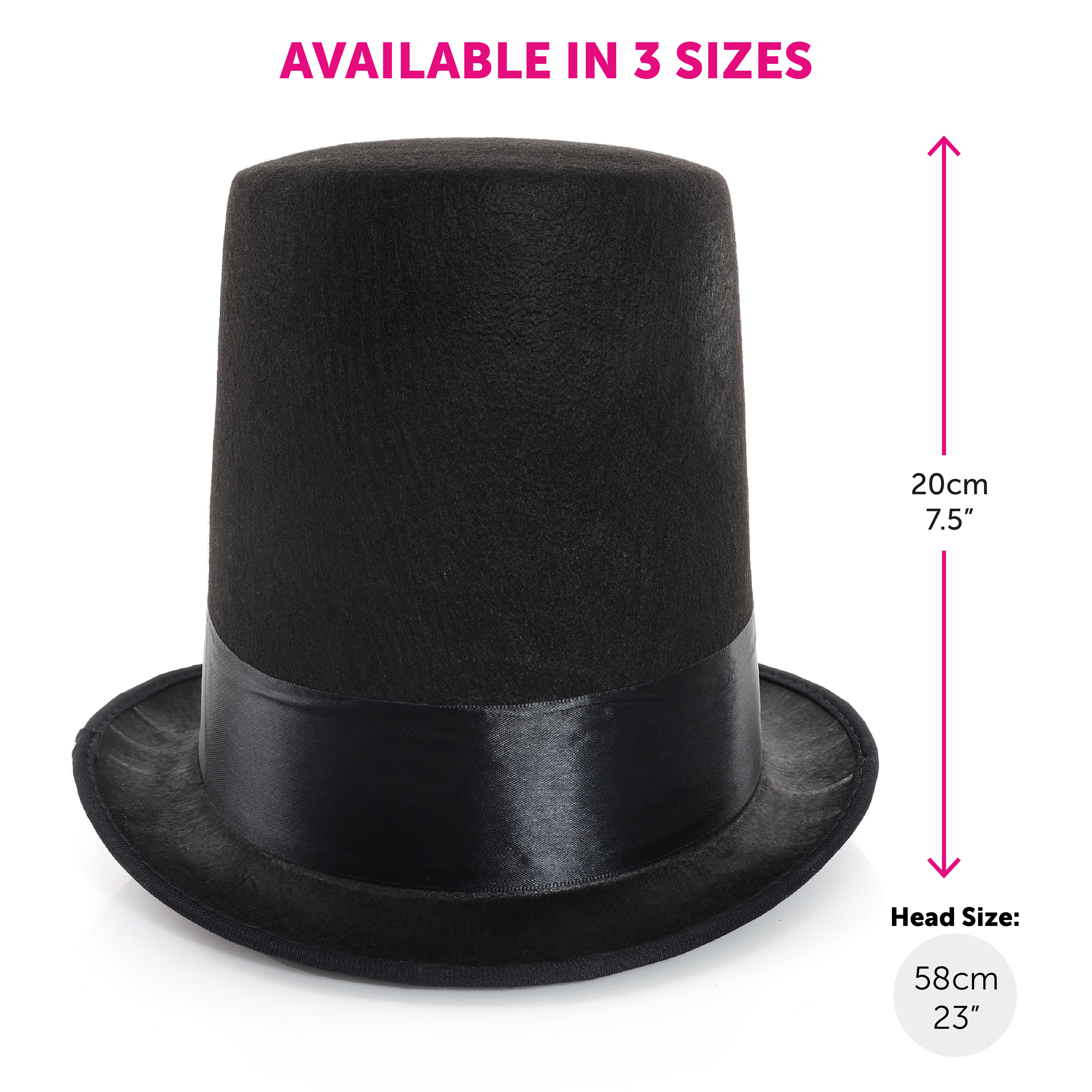 GREAT SIZE: This Adults Black Stovepipe Top Hat is 20cm (7.5") tall and measures a head size of 58cm (23"), the perfect sized Hat for any Adult to accessorise your outfit!