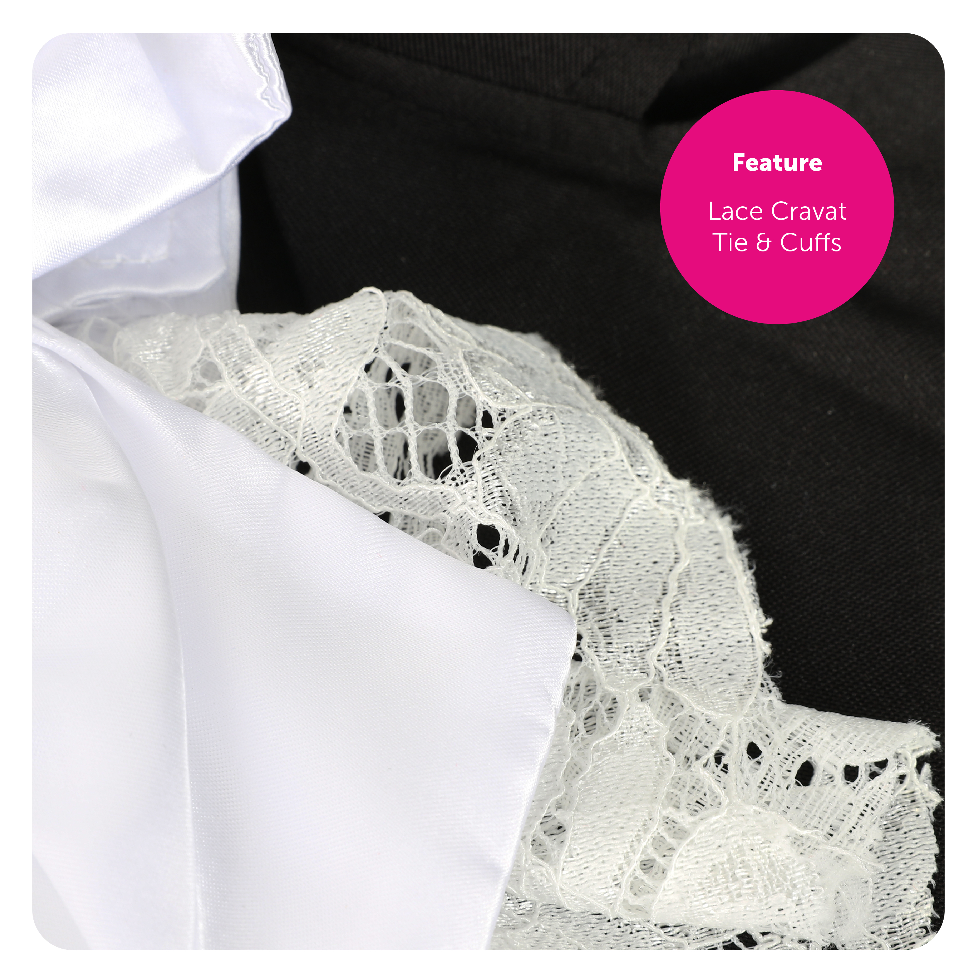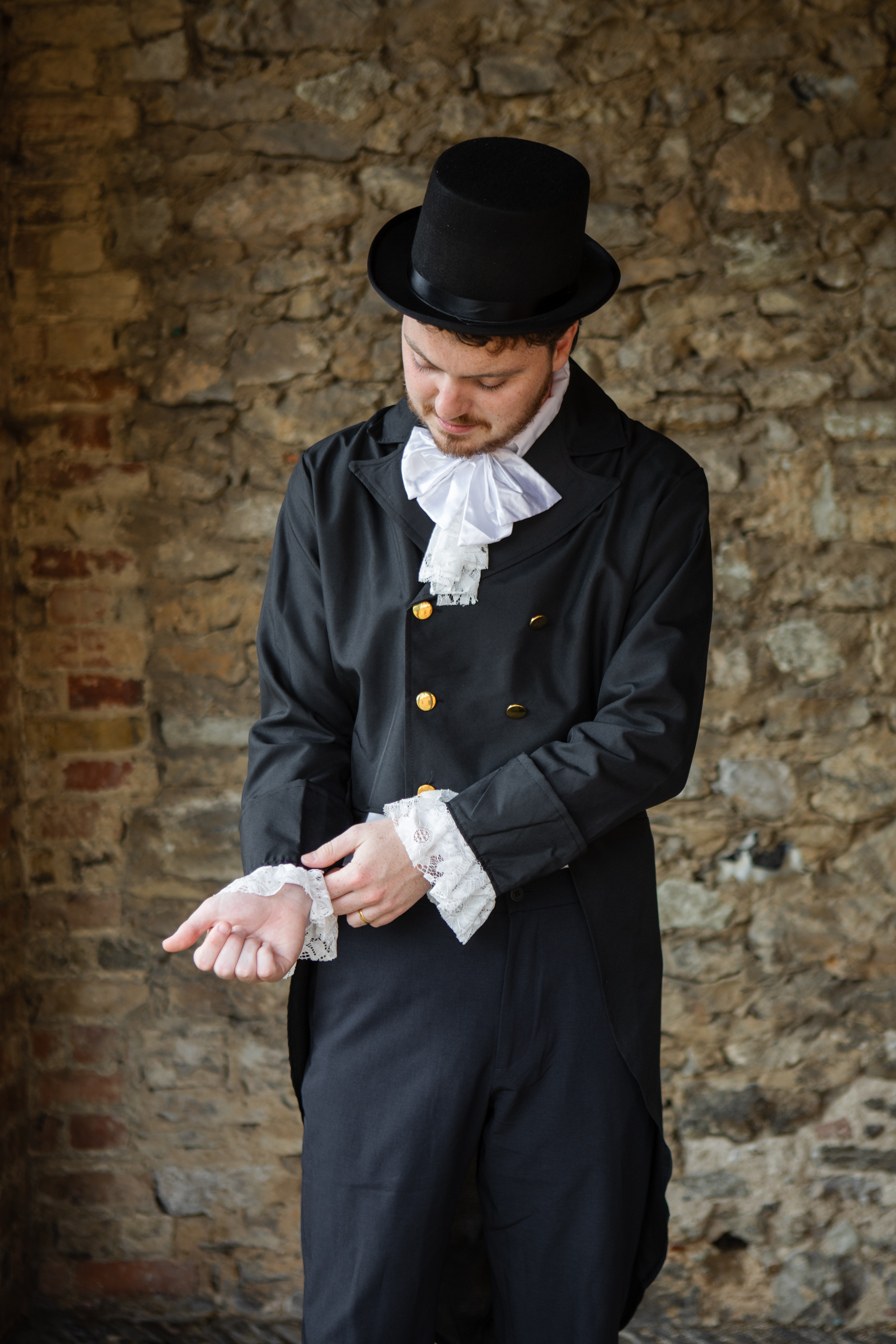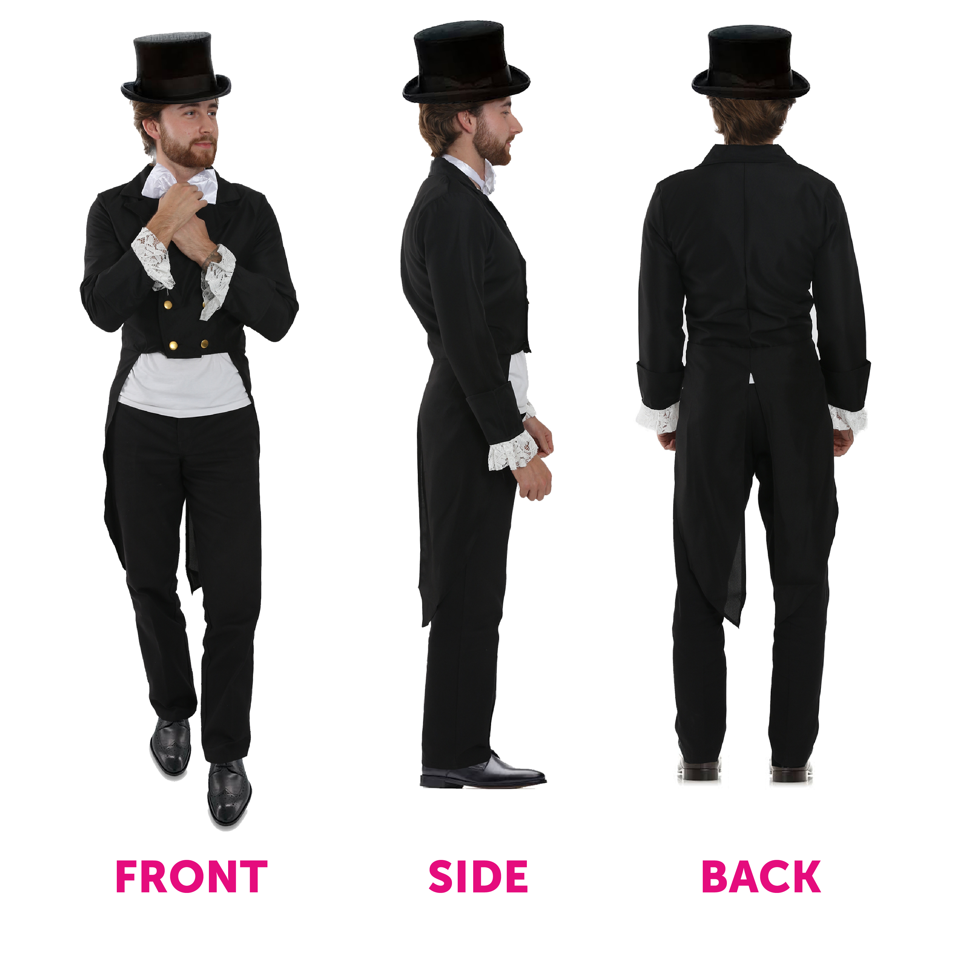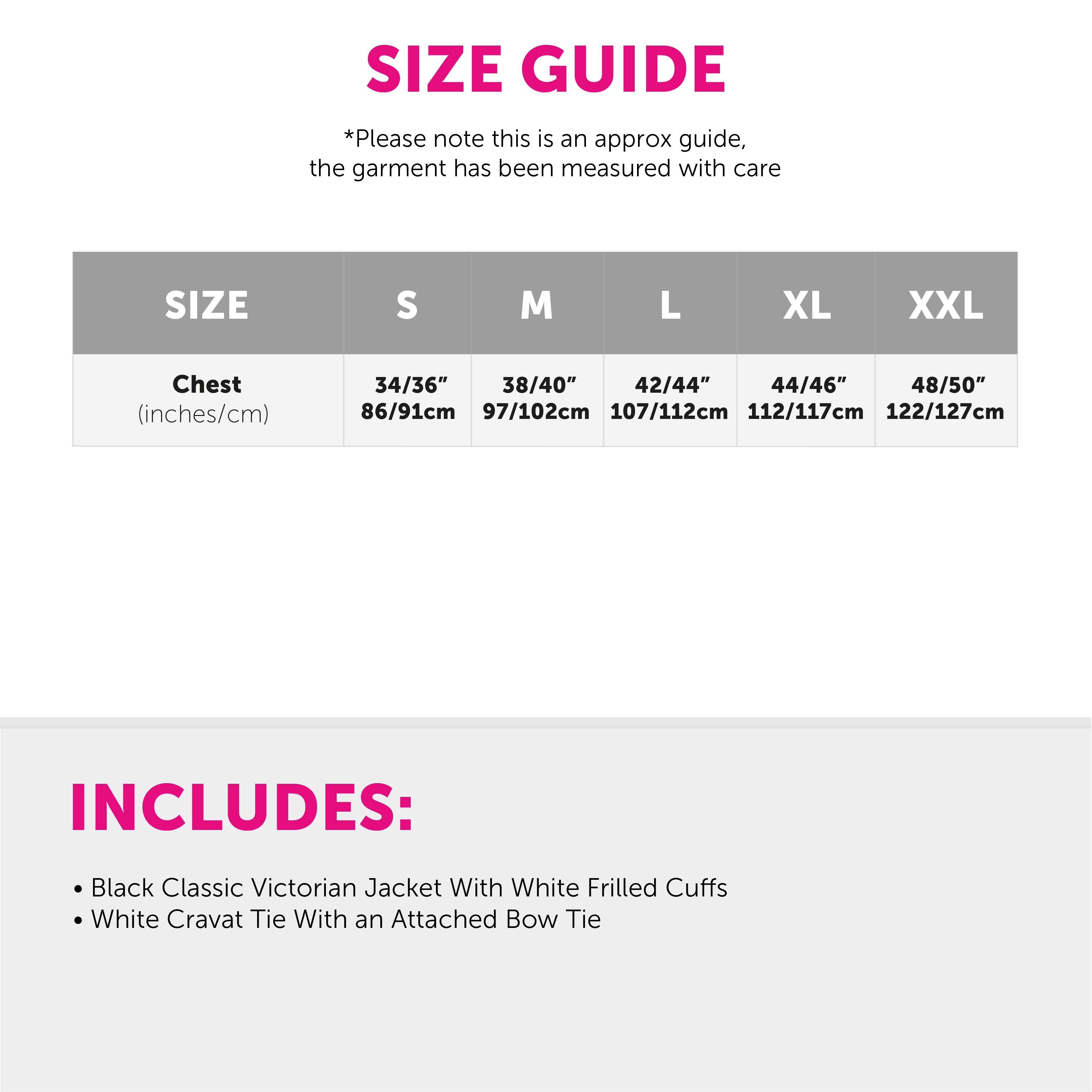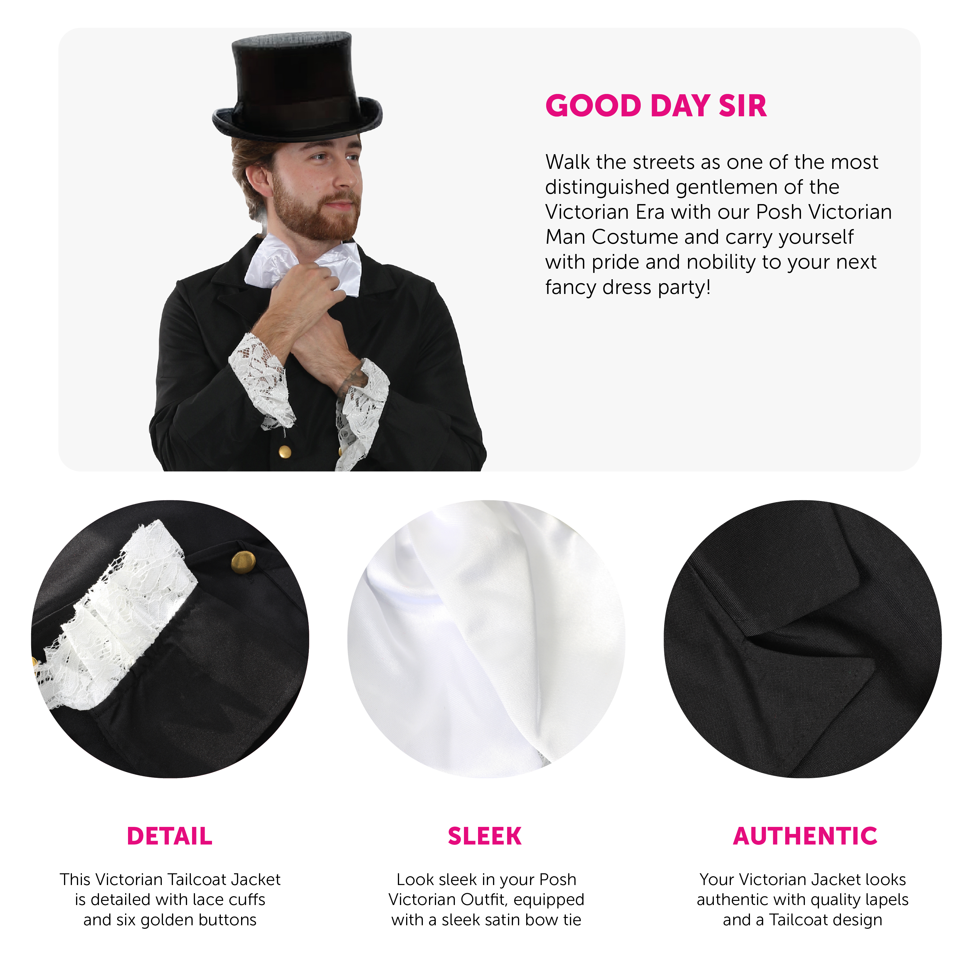 - POSH VICTORIAN MAN COSTUME DETAILS: Your Posh Victorian Man Costume includes a Black Classic Victorian Jacket with White Frilled Cuffs and a White Cravat tie with an attached Bowtie to complete the look!