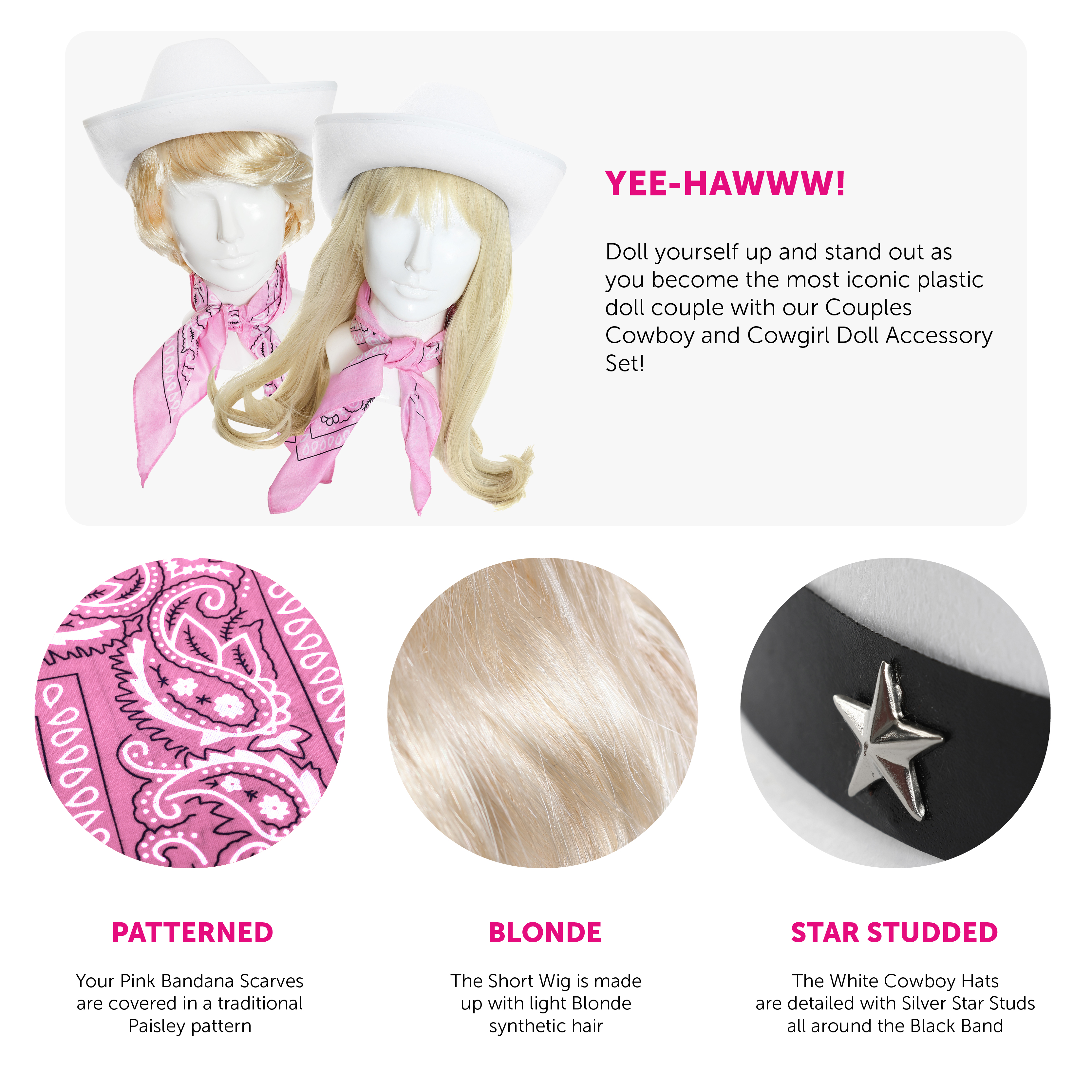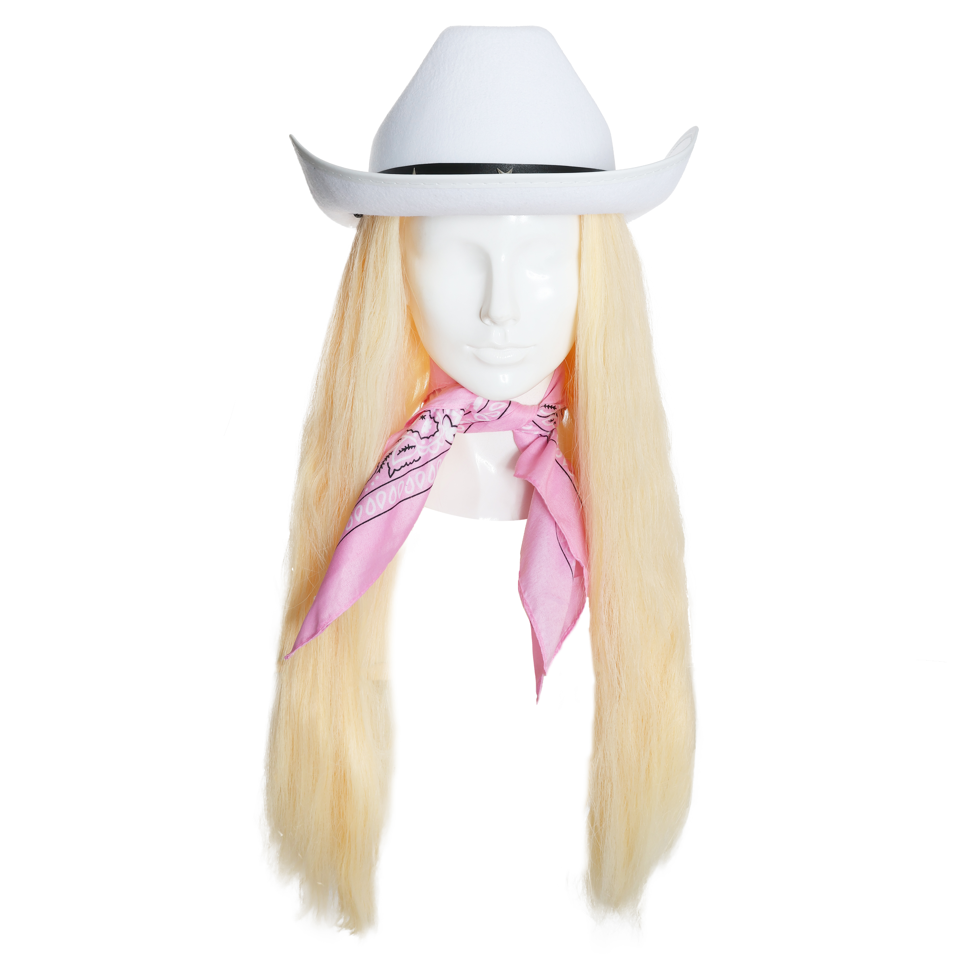 COWGIRL DOLL ACCESSORY SET: Doll yourself up and stand out as you become the most iconic doll with our Ladies Cowgirl Doll Accessory Set with a White Studded Cowgirl Hat, Long Blonde Wig and Pink Paisley Bandana!